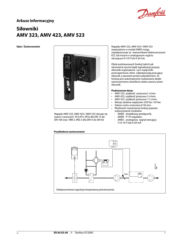 Arkusz Informacyjny Siłowniki AMV 323, AMV 423, AMV 523 Opis / Zastosowanie Napędy AMV 323, AMV 423 i AMV 523 wyposażone w moduł AMES mogą współpracować ze sterownikami elektronicznymi ECL lub innymi o analogowym wyjściu sterującym 0-10 V lub 0-20 mA. Obok podstawowych funkcji takich jak sterowanie ręczne bądź sygnalizacja pozycji, siłowniki wyposażone są w wyłączniki przeciążeniowe, które zabezpieczają pracujący siłownik z zaworem przed uszkodzeniem. Ta funkcja jest automatycznie realizowana dzięki samoczynnemu określeniu skoku zaworu przez siłownik. Napędy AMV 323, AMV 423 i AMV 523 stosuje się razem z zaworami VF2,VF3, VFS2 dla DN 15 do DN 100 oraz VRB 3, VRG 3 dla DN15 do DN 50. Podstawowe dane: • AMV 323, szybkość przesuwu1 s/mm. • AMV 423, szybkość przesuwu 3 s/mm. • AMV 523, szybkość przesuwu 11 s/mm. • Wersje zasilane napięciem 230 Vac i 24 Vac • Zakres ruchu wrzeciona 0-50 mm. • Możliwość rozszerzenia funkcji poprzez wykorzystanie modułów: - AMEK - dodatkowy przełącznik, - AMER - P i PI regulator, - AMES - analogowy sygnał sterujący Y=0-10 V lub 0-20 mA Przykładowe zastosowania Stałoprocentowa regulacja temperatury pomieszczenia SIBC ED.95.K5.49 © Danfoss 07/2005 1 Arkusz Informacyjny Siłowniki AMV 323, AMV 423, AMV 523 Zamawianie Siłownik Typ Nr kat. Napięcie zasilania Szybkość przesuwu Siła 24 V ~ 230 V ~ 24 V ~ 230 V ~ 24 V ~ 230 V ~ 1 s/mm 1 s/mm 3 s/mm 3 s/mm 11 s/mm 11 s/mm 600 N 600 N 1.200 N 1.200 N 1.200 N 1.200 N 082G3320 082G3321 082G3420 082G3421 082G3520 082G3521 Potencjometr 2 × przełącznik Regulator analogowy Y = 0 - 10 V (0 - 20 mA) Nr. kat. 082B3301 082B3328 082B3329 082B3318 082B3319 AMV 323 AMV 323 AMV 423 AMV 423 AMV 523 AMV 523 Moduły do wbudowania Typ AMEK AMES AMES AMER AMER Napięcie zasilania 24 V, 230 V ~ 24 V ~ 230 V ~ 24 V ~ 230 V ~ P lub PI sterownik Uwaga: Więcej informacji zawiera oddzielny arkusz informacyjny. Dane techniczne Zasilanie Częstotliwość Zużycie energii Sygnał sterujący Siła Maks. skok Szybkość Stopień ochrony Przewody Temperatura otoczenia Temp. przech. i transportu Ciężar - Znak zgodności z normami 24V~ ± 10% 230/240 V~ +6%/–10% 50 Hz/60 Hz 24V~: 12 VA 230/240 V~: 12VA 3-punktowy (0 - 10V z AMES) AMV 323: 600 N AMV 423: 1.200 N AMV 523: 1.200 N 0 - 50 mm AMV 323: 1 s/mm (50 Hz); 0.85 s/mm (60 Hz) AMV 423: 3 s/mm (50 Hz); 2.55 s/mm (60 Hz) AMV 523: 11 s/mm (50 Hz); 9.25 s/mm (60 Hz) IP 55 2 Pg 9, 2 Pg 13.5 Min. –15 °C, max. 50 °C Min. –40 °C, max. 70 °C 3.3 kg Wytyczne EMC 89/336/EEC, 92/31/EEC, 93/68/EEC, EN 50081-1 i EN 50082-1 Wytyczne Niskich Napięć 73/23/EEC i 93/68/EEC, EN 60730/2/14 Podłączenia elektryczne 2 ED.95.K5.49 © Danfoss 07/2005 SIBC Arkusz Informacyjny Siłowniki AMV 323, AMV 423, AMV 523 Montaż Wymiary MO630.1.1 DANFOSS Kombinacje zawór – siłownik AMV + VRB/VRG DN 15 - 50 mm SIBC ED.95.K5.49 © AMV + VF2, DN 65 - 100 mm AMV + VF3, DN 15 - 100 mm Danfoss 07/2005 AMV + VFS 2 DN 15 - 100 mm 3 Arkusz Informacyjny Siłowniki AMV 323, AMV 423, AMV 523 Danfoss nie ponosi odpowiedzialności za możliwe błędy drukarskie w katalogach, broszurach i innych materiałach drukowanych. Dane techniczne zawarte w broszurze mogą ulec zmianie bez wcześniejszego uprzedzenia, jako efekt stałych ulepszeń i modyfikacji naszych urządzeń. Wszystkie znaki towarowe w tym materiale są własnością odpowiednich spółek. Nazwa Danfoss, logotyp Danfoss są znakami towarowymi Danfoss A/S. Wszelkie prawa zastrzeżone Danfoss LPM Sp. z o.o. Tuchom 147 80-209 Chwaszczyno tel. (48 58) 512 91 00 fax: (48 58) 512 91 05 e-mail: [email protected] http://www.danfoss.pl 4 ED.95.K5.49 © Danfoss 07/2005 SIBC