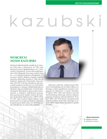 INSTYTUT RADIOELEKTRONIKI kazubski WOJCIECH ADAM KAZUBSKI Wojciech Adam Kazubski urodzi³ siê 21 stycznia 1964 roku w Warszawie. W 1981 roku ukoñczy³ Liceum Ogólnokszta³c¹ce im. T. Koœciuszki w Pruszkowie. W tym roku zosta³ laureatem XXX Olimpiady Fizycznej i zaj¹³ II miejsce w XI Miêdzynarodowej Olimpiadzie Fizycznej w Warnie, Bu³garia. Dyplom magistra in¿yniera elektronika uzyska³ w 1986 roku na Wydziale Elektroniki Politechniki Warszawskiej. Od 1987 roku by³ zatrudniony jako pracownik naukowo-techniczny (na stanowisku konstruktora) w Instytucie Radioelektroniki na Wydziale (obecnie) Elektroniki i Technik Informacyjnych. Bra³ udzia³ w opracowaniu wytwarzanych w instytucie unikatowych przyrz¹dów pomiarowych miêdzy innymi dla Instytutu Technologii Elektronowej i NPCP CEMI. W 1997 roku uzyska³ stopieñ doktora nauk technicznych za rozprawê Badanie w³aœciwoœci termicznych diod Gunna. W 1997 roku zosta³ zatrudniony na stanowisku adiunkta. G³ównym zakresem zainteresowañ Wojciecha Kazubskiego jest technika odbioru radiowego, a tak¿e zagadnienia zwi¹zane z propagacj¹ fal radiowych w terenie otwartym. W latach 1999 –2001 bra³ udzia³ w pracach nad konstrukcj¹ radiowego systemu wspomagaj¹cego orientacjê osób niewidomych. W latach 2009 –2011 bra³ udzia³ w przygotowaniu eksperymentalnej emisji radia cyfrowego w systemie DRM (Digital Radio Mondiale) w paœmie 26 MHz. Słowa kluczowe n radiokomunikacja n radiofonia cyfrowa