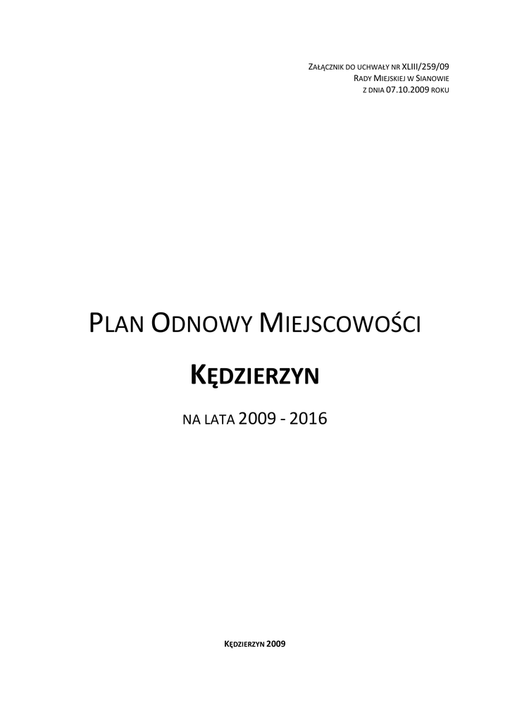 ZAŁĄCZNIK DO UCHWAŁY NR XLIII/259/09 RADY MIEJSKIEJ W SIANOWIE Z DNIA 07.10.2009 ROKU PLAN ODNOWY MIEJSCOWOŚCI KĘDZIERZYN NA LATA 2009 - 2016 KĘDZIERZYN 2009 Plan Odnowy Miejscowości Kędzierzyn na lata 2009 - 2016 SPIS TREŚCI I II III IV V VI VII VIII IX X Wstęp……………………………………………………………………………………………………………………....... Charakterystyka miejscowości…………………………………………………………………………………….. 1. Rys historyczny……………………………………………………………………………………………………………. 2. Położenie i powierzchnia …………………………………………………………………………………………….. 3. Ludność……………………………………………………………………………………………………………………….. 4. Środowisko naturalne………………………………………………………………………………………………….. 5. Środowisko kulturowe, zabytki……………………………………………………………………………………. 6. Stan infrastruktury społecznej…………………………………………………………………………………….. 7. Gospodarka…………………………………………………………………………………………………………………. 8. Infrastruktura techniczna ……………………………………………………………………………………………. Ocena zasobów sołectwa ……………………………………………………………………………………………… Diagnoza aktualnej sytuacji – jacy jesteśmy…………………………………………………………………… Analiza SWOT………………………………………………………………………………………………………………… Wizja rozwoju miejscowości …………………………………………………………………………………………. Planowane kierunki rozwoju…………………………………………………………………………………………. Harmonogram wdrażania planu……………………………………………………………………………………. Materiały źródłowe ………………………………………………………………………………………………………. Opracowanie Planu Odnowy Miejscowości …………………………………………………………………… 3 5 5 5 5 6 6 7 8 8 10 11 12 14 14 15 21 21 Plan powstał dzięki dotacji z Ministerstwa Pracy i Polityki Społecznej, w ramach Programu Operacyjnego Fundusz Inicjatyw Obywatelskich 2 Plan Odnowy Miejscowości Kędzierzyn na lata 2009 - 2016 I. Wstęp Plan Odnowy Miejscowości jest jednym z najważniejszych elementów odnowy wsi, jej rozwoju oraz poprawy warunków pracy i życia mieszkańców. Sporządzenie i uchwalenie takiego dokumentu stanowi niezbędny warunek przy aplikowaniu o środki finansowe w ramach „Programu Rozwoju Obszarów Wiejskich 2007-2013” , zwłaszcza działanie „Odnowa i rozwój wsi”. Celem działania „Odnowa i rozwój wsi” jest poprawa jakości życia na obszarach wiejskich poprzez zaspokojenie potrzeb społecznych i kulturalnych mieszkańców wsi oraz promowanie obszarów wiejskich. Działanie umożliwi rozwój tożsamości społeczności wiejskiej, zachowanie dziedzictwa kulturowego i specyfiki obszarów wiejskich oraz wpłynie na wzrost ich atrakcyjności turystycznej i inwestycyjnej. W ramach działania pomocą finansową zostaną objęte projekty dotyczące: 1) budowy, przebudowy, remontu lub wyposażenia obiektów: a) pełniących funkcje publiczne, społeczno-kulturalne, rekreacyjne i sportowe, b) służących promocji obszarów wiejskich, w tym propagowaniu i zachowaniu dziedzictwa historycznego, tradycji, sztuki oraz kultury, 2) kształtowania obszaru przestrzeni publicznej; 3) budowy remontu lub przebudowy infrastruktury związanej z rozwojem funkcji turystycznych, sportowych lub społeczno-kulturalnych; 4) zakupu obiektów charakterystycznych dla tradycji budownictwa w danym regionie, w tym budynków będących zabytkami, z przeznaczeniem na cele publiczne; 5) odnawiania, eksponowania lub konserwacji lokalnych pomników historycznych, budynków będących zabytkami lub miejsc pamięci; 6) kultywowania tradycji społeczności lokalnej oraz tradycyjnych zawodów. Niniejsze opracowanie zawiera charakterystykę miejscowości, inwentaryzację zasobów służącą ujęciu stanu rzeczywistego, analizę SWOT, czyli mocne i słabe strony miejscowości, planowane kierunki rozwoju, przedsięwzięcia wraz z szacunkowym kosztorysem i harmonogramem działań. Plan Odnowy jest planem otwartym stwarzającym możliwość aktualizacji w zależności od potrzeb społecznych i uwarunkowań finansowych. Oznacza to, że mogą być dopisywane nowe zadania, a także to, że może zmienić się kolejność ich realizacji w zależności od uruchomienia i dostępu do funduszy UE. Uwarunkowania Planu Odnowy Miejscowości polegają na tym, że Plan powstał dzięki dotacji z Ministerstwa Pracy i Polityki Społecznej, w ramach Programu Operacyjnego Fundusz Inicjatyw Obywatelskich 3 Plan Odnowy Miejscowości Kędzierzyn na lata 2009 - 2016 ma on zdecentralizowany, lokalny charakter, obejmuje ograniczony teren jednej miejscowości. Specyfika planu polega również na tym, że jest on ukierunkowany na zagadnienia kulturowe, koncentruje się na prostych, lokalnych przedsięwzięciach, które prowadzić mają do poprawy standardu i jakości życia mieszkańców. Ma on charakter społeczny, dzięki temu może stanowić doskonałe uzupełnienie strategii rozwoju całej gminy, która zazwyczaj koncentruje się na zagadnieniach infra