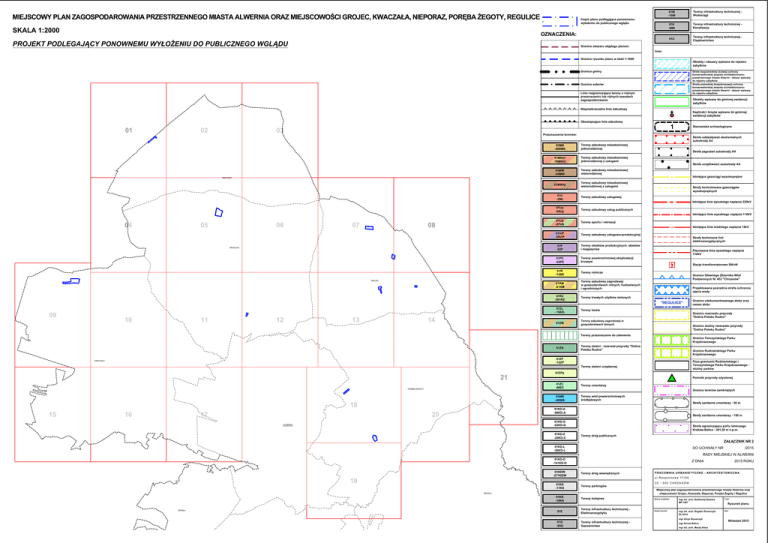 SKALA 1:2000 01W -15W Tereny infrastruktury technicznej - 01K -09K Tereny infrastruktury technicznej Kanalizacja OZNACZENIA: Tereny infrastruktury technicznej - 01C Inne: Granice rysunku planu w skali 1:1000 Obiekty i obszary wpisane do rejestru Granice gminy przestrzennego miasta Alwerni - obszar wpisany przestrzennego miasta Alwerni - obszar wpisany Obiekty wpisane do gminnej ewidencji zagospodarowania Nieprzekraczalne linie zabudowy 01 02 1 03 Stanowiska archeologiczne autostrady A4 01MN -406MN Tereny zabudowy mieszkaniowej jednorodzinnej 01MN/U -76MN/U Tereny zabudowy mieszkaniowej 01MW -04MW Tereny zabudowy mieszkaniowej wielorodzinnej NIEPORAZ 01MW/U Tereny zabudowy mieszkaniowej 01U -59U 01Up -05Up 04 05 06 07 01US -07US 08 Tereny sportu i rekreacji 01U/P -30U/P Strefy techniczne linii elektroenergetycznych 01P -02P REGULICE 110kV 01PE -02PE Tereny powierzchniowej eksploatacji kruszyw 01R -139R Tereny rolnicze 01RM -61RM Tereny zabudowy zagrodowej w gospodarstwach rolnych, hodowlanych i ogrodniczych GROJEC Stacje transformatorowe SN/nN 01RZ -301RZ 09 "REGULICE" 01ZL - 168ZL 10 11 12 13 14 01ZM Granice rezerwatu przyrody "Dolina Potoku Rudno" Tereny zabudowy zagrodowej w Granice otuliny rezerwatu przyrody "Dolina Potoku Rudno" Tereny przeznaczone do zalesienia Krajobrazowego 01ZN Tereny zieleni - rezerwat przyrody "Dolina Potoku Rudno" Krajobrazowego 01ZP -12ZP 01ZPp 21 01ZC -06ZC Tereny cmentarzy 01WS -82WS 18 15 16 17 20 Strefy sanitarne cmentarzy - 50 m 01KD-A -06KD-A Strefy sanitarne cmentarzy - 150 m 01KD-G -03KD-G ALWERNIA 01KD-Z -20KD-Z 01KD-L -26KD-L /2015 RADY MIEJSKIEJ W ALWERNI 01KD-D -141KD-D Z DNIA 2015 ROKU 01KDW -277KDW 19 01KS -11KS 01KK -19KK 01E 01G -05G Miejscowy plan zagospodarowania przestrzennego miasta Alwernia oraz Tereny kolejowe MP-1867 Tereny infrastruktury technicznej Elektroenergetyka Tereny infrastruktury technicznej Gazownictwo Rysunek planu Data: SL-0514 mgr Dorota Bakun