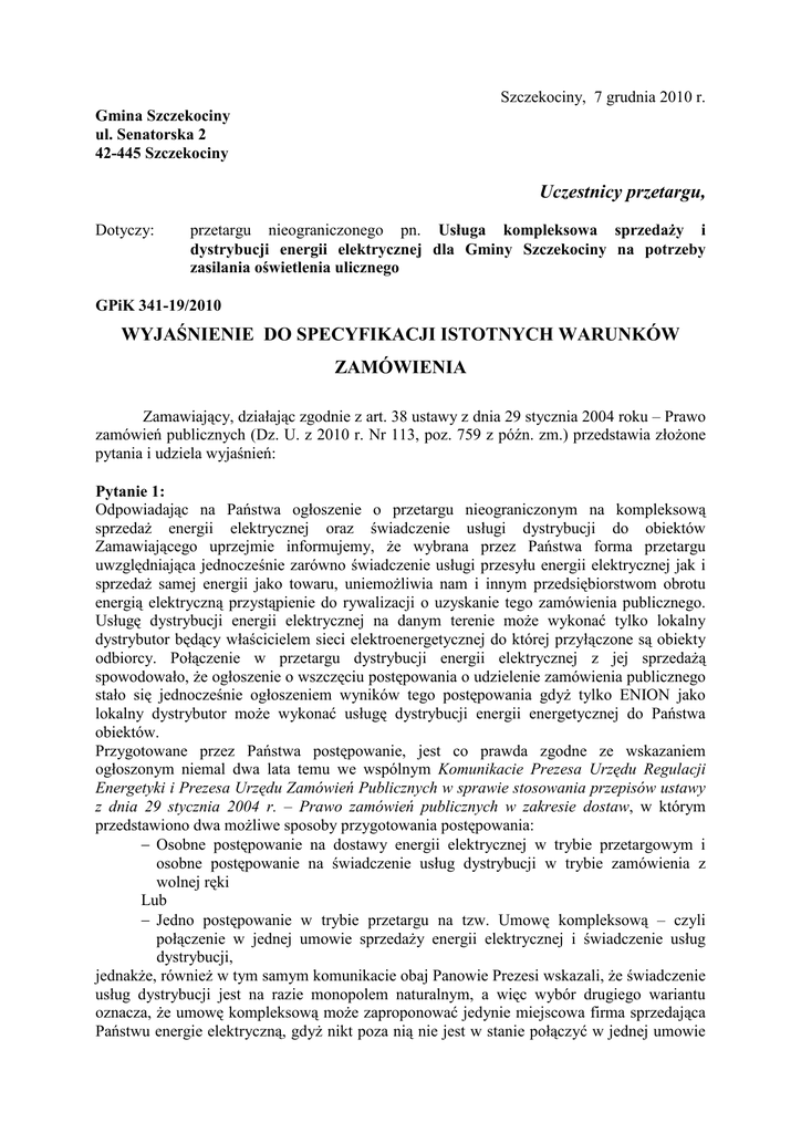 Szczekociny, 7 grudnia 2010 r. Gmina Szczekociny ul. Senatorska 2 42-445 Szczekociny Uczestnicy przetargu, Dotyczy: przetargu nieograniczonego pn. Usługa kompleksowa sprzedaŜy i dystrybucji energii elektrycznej dla Gminy Szczekociny na potrzeby zasilania oświetlenia ulicznego GPiK 341-19/2010 WYJAŚNIENIE DO SPECYFIKACJI ISTOTNYCH WARUNKÓW ZAMÓWIENIA Zamawiający, działając zgodnie z art. 38 ustawy z dnia 29 stycznia 2004 roku – Prawo zamówień publicznych (Dz. U. z 2010 r. Nr 113, poz. 759 z późn. zm.) przedstawia złoŜone pytania i udziela wyjaśnień: Pytanie 1: Odpowiadając na Państwa ogłoszenie o przetargu nieograniczonym na kompleksową sprzedaŜ energii elektrycznej oraz świadczenie usługi dystrybucji do obiektów Zamawiającego uprzejmie informujemy, Ŝe wybrana przez Państwa forma przetargu uwzględniająca jednocześnie zarówno świadczenie usługi przesyłu energii elektrycznej jak i sprzedaŜ samej energii jako towaru, uniemoŜliwia nam i innym przedsiębiorstwom obrotu energią elektryczną przystąpienie do rywalizacji o uzyskanie tego zamówienia publicznego. Usługę dystrybucji energii elektrycznej na danym terenie moŜe wykonać tylko lokalny dystrybutor będący właścicielem sieci elektroenergetycznej do której przyłączone są obiekty odbiorcy. Połączenie w przetargu dystrybucji energii elektrycznej z jej sprzedaŜą spowodowało, Ŝe ogłoszenie o wszczęciu postępowania o udzielenie zamówienia publicznego stało się jednocześnie ogłoszeniem wyników tego postępowania gdyŜ tylko ENION jako lokalny dystrybutor moŜe wykonać usługę dystrybucji energii energetycznej do Państwa obiektów. Przygotowane przez Państwa postępowanie, jest co prawda zgodne ze wskazaniem ogłoszonym niemal dwa lata temu we wspólnym Komunikacie Prezesa Urzędu Regulacji Energetyki i Prezesa Urzędu Zamówień Publicznych w sprawie stosowania przepisów ustawy z dnia 29 stycznia 2004 r. – Prawo zamówień publicznych w zakresie dostaw, w którym przedstawiono dwa moŜliwe sposoby przygotowania postępowania: − Osobne postępowanie na dostawy energii elektrycznej w trybie przetargowym i osobne postępowanie na świadczenie usług dystrybucji w trybie zamówienia z wolnej ręki Lub − Jedno postępowanie w trybie przetargu na tzw. Umowę kompleksową – czyli połączenie w jednej umowie sprzedaŜy energii elektrycznej i świadczenie usług dystrybucji, jednakŜe, równieŜ w tym samym komunikacie obaj Panowie Prezesi wskazali, Ŝe świadczenie usług dystrybucji jest na razie monopolem naturalnym, a więc wybór drugiego wariantu oznacza, Ŝe umowę kompleksową moŜe zaproponować jedynie miejscowa firma sprzedająca Państwu energie elektryczną, gdyŜ nikt poza nią nie jest w stanie połączyć w jednej umowie sprzedaŜy energii elektrycznej oraz dystrybucji energii elektrycznej – Prawo energetyczne mówi w art. 5 ust. 3 bardzo wyraźnie, Ŝe umowa kompleksowa, to umowa która zawiera jednocześnie postanowienia umowy sprzedaŜy i umowy o świadczenie usług dystrybucji. Sprzedawcy energii inni niŜ podana spółka z koncernu ENION, nie mogą zatem złoŜyć oferty w tak ogłoszonym przetargu, bo nie świadczą usług dystrybucji na terenie obsługiwanym przez ENION. Reasumując – wybrany przez Państwa wariant przetargu na umowę kompleksową, doprowadzi do pojawienia się tylko jednej oferty, którą moŜe złoŜyć tylko ENION. Sugerujemy, abyście Państwo, wzorem innych zamawiających w Polsce, zdecydowali się na postępowanie według pierwszego wariantu zaproponowanego we wspólnym Komunikacie… czyli ogłoszenie postępowania tylko na zakup energii elektrycznej, a potem przeprowadzenia postępowania w trybie zamówienia z wolnej ręki na usługi dystrybucji. Takie rozwiązanie jest obecnie sugerowane przez Prezesa Urzędu Regulacji Energetyki jako jedyne, które prowadzi do pojawienia się konkurencyjnych ofert. Mówi o tym komunikat, który znajdziecie Państwo pod adresem: http://www.ure.gov.pl/portal/pl/424/3219/Prezes_URE_wspiera_odbiorcow_instytucjonalnyc h_i_promuje_zakupy_energii_elektryc.html MoŜliwe jest tez inne rozwiązanie – proponujemy wprowadzić moŜliwość składanie ofert częściowej (rozbijając przetarg na dwa zadania: sprzedaŜ energii elektrycznej oraz świadczenie usług dystrybucji). Wymagałoby to tylko niewielkiej korekty zapisów samego SIWZ oraz poprawienia formularzy ofertowych. W takim przypadku – chyba najbardziej rozsądnym – uzyskacie Państwo następujące efekty: w zadaniu dotyczącym sprzedaŜy energii elektrycznej zgłosi się na pewno wielu wykonawców (z naszych doświadczeń i obserwacji innych tego typu przetargów w Polsce wynika, Ŝe jest to przynajmniej 3-4 wykonawców, a uzyskane ceny są na poziomie 20-30% niŜszym niŜ aktualnie płacone), natomiast do części dystrybucyjnej zgłosi się tylko ENION (bo nikt inny nie moŜe). Zachowując w przedmiocie przetargu formę umowy kompleksowej, uzyskacie Państwo jedynie ofertę ENION, zapewne ze stawkami cenowymi aktualnie płaconymi. Odpowiedź: Zamawiający nie przewiduje zmiany treści ogłoszenia i zmiany SIWZ. Zamówienie zostało ogłoszone zgodnie z ustawą z dnia 29 stycznia 2004 r. Prawo zamówień publicznych (Dz. U. z 2010 r. Nr 113, poz. 759 z późn. zm.). Przepisy nie zabraniają ogłaszania postępowań na kompleksową dostawę energii elektrycznej. Zamawiający moŜe w trybie art. 6 ust. 1 ustawy Pzp udzielić przedsiębiorstwu obrotu zamówienia publicznego na usługę kompleksową w rozumieniu art. 3 ust. 30 ustawy Prawo energetyczne (Dz. U. z 2006 r. Nr 89, poz. 625 z późn. zm.), realizowaną na podstawie umowy kompleksowej, o której mowa w art. 5 ust. 3 tej ustawy. Niniejsze wyjaśnienie stanowi integralną część specyfikacji istotnych warunków zamówienia. mgr inŜ. Stanisław Wójcik Burmistrz Miasta i Gminy Szczekociny