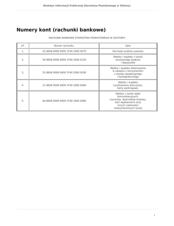 Biuletyn Informacji Publicznej Starostwa Powiatowego w Złotoryi Numery kont (rachunki bankowe) RACHUNKI BANKOWE STAROSTWA POWIATOWEGO W ZŁOTORYI LP. Numer rachunku Opis 1. 42 8658 0009 0000 3740 2000 0070 Dochody budżetu powiatu 2. 50 8658 0009 0000 3740 2000 0120 Wpłaty i wypłaty z tytułu wnoszonego wadium i depozytów 3. 55 8658 0009 0000 3740 2000 0030 Wpłaty i wypłaty dokonywane w związku z korzystaniem z zasobu geodezyjnego i kartograficznego 4. 21 8658 0009 0000 3740 2000 0060 Wpłaty i wypłaty (użytkowanie wieczyste), karty parkingowe. 84 8658 0009 0000 3740 2000 0090 Wpłaty z tytułu opłat komunikacyjnych, czynszów, dzienników budowy, kart wędkarskich oraz innych należności niewymienionych wyżej 5. 1