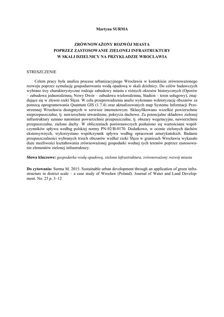 Martyna SURMA ZRÓWNOWAŻONY ROZWÓJ MIASTA POPRZEZ ZASTOSOWANIE ZIELONEJ INFRASTRUKTURY W SKALI DZIELNICY NA PRZYKŁADZIE WROCŁAWIA STRESZCZENIE Celem pracy była analiza procesu urbanizacyjnego Wrocławia w kontekście zrównoważonego rozwoju poprzez symulację gospodarowania wodą opadową w skali dzielnicy. Do celów badawczych wybrano trzy charakterystyczne rodzaje zabudowy miasta z różnych okresów historycznych (Oporów – zabudowa jednorodzinna, Nowy Dwór – zabudowa wielorodzinna, Stadion – teren usługowy), znajdujące się w zlewni rzeki Ślęza. W celu przeprowadzenia analiz wykonano wektoryzację obszarów za pomocą oprogramowania Quantum GIS (1.7.4) oraz aktualizowanych map Systemu Informacji Przestrzennej Wrocławia dostępnych w serwisie internetowym. Sklasyfikowano wszelkie powierzchnie nieprzepuszczalne, tj. nawierzchnie utwardzone, pokrycia dachowe. Za potencjalne składowe zielonej infrastruktury uznano natomiast powierzchnie przepuszczalne, tj. obszary wegetacyjne, nawierzchnie przepuszczalne, zielone dachy. W obliczeniach porównawczych posłużono się wartościami współczynników spływu według polskiej normy PN-92/B-0170. Dodatkowo, w ocenie zielonych dachów ekstensywnych, wykorzystano współczynnik spływu według opracowań amerykańskich. Badanie przepuszczalności wybranych trzech obszarów wzdłuż rzeki Ślęza w granicach Wrocławia wykazało duże możliwości kształtowania zrównoważonej gospodarki wodnej tych terenów poprzez zastosowanie elementów zielonej infrastruktury. Słowa kluczowe: gospodarka wodą opadową, zielona infrastruktura, zrównoważony rozwój miasta Do cytowania: Surma M. 2015. Sustainable urban development through an application of green infrastructure in district scale – a case study of Wrocław (Poland). Journal of Water and Land Development. No. 25 p. 3–12