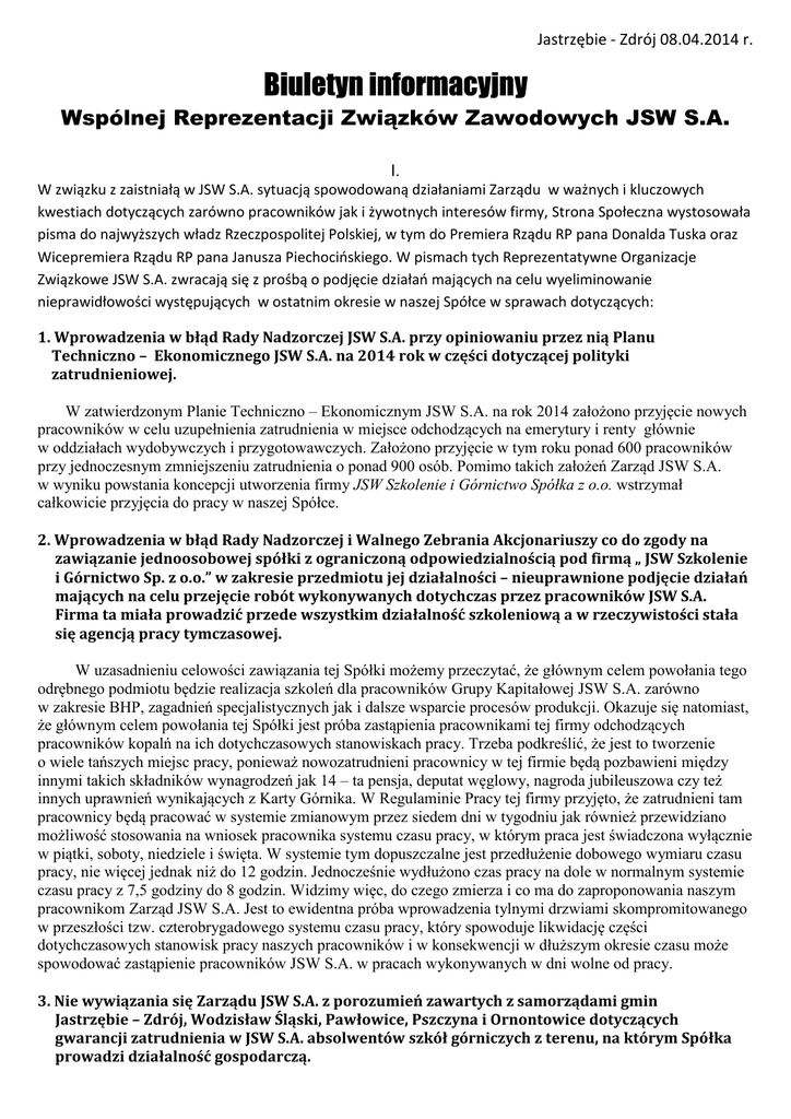 Jastrzębie - Zdrój 08.04.2014 r. Biuletyn informacyjny Wspólnej Reprezentacji Związków Zawodowych JSW S.A. I. W związku z zaistniałą w JSW S.A. sytuacją spowodowaną działaniami Zarządu w ważnych i kluczowych kwestiach dotyczących zarówno pracowników jak i żywotnych interesów firmy, Strona Społeczna wystosowała pisma do najwyższych władz Rzeczpospolitej Polskiej, w tym do Premiera Rządu RP pana Donalda Tuska oraz Wicepremiera Rządu RP pana Janusza Piechocińskiego. W pismach tych Reprezentatywne Organizacje Związkowe JSW S.A. zwracają się z prośbą o podjęcie działań mających na celu wyeliminowanie nieprawidłowości występujących w ostatnim okresie w naszej Spółce w sprawach dotyczących: 1. Wprowadzenia w błąd Rady Nadzorczej JSW S.A. przy opiniowaniu przez nią Planu Techniczno – Ekonomicznego JSW S.A. na 2014 rok w części dotyczącej polityki zatrudnieniowej. W zatwierdzonym Planie Techniczno – Ekonomicznym JSW S.A. na rok 2014 założono przyjęcie nowych pracowników w celu uzupełnienia zatrudnienia w miejsce odchodzących na emerytury i renty głównie w oddziałach wydobywczych i przygotowawczych. Założono przyjęcie w tym roku ponad 600 pracowników przy jednoczesnym zmniejszeniu zatrudnienia o ponad 900 osób. Pomimo takich założeń Zarząd JSW S.A. w wyniku powstania koncepcji utworzenia firmy JSW Szkolenie i Górnictwo Spółka z o.o. wstrzymał całkowicie przyjęcia do pracy w naszej Spółce. 2. Wprowadzenia w błąd Rady Nadzorczej i Walnego Zebrania Akcjonariuszy co do zgody na zawiązanie jednoosobowej spółki z ograniczoną odpowiedzialnością pod firmą „ JSW Szkolenie i Górnictwo Sp. z o.o.” w zakresie przedmiotu jej działalności – nieuprawnione podjęcie działań mających na celu przejęcie robót wykonywanych dotychczas przez pracowników JSW S.A. Firma ta miała prowadzić przede wszystkim działalność szkoleniową a w rzeczywistości stała się agencją pracy tymczasowej. W uzasadnieniu celowości zawiązania tej Spółki możemy przeczytać, że głównym celem powołania tego odrębnego podmiotu będzie realizacja szkoleń dla pracowników Grupy Kapitałowej JSW S.A. zarówno w zakresie BHP, zagadnień specjalistycznych jak i dalsze wsparcie procesów produkcji. Okazuje się natomiast, że głównym celem powołania tej Spółki jest próba zastąpienia pracownikami tej firmy odchodzących pracowników kopalń na ich dotychczasowych stanowiskach pracy. Trzeba podkreślić, że jest to tworzenie o wiele tańszych miejsc pracy, ponieważ nowozatrudnieni pracownicy w tej firmie będą pozbawieni między innymi takich składników wynagrodzeń jak 14 – ta pensja, deputat węglowy, nagroda jubileuszowa czy też innych uprawnień wynikających z Karty Górnika. W Regulaminie Pracy tej firmy przyjęto, że zatrudnieni tam pracownicy będą pracować w systemie zmianowym przez siedem dni w tygodniu jak również przewidziano możliwość stosowania na wniosek pracownika systemu czasu pracy, w którym praca jest świadczona wyłącznie w piątki, soboty, niedziele i święta. W systemie tym dopuszczalne jest przedłużenie dobowego wymiaru czasu pracy, nie więcej jednak niż do 12 godzin. Jednocześnie wydłużono czas pracy na dole w normalnym systemie czasu pracy z 7,5 godziny do 8 godzin. Widzimy więc, do czego zmierza i co ma do zaproponowania naszym pracownikom Zarząd JSW S.A. Jest to ewidentna próba wprowadzenia tylnymi drzwiami skompromitowanego w przeszłości tzw. czterobrygadowego systemu czasu pracy, który spowoduje likwidację części dotychczasowych stanowisk pracy naszych pracowników i w konsekwencji w dłuższym okresie czasu może spowodować zastąpienie pracowników JSW S.A. w pracach wykonywanych w dni wolne od pracy. 3. Nie wywiązania się Zarządu JSW S.A. z porozumień zawartych z samorządami gmin Jastrzębie – Zdrój, Wodzisław Śląski, Pawłowice, Pszczyna i Ornontowice dotyczących gwarancji zatrudnienia w JSW S.A. absolwentów szkół górniczych z terenu, na którym Spółka prowadzi działalność gospodarczą. W porozumieniach zawartych pomiędzy Zarządem JSW S.A. a przedstawicielami Samorządów Zarząd zobowiązał się do przyjęcia absolwentów do jednostek organizacyjnych JSW S.A. (kopalń) w ramach własnych potrzeb kadrowych na warunkach obowiązujących w naszej firmie. Jednakże wbrew wcześniejszym ustaleniom proponuje się tym absolwentom zatrudnienie w firmie zewnętrznej na dużo gorszych warunkach i to na okres próby (3 miesiące) a później na umowy na czas określony (pierwsza umowa na okres trzech lat). 4. Prowadzenia działań skutkujących pogorszeniem sytuacji finansowej pracowników JSW S.A. przy jednoczesnym wydawaniu olbrzymich kwot na wątpliwe firmy konsultingowe i doradcze, czego przykładem jest firma BCG, która przeprowadziła wśród pracowników nic nie wnoszącą w procesie zarządzania ankietę, za którą zapłacono około 1,5 miliona złotych. 5. Organizowania na koszt Grupy Kapitałowej JSW pseudoseminariów szeroko opisywanych w mediach, gdzie w programach na merytoryczną pracę przeznacza się kilkanaście minut, a resztę czasu na rozrywki i biesiadowanie, czego szczegóły są opisane w gazecie „Super Express” w artykule zatytułowanym „15 minut pracy, 2 dni zabawy”. Program tych „obrad” zorganizowanych w Wiśle w Hotelu Stok zamieszczony w tej gazecie wyglądał następująco: 21 MARCA SOBOTA 13.00 przyjazd gości 14.00 – 16.00 lunch 17.30 uroczyste przywitanie gości 17.45 prezentacja na temat dywizji koksowa JSW 18.00 koncert zespołu Red Box 19.30 uroczysta kolacja 21.00 muzyka na żywo kwartet Projekt Niebo 22 MARCA NIEDZIELA Śniadanie i wyjazd gości Przy tak pseudooszczędnych seminariach w Grupie Kapitałowej JSW w programie działań antykryzysowych jednej ze Spółek możemy przeczytać: „ograniczenie kosztów na spotkanie opłatkowe pracowników firmy”. Porównanie tych dwóch faktów mówi 