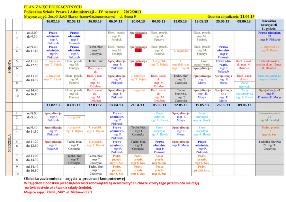 PLAN ZAJĘĆ EDUKACYJNYCH Policealna Szkoła Prawa i Administracji - IV semestr 2012/2013 Miejsce zajęć: Zespół Szkół Ekonomiczno-Gastronomicznych ul. Bema 9 SOBOTA 1. 2. od 8.00 do 9.30 3. 4. od 9.40 do 11.10 5. od 11.20 do 12.50 16.02.13 02.03.13 Prawo administr. mgr P. Piskozub Prawo administr. mgr P. Piskozub J. angielski mgr T. Bajrak Prawo administr. mgr P. Piskozub Prawo administr. mgr P. Piskozub Ekon. przeds. mgr M. Fendryk 6. 7. od 13.00 do 14.30 J. angielski mgr T. Bajrak 8. 9. NIEDZIELA 10. Ekon. przeds. mgr M. Fendryk Ekon. przeds. mgr M. Fendryk od 14.40 do 16.10 17.02.13 03.03.13 J. angielski 16.03.13 20.04.13 04.05.13 Ekon. przeds. mgr M. Fendryk Specjalizacja mgr Ekon. przeds. mgr M. Fendryk Techn. biur. mgr T. Czosnyka Ekon. przeds. mgr M. Fendryk Specjalizacja mgr Ekon. przeds. mgr M. Fendryk Techn. biur Specjalizacja mgr P. Piskozub Specjalizacja mgr Specjalizacja mgr P. Piskozub J. angielski mgr T. Bajrak Specjalizacja mgr P. Piskozub J. angielski 07.04.13 21.04.13 Rach. i anal. ek. Rach. i anal. ek. mgr M. Dziuban Rach. i anal. ek. mgr M. Dziuban 17.03.12 1. 2. od 8.00 do 9.30 Specjalizacja mgr P. Piskozub 3. 4. od 9.40 do 11.10 Specjalizacja mgr P. Piskozub J. angielski mgr T. Bajrak J. angielski mgr T. Bajrak 5. 6. od 11.20 do 12.50 Specjalizacja mgr P. Piskozub Techn. biur. mgr T. Czosnyka J. angielski mgr T. Bajrak 7. 8. od 13.00 do 14.30 9. od 14.40 do 16.10 Techn. biur. mgr T. Czosnyka . Techn. biur. mgr T. Czosnyka Techn. biur. mgr T. Czosnyka 10. Ostatnia aktualizacja 21.04.13 06.04.12 Prawo administr. mgr P. Piskozub Prawo administr. mgr P. Piskozub Prawo administr. mgr P. Piskozub Podst. przeds. mgr S. Sus Podst. przeds. mgr S. Sus 11.05.13 18.05.13 25.05.13 08.06.13 Ekon. przeds. mgr M. Fendryk Nazwiska nauczycieli L. godzin Prawo administr. 27 mgr P. Piskozub J. angielski Ekon. przeds mgr M. Fendryk J. angielski mgr T. Bajrak J. angielski+e.u. mgr T. Bajrak Ekon. przeds.+e.pis. Specjalizacja Rach. i anal. ek. mgr M. Dziuban Rach. i anal. ek. mgr M. Dziuban Techn. biur. mgr T. Czosnyka Specjalizacja mgr E. Morys Techn. biur.+e.u. mgr T. Czosnyka Specjalizacja mgr E. Morys Specjalizacja +e.u mgr E. Morys 05.05.13 12.05.13 19.05.13 26.05.13 Zarys statystyki mgr A. Banek Specjalizacja mgr E. Morys Zarys statystyki mgr A. Banek Ekonomika przeds. 23 mgr M. Fendryk Techn. biur. mgr T. Czosnyka Zarys statystyki mgr A. Banek Specjalizacja mgr E. Morys Zarys statystyki mgr A. Banek Podst. przeds. 18 mgr S. Sus Techn. biur. mgr T. Czosnyka Prawo administr. mgr P. Piskozub Podst. przeds. mgr S. Sus Podst. przeds. mgr S. Sus Specjalizacja mgr E. Morys Prawo administr. mgr P. Piskozub Podst. przeds. mgr S. Sus Podst. przeds.+e.u. Technika biurowa 23 mgr T. Czosnyka Podst. przeds. mgr S. Sus Podst. przeds. mgr S. Sus Okienka zaciemnione – zajęcia w pracowni komputerowej W zajęciach z podstaw przedsiębiorczości zobowiązani są uczestniczyć słuchacze którzy tego przedmiotu nie mają na świadectwie ukończenia szkoły średniej. Miejsce zajęć: CNIB „ŻAK” ul. Mickiewicza 1 Prawo administr. mgr P. Piskozub Prawo adm. +e.pis. mgr P. Piskozub Specjalizacja mgr E. Morys J. angielski 23 mgr T. Bajrak Rach. i anal. ek. mgr M. Dziuban Rachunkowość i analiza ekon. 15mgr M. Dziuban Rach. i anal. ek+e.u.. Zarys statystyki Zarys statystyki+e.u mgr A. Banek Zarys statystyki 13 mgr A. Banek Specjalizacja 41 mgr P. Piskozub/E. Morys 09.06.13