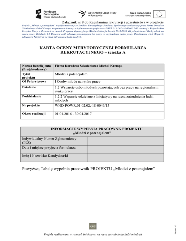 Załącznik nr 8 do Regulaminu rekrutacji i uczestnictwa w projekcie Projekt „Młodzi z potencjałem” współfinansowany ze środków Europejskiego Funduszu Społecznego realizowany przez Firmę Doradczo Szkoleniową Michał Krempa na podstawie Umowy o dofinansowanie projektu nr POWR.01.02.02.-18-0046/15-00 zawartej z Wojewódzkim Urzędem Pracy w Rzeszowie w ramach Programu Operacyjnego Wiedza Edukacja Rozwój 2014-2020, Oś priorytetowa I Osoby młode na rynku pracy, Działanie 1.2 Wsparcie osób młodych pozostających bez pracy na regionalnym rynku pracy, Poddziałanie 1.2.2 Wsparcie udzielane z Inicjatywy na rzecz zatrudnienia ludzi młodych. KARTA OCENY MERYTORYCZNEJ FORMULARZA REKRUTACYJNEGO – ścieżka A Nazwa beneficjenta (Projektodawcy) Tytuł projektu Oś Priorytetowa Firma Doradczo Szkoleniowa Michał Krempa Działanie Nr projektu 1.2 Wsparcie osób młodych pozostających bez pracy na regionalnym rynku pracy 1.2.2 Wsparcie udzielane z Inicjatywy na rzecz zatrudnienia ludzi młodych WND-POWR.01.02.02.-18-0046/15 Okres realizacji 01.01.2016 - 30.04.2017 Poddziałanie Młodzi z potencjałem I Osoby młode na rynku pracy INFORMACJE WYPEŁNIA PRACOWNK PROJEKTU „Młodzi z potencjałem” Indywidualny Numer Zgłoszeniowy (INZ) Data i miejsce przyjęcia formularza Imię i Nazwisko Kandydata/ki Projekt realizowany w ramach Inicjatywy na rzecz zatrudnienia ludzi młodych Strona 1 z 3 Powyższą Tabelę wypełnia pracownik PROJEKTU „Młodzi z potencjałem” KRYTERIUM MAX. L. PKT. PRZYZNANA LICZBA PUNKTÓW I II Średnia ocena ocena ocen UZASADNIENIE DLA PRZYZNANEJ LICZBY PUNKTÓW (minimum 5 zdań) I.POMYSŁ NA DZIAŁALNOŚĆ GOSPODARCZĄ Skrócony opis planowanego przedsięwzięcia w kontekście jego realności w określonym otoczeniu gospodarczym, uzasadnienie wyboru zakresu działalności (powody decyzji o założeniu własnej działalności, jakich korzyści się spodziewamy), cechy wyróżniające, w tym odniesienie się do wprowadzenia innowacyjności w ramach oferowanych produktów/usług. Planowana forma prawna prowadzenia działalności gospodarczej, zasięg działalności firmy tj. czy obejmuje rynek lokalny, regionalny, krajowy). Sektor branża, kod PKD wg Polskiej Klasyfikacji Działalności Gospodarczej z 2007 roku, Miejsce prowadzenia działalności gospodarczej tj. adres głównego miejsca wykonywania działalności (nie może ulec zmianie po zakwalifikowaniu Kandydata/-ki do projektu), Produkty / usługi wykonywane w ramach planowanej działalności gospodarczej oraz ich krótką charakterystykę. Promocja W jaki sposób klienci są oraz będą informowani o produktach /usługach? Opis planowanych działań promocyjnych krótko i długoterminowych w związku z planowaną działalnością gospodarczą. Proszę podać szacunkowe koszty związane z promocją planowanej działalności gospodarczej. 20 II. SZANSE Słabe i mocne strony - Opis mocnych stron III. POSIADANE ZASOBY TJ. KWALIFIKACJE I UMIEJĘTNOŚCI NIEZBĘDNE DO PROWADZNIA DZIAŁALNOŚCI GOSPODARCZEJ 15 5 Projekt realizowany w ramach Inicjatywy na rzecz zatrudnienia ludzi młodych Strona 2 z 3 planowanego przedsięwzięcia, opis słabych stron i wskazanie zagrożeń, które mogą utrudnić realizację przedsięwzięcia, oraz opis w jaki sposób Kandydat/-ka zamierza sobie z nimi poradzić. Analiza konkurencji i rynku - Znajomość konkurencji, opis głównych konkurentów na rynku, zakres ich działalności, krótkie porównanie konkurencyjnych produktów i usług, alternatywne rozwiązania stosowane w branży, w której będzie prowadzona działalność gospodarcza, pomysł lub obszar działalności, w której firma uzyska przewagę nad konkurentami. Charakterystyka rynku i odbiorców, tj. charakterystyka rynku dla usługi / produktu w ramach planowanej działalności, w tym fazę, w której znajduje się rynek, informacje powinny być poparte wiarygodnymi danymi źródłowymi, analiza rynku, na którym będzie funkcjonować (potencjalni klienci, wymagania rynku, lokalizacja rynku itp.). Wykształcenie/ oceniane pod kątem planowanego rozpoczęcia działalności gospodarczej, Posiadane szkolenia i kursy, które ukończył/-a Kandydat/ka, Dotychczasowe doświadczenia i nabyte umiejętności i kwalifikacje, które zostaną wykorzystane podczas prowadzenia działalności gospodarczej. IV. PLANOWANY KOSZT INWESTYCJI Planowane nakłady inwestycyjne niezbędne do rozpoczęcia działalności, rodzaj i orientacyjna wysokość nakładów inwestycyjnych w PLN w ramach dotacji inwestycyjnej, o którą będzie ubiegał się Kandydat/-ka, informacja czy są to środki nowe czy używane, krótkie uzasadnienie konieczności ich poniesienia. Przeznaczenie wydatków inwestycyjnych 10 w ramach jednorazowej dotacji inwestycyjnej, zgodnie z katalogiem wydatków kwalifikowanych: (zakup środków trwałych, zakup wartości niematerialnych i prawnych, zakup sprzętu, wyposażenia, zlecenie prac budowlanych lub adaptacyjnych, materiały budowlane). V. PLANOWANE ZATRUDNIENIE PRACOWNIKA Czy Wnioskodawca/-czyni planuje 5 zatrudnienie dodatkowej osoby. Jeśli tak proszę podać formę i wymiar zatrudnienia dodatkowego pracownika. Punkty otrzymują osoby, które zatrudnią pracownika na umowę o pracę, na okres min. 3 miesięcy w wymiarze co najmniej 1/2 etatu. Nieutworzenie miejsca pracy po zakwalifikowaniu się do projektu będzie równoznaczne z rezygnacją z udziału w projekcie i skutkuje wyłączeniem z udziału w projekcie. MAKSYMALNA LICZBA PUNKTÓW MOŻLIWYCH DO UZYSKANIA MINIMALNA LICZBA PUNKTÓW KWALIFIKUJĄCYCH KANDYDATA/KANDYDATKĘ DO UDZIAŁU W II ETAPIE REKRUTACJI ………. PKT 50 PKT 30 PKT ………………………………….…………. Miejscowość, data ………………………………………..………….. czytelny podpis I członka Komisji Rekrutacyjnej …………………………………..………. Miejscowość, data ………………………………………..………….. czytelny p