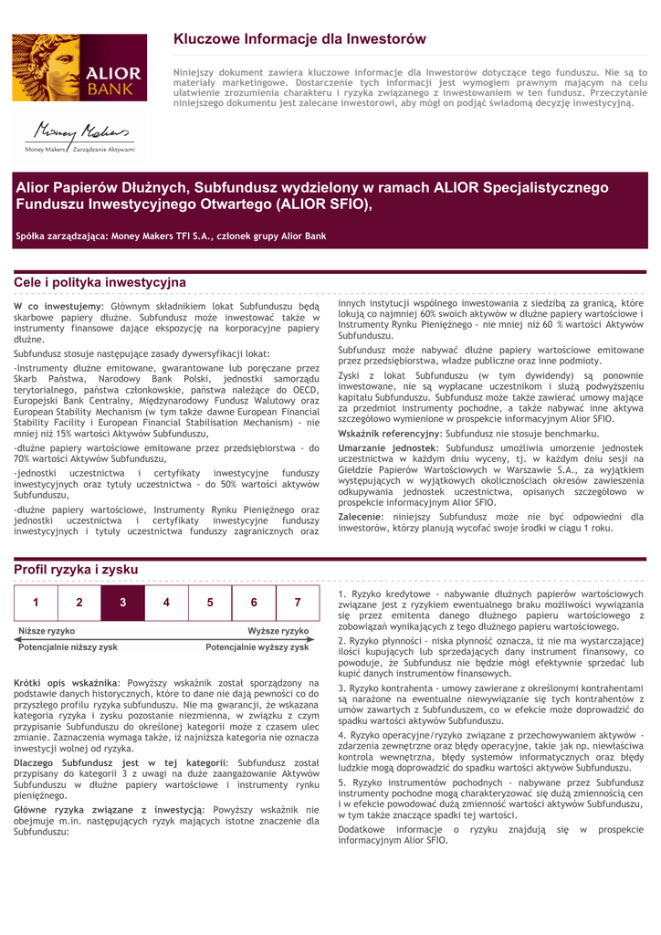 Kluczowe Informacje dla Inwestorów Niniejszy dokument zawiera kluczowe informacje dla Inwestorów dotyczące tego funduszu. Nie są to materiały marketingowe. Dostarczenie tych informacji jest wymogiem prawnym mającym na celu ułatwienie zrozumienia charakteru i ryzyka związanego z inwestowaniem w ten fundusz. Przeczytanie niniejszego dokumentu jest zalecane inwestorowi, aby mógł on podjąć świadomą decyzję inwestycyjną. Alior Papierów Dłużnych, Subfundusz wydzielony w ramach ALIOR Specjalistycznego Funduszu Inwestycyjnego Otwartego (ALIOR SFIO), Spółka zarządzająca: Money Makers TFI S.A., członek grupy Alior Bank Cele i polityka inwestycyjna W co inwestujemy: Głównym składnikiem lokat Subfunduszu będą skarbowe papiery dłużne. Subfundusz może inwestować także w instrumenty finansowe dające ekspozycję na korporacyjne papiery dłużne. Subfundusz stosuje następujące zasady dywersyfikacji lokat: -Instrumenty dłużne emitowane, gwarantowane lub poręczane przez Skarb Państwa, Narodowy Bank Polski, jednostki samorządu terytorialnego, państwa członkowskie, państwa należące do OECD, Europejski Bank Centralny, Międzynarodowy Fundusz Walutowy oraz European Stability Mechanism (w tym także dawne European Financial Stability Facility i European Financial Stabilisation Mechanism) - nie mniej niż 15% wartości Aktywów Subfunduszu, -dłużne papiery wartościowe emitowane przez przedsiębiorstwa - do 70% wartości Aktywów Subfunduszu, -jednostki uczestnictwa i certyfikaty inwestycyjne funduszy inwestycyjnych oraz tytuły uczestnictwa - do 50% wartości aktywów Subfunduszu, -dłużne papiery wartościowe, Instrumenty Rynku Pieniężnego oraz jednostki uczestnictwa i certyfikaty inwestycyjne funduszy inwestycyjnych i tytuły uczestnictwa funduszy zagranicznych oraz innych instytucji wspólnego inwestowania z siedzibą za granicą, które lokują co najmniej 60% swoich aktywów w dłużne papiery wartościowe i Instrumenty Rynku Pieniężnego - nie mniej niż 60 % wartości Aktywów Subfunduszu. Subfundusz może nabywać dłużne papiery wartościowe emitowane przez przedsiębiorstwa, władze publiczne oraz inne podmioty. Zyski z lokat Subfunduszu (w tym dywidendy) są ponownie inwestowane, nie są wypłacane uczestnikom i służą podwyższeniu kapitału Subfunduszu. Subfundusz może także zawierać umowy mające za przedmiot instrumenty pochodne, a także nabywać inne aktywa szczegółowo wymienione w prospekcie informacyjnym Alior SFIO. Wskaźnik referencyjny: Subfundusz nie stosuje benchmarku. Umarzanie jednostek: Subfundusz umożliwia umorzenie jednostek uczestnictwa w każdym dniu wyceny, tj. w każdym dniu sesji na Giełdzie Papierów Wartościowych w Warszawie S.A., za wyjątkiem występujących w wyjątkowych okolicznościach okresów zawieszenia odkupywania jednostek uczestnictwa, opisanych szczegółowo w prospekcie informacyjnym Alior SFIO. Zalecenie: niniejszy Subfundusz może nie być odpowiedni dla inwestorów, którzy planują wycofać swoje środki w ciągu 1 roku. Profil ryzyka i zysku 1 2 3 4 5 6 7 Krótki opis wskaźnika: Powyższy wskaźnik został sporządzony na podstawie danych historycznych, które to dane nie dają pewności co do przyszłego profilu ryzyka subfunduszu. Nie ma gwarancji, że wskazana kategoria ryzyka i zysku pozostanie niezmienna, w związku z czym przypisanie Subfunduszu do określonej kategorii może z czasem ulec zmianie. Zaznaczenia wymaga także, iż najniższa kategoria nie oznacza inwestycji wolnej od ryzyka. Dlaczego Subfundusz jest w tej kategorii: Subfundusz został przypisany do kategorii 3 z uwagi na duże zaangażowanie Aktywów Subfunduszu w dłużne papiery wartościowe i instrumenty rynku pieniężnego. Główne ryzyka związane z inwestycją: Powyższy wskaźnik nie obejmuje m.in. następujących ryzyk mających istotne znaczenie dla Subfunduszu: 1. Ryzyko kredytowe - nabywanie dłużnych papierów wartościowych związane jest z ryzykiem ewentualnego braku możliwości wywiązania się przez emitenta danego dłużnego papieru wartościowego z zobowiązań wynikających z tego dłużnego papieru wartościowego. 2. Ryzyko płynności - niska płynność oznacza, iż nie ma wystarczającej ilości kupujących lub sprzedających dany instrument finansowy, co powoduje, że Subfundusz nie będzie mógł efektywnie sprzedać lub kupić danych instrumentów finansowych. 3. Ryzyko kontrahenta - umowy zawierane z określonymi kontrahentami są narażone na ewentualne niewywiązanie się tych kontrahentów z umów zawartych z Subfunduszem, co w efekcie może doprowadzić do spadku wartości aktywów Subfunduszu. 4. Ryzyko operacyjne/ryzyko związane z przechowywaniem aktywów zdarzenia zewnętrzne oraz błędy operacyjne, takie jak np. niewłaściwa kontrola wewnętrzna, błędy systemów informatycznych oraz błędy ludzkie mogą doprowadzić do spadku wartości aktywów Subfunduszu. 5. Ryzyko instrumentów pochodnych - nabywane przez Subfundusz instrumenty pochodne mogą charakteryzować się dużą zmiennością cen i w efekcie powodować dużą zmienność wartości aktywów Subfunduszu, w tym także znaczące spadki tej wartości. Dodatkowe informacje o informacyjnym Alior SFIO. ryzyku znajdują się w prospekcie Opłaty Pobrane opłaty wykorzystuje się do zarządzania funduszem. Zawierają one także koszty dystrybucji i marketingu jednostek uczestnictwa. Poprzez pobranie kosztów zmniejsza się potencjał rozwoju wartości. Opłaty jednorazowe pobierane przed lub po dokonaniu inwestycji Opłata za nabycie 2,00 % Opłata za umorzenie 0,50 % Jest to maksymalna kwota, jaka może zostać pobrana z Państwa środków przed ich zainwestowaniem lub przed wypłaceniem zysków z inwestycji. Opłaty pobierane z funduszu w ciągu roku Opłaty bieżące 2,38 % Opłaty pobierane z funduszu w określonych warunkach szczególnych Opłata za wyniki: w wysokości 20% wzrostu Wartości Aktywów Netto Subfunduszu na J
