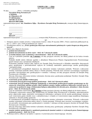 Załącznik nr 3: Projekt umowy nr sprawy ZDP.2020/AZ/22/2016 UMOWA NR …../2016 Art. 4 pkt 8 Ustawy PZP W dniu ……………2016 r. w Kłodzku pomiędzy: Zarządem Dróg Powiatowych w Kłodzku ul. Objazdowa 20 57-300 Kłodzko NIP 883-16-15-352 REGON 890723858 reprezentowanym przez: inż. Stanisława Sijkę - Dyrektora Zarządu Dróg Powiatowych, zwanym dalej Zamawiającym, a: …………………… …………………… …………………… …………………… NIP ……………… REGON ………… reprezentowanym przez: ………………………….. zwanym dalej Wykonawcą, została zawarta umowa następującej treści: §1 1. Niniejsza umowa została zawarta z wyłączeniem Ustawy z dnia 29 stycznia 2004 r. Prawo zamówień publicznych (tj. Dz. U. z 2015 r. poz. 2164) na podstawie art. 4 pkt.8 2. Przedmiotem umowy są: „Prace geodezyjne dotyczące nieruchomości położonych w pasie drogowym dróg powiatowych”. 3. Zakres prac objętych zleceniem: a. podział nieruchomości podział nieruchomości na dwie części – ilość: do 7 zleconych zadań; za każdą kolejną część wydzieloną z nieruchomości – ilość: do 5 zleconych zadań; Czas na wykonanie podziału: do 3 miesięcy od daty przyjęcia zlecenia, nie dłużej jednak niż do końca trwania umowy. Podziału działki należy dokonać zgodnie z aktualnym Miejscowym Planem Zagospodarowania Przestrzennego (jeżeli istnieje) oraz z przepisami odrębnymi. Wykonanie podziału oznacza datę wpływu do Zarządu Dróg Powiatowych w Kłodzku materiałów dotyczących pracy geodezyjnej z poświadczeniem wpływu do ewidencji materiałów państwowego zasobu geodezyjnego i kartograficznego. W uzasadnionych przypadkach dopuszcza się odroczenie terminu wykonania podziału. Wniosek o odroczenie terminu wykonania podziału należy złożyć w formie pisemnej. Wniosek musi zawierać wyczerpujące wyjaśnienie powodów niewykonania prac geodezyjnych w terminie 3 miesięcy od daty przyjęcia zlecenia od Zarządu Dróg Powiatowych w Kłodzku. Decyzję dotyczącą odroczenia terminu wykonania zleconej pracy geodezyjnej podejmuje Dyrektor Zarządu Dróg Powiatowych w Kłodzku. b. wznowienie granic działki ewidencyjnej wznowienie pozycji pierwszego punktu granicznego – ilość: do 9 zleconych zadań; wznowienie pozycji każdego kolejnego istniejącego w materiałach geodezyjnych punktu granicznego na zleconym do wznowienia odcinku granicy (ilość punktów granicy będąca podstawą obliczenia wartości prac liczona jest na podstawie mapy ewidencyjnej będącej załącznikiem do zlecenia prac, aktualnej w dniu zlecenia prac) – ilość: do 10 zleconych zadań; Czas na wykonanie wznowienia: do 1 miesiąca od daty przyjęcia zlecenia, nie dłużej jednak niż do końca umowy. Wykonanie wznowienia oznacza datę dostarczenia do Zarządu Dróg Powiatowych w Kłodzku, opieczętowanych przez odpowiedni organ, materiałów zawierających informację o przyjęciu ich do zasobu geodezyjnego, dotyczących wznowienia granic działek wraz z zaktualizowaną w związku ze wznowieniem mapą zasadniczą obejmującą wskazane w zleceniu punkty graniczne. W uzasadnionych przypadkach dopuszcza się odroczenie terminu wykonania wznowienia. Wniosek o odroczenie terminu wykonania wznowienia należy złożyć w formie pisemnej. Wniosek musi zawierać wyczerpujące wyjaśnienie powodów niewykonania prac geodezyjnych w terminie 1 miesiąca od daty przyjęcia zlecenia od Zarządu Dróg Powiatowych w Kłodzku. Decyzję dotyczącą odroczenia terminu wykonania zleconej pracy geodezyjnej podejmuje Dyrektor Zarządu Dróg Powiatowych w Kłodzku. c. montaż znaków geodezyjnych w punktach granicznych (montaż znaków w wybranych przez Zamawiającego punktach granicy) – ilość: do 15 szt. 4. Realizacja umowy odbywać się będzie w oparciu o wystawiane przez Zamawiającego zlecenia. Załącznik nr 3: Projekt umowy nr sprawy ZDP.2020/AZ/22/2016 5. Stawki za wykonanie umowy tj. podział nieruchomości, wznowienie granic działki ewidencyjnej określa kosztorys ofertowy, złożony przez oferenta. 6. Przedmiot umowy zostanie wykonany zgodnie ze szczegółowymi wytycznymi wykonania robót oraz zasadami współczesnej wiedzy technicznej, obowiązującymi przepisami i normami. §2 Termin wykonania zadania określonego w §1, pkt 2 ustala się do dnia: 02.12.2016 r. §3 1. Całkowita wartość umowy nie może przekroczyć kwoty: ………………………… zł brutto (słownie brutto: ………………………………………………………) w tym obowiązujący podatek VAT ..% ………………. zł. 2. Wynagrodzenie za wykonane prace będzie rozliczane na podstawie cen jednostkowych za poszczególne czynności wyszczególnione w kosztorysie ofertowym. 3. Wykonawca wystawi fakturę odrębnie dla każdego zlecenia, po odbiorze zlecenia protokołem zdawczo-odbiorczym sprawdzonym i zatwierdzonym przez osobę nadzorującą ze strony Zamawiającego 4. Należność za wykonaną pracę zostanie uregulowana z konta Zamawiającego na konto Wykonawcy, w terminie 30 dni od daty otrzymania przez Zamawiającego faktury wraz z protokołem zdawczo-odbiorczym. 5. Wynagrodzenie umowne obejmuje wszystkie koszty i opłaty dodatkowe. 6. Jako termin dokonania zapłaty wynagrodzenia uważany będzie dzień obciążenia rachunku bankowego Zamawiającego. §4 1. Zamawiający nie ponosi odpowiedzialności za szkody wyrządzone przez Wykonawcę podczas wykonywania przedmiotu zamówienia. 2. Wykonawca może powierzyć wykonanie prac określonych niniejszą umową, osobie trzeciej tylko za uprzednią zgodą Zamawiającego. 3. Wykonawca oświadcza, że roboty geodezyjne wykonywane będą przez osoby posiadające odpowiednie uprawnienia geodezyjne. 4. Wykonawca zobowiązany jest po zakończeniu prac do pisemnego zgłoszenia ich do odbioru. 5. Jeżeli wykonane czynności będą wymagały uzupełnienia lub poprawek, Wykonawca wykona je bez dodatkowego wynagrodzenia. §5