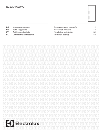 EJ2301AOW2 BG HU LT PL Хладилник-фризер Hűtő - fagyasztó Šaldytuvas-šaldiklis Chłodziarko-zamrażarka Ръководство за употреба Használati útmutató Naudojimo instrukcija Instrukcja obsługi 2 17 31 44 2 www.electrolux.com СЪДЪРЖАНИЕ 1. ИНФОРМАЦИЯ ЗА СИГУРНОСТ.....................................................................3 2. ИНСТРУКЦИИ ЗА СИГУРНОСТ.......................................................................4 3. ДЕЙСТВИЕ........................................................................................................ 6 4. ПЪРВА УПОТРЕБА...........................................................................................7 5. ВСЕКИДНЕВНА УПОТРЕБА............................................................................ 7 6. ПРЕПОРЪКИ И СЪВЕТИ................................................................................. 8 7. ГРИЖИ И ПОЧИСТВАНЕ............................................................................... 10 8. ОТСТРАНЯВАНЕ НА НЕИЗПРАВНОСТИ.....................................................11 9. ИНСТАЛИРАНЕ...............................................................................................14 10. ТЕХНИЧЕСКА ИНФОРМАЦИЯ.................................................................... 15 МИСЛИМ ЗА ВАС Благодарим ви, че закупихте уред от Electrolux. Избрахте продукт, който носи със себе си десетилетия професионален опит и нововъведения. Оригинален и стилен, той е създаден с мисъл за вас. Така че, когато и да го използвате, можете да сте сигурни, че ще получите невероятни резултати по всяко време. Добре дошли в Electrolux. Посетете нашия уебсайт, за да: Получите полезни съвети, брошури, отстраняване на неизправности, сервизна информация: www.electrolux.com/webselfservice Регистрирате своя продукт за по-добро обслужване: www.registerelectrolux.com Купите аксесоари, консумативи и оригинални резервни части за вашия уред: www.electrolux.com/shop ГРИЖИ ЗА КЛИЕНТА И ОБСЛУЖВАНЕ Препоръчваме използването на оригинални резервни части. Когато се свързвате с нашия оторизиран отдел "Обслужване", трябва да имате под ръка следната информация: Модел, PNC (номер на продукт), сериен номер. Информацията можете да намерите на табелката с данни. Предупреждение / Внимание-Важна информация за безопасност Обща информация и съвети Информация за опазване на околната среда Запазваме си правото на изменения. БЪЛГАРСКИ 1. 3 ИНФОРМАЦИЯ ЗА СИГУРНОСТ Внимателно прочетете предоставените инструкции преди инсталиране и употреба на уреда. Производителят не носи отговорност за неправилно инсталиране и употреба, предизвикани от неправилно използване. Винаги запазвайте инструкциите с уреда за бъдещи справки. 1.1 Безопасност за децата и хората с ограничени способности • • • • Този уред може да бъде използван от деца над 8 годишна възраст, както и лица с намалени физически, сетивни и умствени възможности или лица без опит и познания, само ако те са под наблюдение или бъдат инструктирани относно безопасната употреба на уреда и възможните рискове. Не позволявайте на децата да си играят с уреда. Съхранявайте всички опаковъчни материали далеч от деца. Почистването и поддръжката не трябва да се извършват от деца, ако не са под наблюдение. 1.2 Общи мерки за безопасност • • • Този уред е предназначен за употреба в домашни условия и подобни приложения като: – Селскостопански къщи; кухненски зони за персонал в магазини, офиси и други работни места – От клиенти в хотели, мотели, места за отдих и други места за живеене Не запушвайте вентилационните отвори от външната или вътрешната част на уреда. Не използвайте механични приспособления или други средства за ускоряване на процеса на 4 www.electrolux.com • • • • • • размразяване, освен препоръчаните от производителя. Не повреждайте хладилната верига. Не използвайте еле