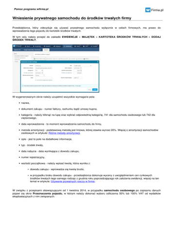 Pomoc programu wfirma.pl Wniesienie prywatnego samochodu do środków trwałych firmy Przedsiębiorca, który zdecyduje się używać prywatnego samochodu wyłącznie w celach firmowych, ma prawo do wprowadzenia tego pojazdu do kartoteki środków trwałych. W tym celu należy przejść do zakładki EWIDENCJE » MAJĄTEK » KARTOTEKA ŚRODKÓW TRWAŁYCH » DODAJ ŚRODEK TRWAŁY. W wygenerowanym oknie należy uzupełnić wszystkie wymagane pola: nazwa, dokument zakupu - numer faktury, rachunku bądź umowy kupna, kategoria - należy kliknąć na lupę oraz wybrać odpowiednią kategorię, 741 dla samochodu osobowego lub 742 dla ciężarowego, data wprowadzenia - to moment wprowadzenia samochodu do firmy, metoda amortyzacji - podstawową metodą jest liniowa, której stawka wynosi 20%. Więcej o amortyzacji samochodów osobowych w artykule: Różne metody amortyzacji, opis - jest to pole na dodatkowe informacje, typ - środek trwały, data nabycia - data wynikająca z dowodu zakupu, numer rejestracyjny, wartość początkowa - należy wpisać kwotę, która wynika z: dowodu zakupu - wprowadza się kwotę brutto, w przypadku braku dowodu zakupu - przedsiębiorca dokonuje wyceny z uwzględnieniem cen rynkowych środków trwałych tego samego rodzaju z grudnia roku poprzedzającego rok założenia ewidencji, więcej na ten temat w artykule: Używanie prywatnych rzeczy w firmie. W związku z przepisami obowiązującymi od 1 kwietnia 2014, w przypadku samochodu osobowego po zapisaniu danych pojawi się okno Przeznaczenia pojazdu, w którym należy dokonać wyboru odliczenia 50% lub 100% VAT od wydatków eksploatacyjnych z nim związanych: Pomoc programu wfirma.pl Więcej informacji na temat wyboru odliczenia w artykule: Samochód w firmie - zmiany w VAT po 1 kwietnia 2014. W przypadku samochodu ciężarowego mogą pojawić się natomiast dwa okna. Pierwsze dotyczące określenia rodzaju pojazdu: W sytuacji posiadania samochodu ciężarowego do 3,5 t z homologacją, pojawi się kolejne okno z koniecznością wyboru odliczenia 50% lub 100%: Pomoc programu wfirma.pl W przypadku wyboru 100% odliczenia VAT od wydatków związanych z samochodem osobowym lub ciężarowym do 3,5 t z homologacją, konieczne jest zgłoszenie pojazdu do urzędu na druku VAT-26 oraz prowadzenie szczegółowej kilometrówki. W szczegółach środka trwałego znajdzie się plan jego amortyzacji (wystarczy kliknąć na wybrany środek trwały). Co miesiąc w KPiR w kolumnie 13 - Pozostałe wydatki będą księgowane odpisy amortyzacyjne, począwszy od miesiąca następującego po miesiącu, w którym przyjęto środek trwały do użytkowania. Amortyzacja wszystkich środków trwałych księgowana jest jednym wpisem na koniec miesiąca. Dodatkowo system generuje Dokument OT - przyjęcia środka trwałego do użytkowania, w zakładce EWIDENCJE » MAJĄTEK » DOKUMENTY, który należy wydrukować i przechowywać wraz z pozostałą dokumentacją księgową firmy. Pod OT należy podpiąć wszystkie dokumenty, które składają się na wartość początkową pojazdu. Powered by TCPDF (www.tcpdf.org)