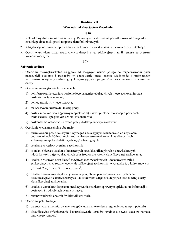 Rozdział VII Wewnątrzszkolny System Oceniania § 28 1. Rok szkolny dzieli się na dwa semestry. Pierwszy semestr trwa od początku roku szkolnego do ostatniego dnia nauki przed rozpoczęciem ferii zimowych. 2. Klasyfikację uczniów przeprowadza się na koniec I semestru nauki i na koniec roku szkolnego. 3. Oceny wystawione przez nauczyciela z danych zajęć edukacyjnych za II semestr są ocenami końcoworocznymi. § 29 Założenia ogólne: 1. Ocenianie wewnątrzszkolne osiągnięć edukacyjnych ucznia polega na rozpoznawaniu przez nauczycieli poziomu i postępów w opanowaniu przez ucznia wiadomości i umiejętności w stosunku do wymagań edukacyjnych wynikających z programów nauczania oraz formułowania oceny. 2. Ocenianie wewnątrzszkolne ma na celu: 1) poinformowanie ucznia o poziome jego osiągnięć edukacyjnych i jego zachowaniu oraz postępach w tym zakresie, 2) pomoc uczniowi w jego rozwoju, 3) motywowanie ucznia do dalszej pracy, 4) dostarczanie rodzicom (prawnym opiekunom) i nauczycielom informacji o postępach, trudnościach i specjalnych uzdolnieniach ucznia, 5) doskonalenie organizacji i metod pracy dydaktyczno-wychowawczej. 3. Ocenianie wewnątrzszkolne obejmuje: 1) formułowanie przez nauczycieli wymagań edukacyjnych niezbędnych do uzyskania poszczególnych śródrocznych i rocznych (semestralnych) ocen klasyfikacyjnych z obowiązkowych i dodatkowych zajęć edukacyjnych, 2) ustalanie kryteriów oceniania zachowania; 3) ocenianie bieżące ustalanie śródrocznych ocen klasyfikacyjnych z obowiązkowych i dodatkowych zajęć edukacyjnych oraz śródrocznej oceny klasyfikacyjnej zachowania, 4) ustalanie rocznych ocen klasyfikacyjnych z obowiązkowych i dodatkowych zajęć edukacyjnych oraz rocznej oceny klasyfikacyjnej zachowania, według skali, o której mowa w § 13 ust. 2 i § 15 ust. 3 rozporządzenia0; 5) ustalanie warunków i trybu uzyskania wyższych niż przewidywane rocznych ocen klasyfikacyjnych z obowiązkowych i dodatkowych zajęć edukacyjnych oraz rocznej oceny klasyfikacyjnej zachowania; 6) ustalanie warunków i sposobu przekazywania rodzicom (prawnym opiekunom) informacji o postępach i trudnościach ucznia w nauce. 7) przeprowadzenie egzaminów klasyfikacyjnych. 4. Ocenianie pełni funkcję: 1) diagnostyczną (monitorowanie postępów ucznia i określenie jego indywidualnych potrzeb), 2) klasyfikacyjną (różnicowanie i porządkowanie uczniów zgodnie z pewną skalą za pomocą umownego symbolu), 3) motywacyjną. 5. Przedmiotem oceny jest: 1) zakres opanowanych wiadomości i umiejętności, 2) stosowanie zdobytej wiedzy i nabytych umiejętności w sytuacjach typowych i problemowych. 6. Oceny dzielą się na: 1) bieżące (cząstkowe), 2) klasyfikacyjne śródroczne, 3) klasyfikacyjne roczne. § 30 Procedura przekazywania informacji 1. Nauczyciele na początku każdego roku szkolnego informują uczniów oraz ich rodziców (prawnych opiekunów) o: 1) wymaganiach edukacyjnych niezbędnych do uzyskania poszczególnych śródrocznych i rocznych ocen klasyfikacyjnych z obowiązkowych i dodatkowych zajęć edukacyjnych, wynikających z realizowanego przez siebie programu nauczania; 2) sposobach sprawdzania osiągnięć edukacyjnych uczniów; 3) warunkach i trybie uzyskania wyższej niż przewidywana rocznej oceny klasyfikacyjnej z obowiązkowych i dodatkowych zajęć edukacyjnych. 2. Wychowawca klasy na początku każdego roku szkolnego informuje uczniów oraz ich rodziców (prawnych opiekunów) o: 1) warunkach i sposobie oraz kryteriach oceniania zachowania; 2) warunkach i trybie uzyskania wyższej niż przewidywana rocznej oceny klasyfikacyjnej zachowania. § 31 Ocenianie osiągnięć dydaktycznych ucznia w I etapie kształcenia (klasy I – III) 1. Ocenie podlega: 1) wkład pracy, aktywność, samodzielność pracy, 2) wiadomości, umiejętności, 3) postępy w nauce jako przyrost wiedzy i umiejętności, 4) systematyczność, staranność, 5) wykazywanie się wiadomościami wykraczającymi poza program. 2. Formy oceny: 1) oceny bieżące ustalane są w skali cyfrowej określonej w § 13 ust 2 rozporządzenia0 zastrzeżeniem ust. 3 i 4. 2) oceny klasyfikacyjne są ocenami opisowymi, z zastrzeżeniem ust. 4. 3. Formy oceny w przypadku uczniów z upośledzeniem w stopniu umiarkowanym i znacznym określają odrębne przepisy. 4. Oceny klasyfikacyjne z religii określają odrębne przepisy. § 32 1. Klasyfikowanie roczne w klasach I – III szkoły podstawowej polega na podsumowaniu osiągnięć edukacyjnych z zajęć edukacyjnych i zachowania ucznia w danym roku szkolnym oraz ustaleniu jednej rocznej oceny klasyfikacyjnej z zajęć edukacyjnych i rocznej oceny klasyfikacyjnej zachowania. 2. Uczeń klasy I –III otrzymuje promocję do klasy programowo wyższej. 3. W wyjątkowych przypadkach rada pedagogiczna może postanowić o powtarzaniu klasy przez ucznia na podstawie opinii wydanej przez lekarza lub publiczną poradnię psychologicznopedagogiczną oraz poradnię specjalistyczną, po zasięgnięciu opinii rodziców ucznia. 4. Na wniosek rodziców i po uzyskaniu zgody wychowawcy klasy lub na wniosek wychowawcy klasy i po uzyskaniu zgody rodziców oraz po uzyskaniu opinii publicznej poradni psychologicznopedagogicznej, w tym publicznej poradni specjalistycznej, rada pedagogiczna może postanowić o promowaniu ucznia klasy I i II szkoły podstawowej do klasy programowo wyższej również w ciągu roku szkolnego. § 33 1. Przedmiotowy System Oceniania (PSO) powinien zawierać: 1) określenie za co uczeń będzie oceniany, 2) rodzaje sprawdzianów pisemnych, ich częstotliwość, zakres, 3) sposób i terminy poprawiania przewidywanych ocen klasyfikacyjnych, 4) wymagania odnośnie prowadzenia zeszytów oraz posiadania innych pomocy niezbędnych na lekcjach. § 34 Wymagania edukacyjne. 1. Wymagania edukacyjne są to zamierzone osiągnięcia i kompetencje uczniów na poszczególnych etapach kształcenia w zakresie wiadomości, umiejętności i postaw uczniów. 