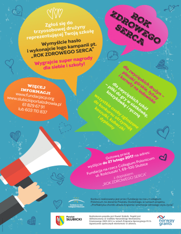 o d ę i s Zgłoś y n y ż u r d j e w o b o ę ł o trzyos k z s ą j o w T j e c ą j u t n e z repre o ł s a h e i c l ś y m y . t W p i i n a p m a k o g o l e i c j a ” A C R E i wykon S O G E W O R D Z K „RO y d o r g a n r e p u s e i c j a r g y W ! y ł o k z s i e i b e i s dla więce j infor macji www .fundacja cp.org www.slub ickiporta lzdrowia. pl 61 829 67 9 1 lub 603 1 10 837 ZD R RO OK SE W RC EG A O dl az pl wy i k eca ci ar ki ęs ne g kic ty órs h – dla dr pi k n z a l ie, uż łk w od ły yn ko i d yc sz o g ięs ow żw – ws yk ry ki y i zy s ów w ch ko do st kę sia sz ko kie k t i ko nk os rę kó ół sz ur ob cz w k ul su y n ę, ą z k i d i, ot gł yp ku rz os lo be ym zo m cz u ne y ki ją : s ę e r c ra ad p a ą n w 7 1 o t 0 o 2 G m o u g c e i t n o lu l o 7 2 P o m d u i e e i g c i c e j l i b l l u o ś ł C S wy z 0 c 0 e 1 z r 9 a 6 n , 1 a i j k c z a s d u i n c u ś F m o ” e K i A . k l s C i u z dop EGO SER W O R ZD K O „R piktogram polska / chromastock.pl Konkurs realizowany jest przez Fundację na rzecz Collegium Polonicum na zlecenie Powiatu Słubickiego, w ramach projektu „Profilaktyka chorób układu krążenia i promocja zdrowego stylu życia” Realizatorem projektu jest Powiat Słubicki. Projekt jest dofinansowany ze środków Norweskiego Mechanizmu Finansowego 2009-2014 w ramach Programu Operacyjnego PL13: Ograniczenie społecznych nierówności w zdrowiu.