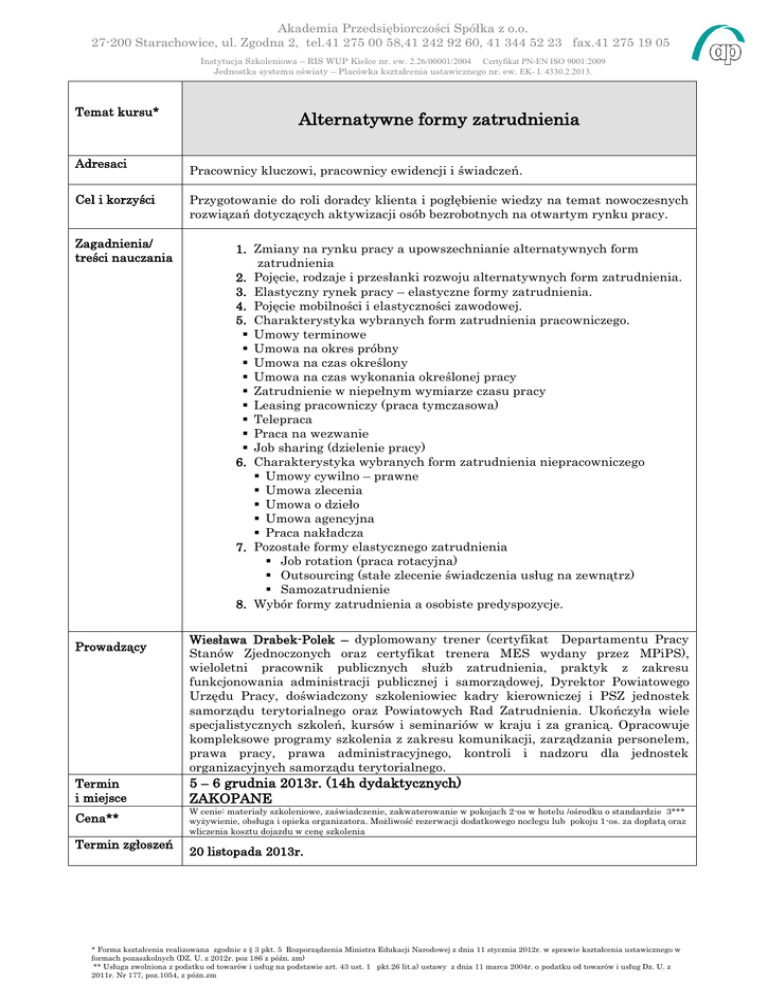 Akademia Przedsiębiorczości Spółka z o.o. 27-200 Starachowice, ul. Zgodna 2, tel.41 275 00 58,41 242 92 60, 41 344 52 23 fax.41 275 19 05 Instytucja Szkoleniowa – RIS WUP Kielce nr. ew. 2.26/00001/2004 Certyfikat PN-EN ISO 9001:2009 Jednostka systemu oświaty – Placówka kształcenia ustawicznego nr. ew. EK- I. 4330.2.2013. Temat kursu* Adresaci Cel i korzyści Zagadnienia/ treści nauczania Prowadzący Termin i miejsce Cena** Termin zgłoszeń Alternatywne formy zatrudnienia Pracownicy kluczowi, pracownicy ewidencji i świadczeń. Przygotowanie do roli doradcy klienta i pogłębienie wiedzy na temat nowoczesnych rozwiązań dotyczących aktywizacji osób bezrobotnych na otwartym rynku pracy. 1. Zmiany na rynku pracy a upowszechnianie alternatywnych form zatrudnienia 2. Pojęcie, rodzaje i przesłanki rozwoju alternatywnych form zatrudnienia. 3. Elastyczny rynek pracy – elastyczne formy zatrudnienia. 4. Pojęcie mobilności i elastyczności zawodowej. 5. Charakterystyka wybranych form zatrudnienia pracowniczego. Umowy terminowe Umowa na okres próbny Umowa na czas określony Umowa na czas wykonania określonej pracy Zatrudnienie w niepełnym wymiarze czasu pracy Leasing pracowniczy (praca tymczasowa) Telepraca Praca na wezwanie Job sharing (dzielenie pracy) 6. Charakterystyka wybranych form zatrudnienia niepracowniczego Umowy cywilno – prawne Umowa zlecenia Umowa o dzieło Umowa agencyjna Praca nakładcza 7. Pozostałe formy elastycznego zatrudnienia Job rotation (praca rotacyjna) Outsourcing (stałe zlecenie świadczenia usług na zewnątrz) Samozatrudnienie 8. Wybór formy zatrudnienia a osobiste predyspozycje. Wiesława Drabek-Polek – dyplomowany trener (certyfikat Departamentu Pracy Stanów Zjednoczonych oraz certyfikat trenera MES wydany przez MPiPS), wieloletni pracownik publicznych służb zatrudnienia, praktyk z zakresu funkcjonowania administracji publicznej i samorządowej, Dyrektor Powiatowego Urzędu Pracy, doświadczony szkoleniowiec kadry kierowniczej i PSZ jednostek samorządu terytorialnego oraz Powiatowych Rad Zatrudnienia. Ukończyła wiele specjalistycznych szkoleń, kursów i seminariów w kraju i za granicą. Opracowuje kompleksowe programy szkolenia z zakresu komunikacji, zarządzania personelem, prawa pracy, prawa administracyjnego, kontroli i nadzoru dla jednostek organizacyjnych samorządu terytorialnego. 5 – 6 grudnia 2013r. (14h dydaktycznych) ZAKOPANE W cenie: materiały szkoleniowe, zaświadczenie, zakwaterowanie w pokojach 2-os w hotelu /ośrodku o standardzie 3*** wyżywienie, obsługa i opieka organizatora. Możliwość rezerwacji dodatkowego noclegu lub pokoju 1-os. za dopłatą oraz wliczenia kosztu dojazdu w cenę szkolenia 20 listopada 2013r. * Forma kształcenia realizowana zgodnie z § 3 pkt. 5 Rozporządzenia Ministra Edukacji Narodowej z dnia 11 stycznia 2012r. w sprawie kształcenia ustawicznego w formach pozaszkolnych (DZ. U. z 2012r. poz 186 z późn. zm) ** Usługa zwolniona z podatku od towarów i usług na podstawie art. 43 ust. 1 pkt.26 lit.a) ustawy z dnia 11 marca 2004r. o podatku od towarów i usług Dz. U. z 2011r. Nr 177, poz.1054, z póżn.zm