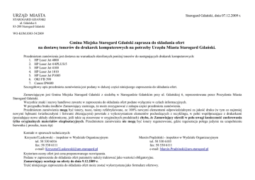 URZĄD MIASTA Starogard Gdański, dnia 07.12.2009 r. STAROGARD GDAŃSKI ul. Gdańska 6 83-200 Starogard Gdański WO-KOM.0303-54/2009 Gmina Miejska Starogard Gdański zaprasza do składania ofert na dostawę tonerów do drukarek komputerowych na potrzeby Urzędu Miasta Starogard Gdański. Przedmiotem zamówienia jest dostawa na warunkach określonych poniżej tonerów do następujących drukarek komputerowych: 1. HP Laser Jet 4000 2. HP Laser Jet 4/4PLUS/5 3. HP Laser Jet 4100 4. HP Laser Jet 1010 5. HP Laser Jet P1005 6. OKI FB 390 7. Canon IP4600 Szczegółowy opis przedmiotu zamówienia jest podany w dalszej części niniejszego zaproszenia do składania ofert. Zamawiającym jest Gmina Miejska Starogard Gdański z siedzibą w Starogardzie Gdańskim przy ul. Gdańskiej 6, reprezentowana przez Prezydenta Miasta Starogard Gdański. Wszystkie znaki i nazwy handlowe zawarte w zaproszeniu do składania ofert podano wyłącznie w celach informacyjnych. W przypadku braku środków Zamawiający zastrzega, że może zrezygnować z zakupu części przedmiotu zamówienia. Przedmiotem zamówienia mogą być tonery, tusze, taśmy refabrykowane, ze 100% nowymi elementami odpowiedzialnymi za jakość druku (w tym co najmniej nowymi bębnami światłoczułymi i listwami zbierającymi) powstałe z wykorzystaniem elementów pochodzących z recyklingu, w pełni współpracujące z drukarkami (posiadające nowe układy elektroniczne, jeśli takie są stosowane w oryginalnych produktach) chyba, że Zamawiający określi w polu uwagi konieczność zaoferowania tylko oryginalnych materiałów eksploatacyjnych. Przedmiotem zamówienia nie mogą być tonery regenerowane, gdzie regeneracja polega jedynie na uzupełnieniu barwnika ( proszku, tuszu itp) Kontakt w sprawach technicznych: Krzysztof Laskowski – inspektor w Wydziale Organizacyjnym Marcin Prądziński - inspektor w Wydziale Organizacyjnym tel. 58 530 6016 tel. 58 530 6103 fax: 58 530 6111 fax: 58 530 6111 e-mail: [email protected] e-mail: [email protected] Kryterium oceny ofert jest cena proponowanego rozwiązania. Podane w zaproszeniu do składania ofert parametry należy traktować jako wartości obligatoryjne. Zamawiający oczekuje na oferty do dnia 9.12.2009 r. Treść niniejszego zaproszenia do składania ofert może zostać wykorzystana jako formularz ofertowy. Wybór ofert nastąpi do dnia 11.12.2009 r. Termin realizacji zamówienia 7 dni kalendarzowych od podpisania umowy. Niniejsze postępowanie nie podlega przepisom Prawa Zamówień Publicznych ze względu na kwotę zamówienia poniżej 14.000 €. Szczegółowy zakres zapotrzebowania zawarto w poniższej tabeli: lp model drukarki 1 TONER HP 4/4plus/5 2 TONER HP4000 3 TONER HP4100 4 TONER HP1010 5 TONER HPLJ P1005 6 TAŚMA BARWIĄCA OKI FB 390 7 TUSZ Canon IP4600 8 TUSZ Canon IP4600 9 TUSZ Canon IP4600 10 TUSZ Canon IP4600 11 TUSZ Canon IP4600 12 RAZEM WARTOŚĆ ZAMÓWIENIA symbol producenta 92298X C4127X C8061X Q2612A CB435A CLI-521C CLI-521M CLI-521Y CLI-521BK CLI-520BK ilość zamawiana 4 25 6 6 2 50 4 4 4 4 4 Cena/1 szt. Nazwa marki / Producent materiału eksploatacyjnego Uwagi Wartość 0,00 0,00 0,00 0,00 0,00 0,00 0,00 0,00 0,00 0,00 0,00 0,00 zł zł zł zł zł zł zł zł zł zł zł zł Tylko Tylko Tylko Tylko Tylko Oryginał Oryginał Oryginał Oryginał Oryginał