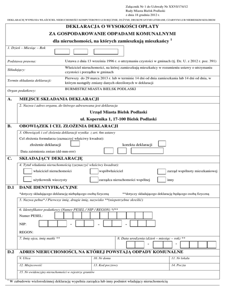 Załącznik Nr 1 do Uchwały Nr XXVI/174/12 Rady Miasta Bielsk Podlaski z dnia 18 grudnia 2012 r. DEKLARACJĘ WYPEŁNIA WŁAŚCICIEL NIERUCHOMOŚCI KOMPUTEROWO LUB RĘCZNIE, DUŻYMI, DRUKOWANYMI LITERAMI, CZARNYM LUB NIEBIESKIM KOLOREM DEKLARACJA O WYSOKOŚCI OPŁATY ZA GOSPODAROWANIE ODPADAMI KOMUNALNYMI dla nieruchomości, na których zamieszkują mieszkańcy 1 1. Dzień – Miesiąc – Rok Podstawa prawna: Ustawa z dnia 13 września 1996 r. o utrzymaniu czystości w gminach (tj. Dz. U. z 2012 r. poz. 391) Składający: Właściciel nieruchomości, na której zamieszkują mieszkańcy w rozumieniu ustawy o utrzymaniu czystości i porządku w gminach Termin składania deklaracji: Pierwszy do 29 marca 2013 r. lub w terminie 14 dni od dnia zamieszkania lub 14 dni od dnia, w którym nastąpiły zmiany danych określonych w deklaracji Organ podatkowy: A. BURMISTRZ MIASTA BIELSK PODLASKI MIEJSCE SKŁADANIA DEKLARACJI 2. Nazwa i adres organu, do którego adresowana jest deklaracja Urząd Miasta Bielsk Podlaski ul. Kopernika 1, 17-100 Bielsk Podlaski B. OBOWIĄZEK I CEL ZŁOŻENIA DEKLARACJI 3. Obowiązek i cel złożenia deklaracji wynika z art. 6m ustawy Cel złożenia formularza (zaznaczyć właściwy kwadrat): złożenie deklaracji korekta deklaracji Data zaistnienia zmian (dd-mm-rrrr) C. SKŁADAJĄCY DEKLARACJĘ 4. Tytuł władania nieruchomością (zaznaczyć właściwy kwadrat): D.1 właściciel nieruchomości współwłaściciel zarząd wspólnoty mieszkaniowej użytkownik wieczysty zarządca nieruchomości wspólnej inny DANE IDENTYFIKACYJNE *dotyczy składającego deklarację niebędącego osobą fizyczną **dotyczy składającego deklarację będącego osobą fizyczną 5. Nazwa pełna* / Pierwsze imię, drugie imię, nazwisko **(niepotrzebne skreślić) 6. Identyfikator podatkowy (Numer PESEL / NIP / REGON) */** Numer PESEL: NIP: REGON: 7. Imię ojca, imię matki ** D.2 8. Data urodzenia (dzień – miesiąc – rok) ** ADRES NIERUCHOMOŚCI, NA KTÓREJ POWSTAJĄ ODPADY KOMUNALNE 9. Ulica 10. Nr domu 11. Nr lokalu 12. Miejscowość 13. Kod pocztowy 14. Poczta 15. Nr ewidencyjny nieruchomości w rejestrze gruntów 1 W zabudowie wielorodzinnej deklarację wypełnia zarządca lub inny podmiot władający nieruchomością D.3. E. ADRES DO KORESPONDENCJI - jeżeli jest inny, niż adres z D.2. 16. Województwo 17. Powiat 19. Ulica 20. Nr domu 23. Kod pocztowy 24. Poczta 18. Gmina 21. Nr lokalu OPŁATA ZA GOSPODAROWANIE ODPADAMI KOMUNALNYMI Oświadczam, że odpady z nieruchomości będą zbierane w sposób 2 25. Stawka opłaty ³ ( wysokość stawki określa odrębna uchwała Rady Miasta Bielsk Podlaski w sprawie wyboru metody ustalania opłaty za gospodarowanie odpadami komunalnymi oraz ustalania wysokości tej opłaty) 26. Liczba osób zamieszkujących nieruchomość wskazaną w części D.2. Miesięczna kwota opłaty (kwotę z poz. 26 należy pomnożyć przez liczbę osób wskazaną w poz. 27) F. 22. Miejscowość selektywny zmieszany ………...… zł 27. ……..… osób 28. ………...… zł OŚWIADCZENIE I PODPIS OSOBY SKŁADAJĄCEJ DEKLARACJĘ Oświadczam, że znane są mi przepisy Kodeksu karnego skarbowego za podanie danych niezgodnych z rzeczywistością 29. Data 30. Czytelny podpis (z podaniem imienia i nazwiska) POUCZENIE W przypadku nieuiszczenia opłaty z poz. 28 w terminie określonym stosowną uchwałą Rady Miasta Bielsk Podlaski w sprawie terminu, częstotliwości i trybu uiszczania opłaty za gospodarowanie odpadami komunalnymi lub uiszczenia jej w niepełnej wysokości, niniejsza deklaracja stanowi podstawę do wystawienia tytułu wykonawczego, zgodnie z przepisami ustawy z dnia 17 czerwca 1966 r. o postępowaniu egzekucyjnym w administracji ( Dz. U. z 2005 r., Nr 229, poz. 1954 z późn. zm.) Zgodnie z art. 6m ustawy z dnia 13 września 1996 r. o utrzymaniu czystości i porządku w gminach właściciel nieruchomości jest obowiązany złożyć do właściwego organu deklarację o wysokości opłaty za gospodarowanie odpadami komunalnymi w terminie 14 dni od dnia zamieszkania na danej nieruchomości pierwszego mieszkańca. W wypadku zmiany danych będących podstawą ustalenia wysokości należnej opłaty za gospodarowanie odpadami komunalnymi właściciel nieruchomości jest obowiązany złożyć nową deklarację w terminie 14 dni od dnia nastąpienia zmiany. Zgodnie z art. 6o cytowanej ustawy w razie niezłożenia deklaracji o wysokości opłaty za gospodarowanie odpadami komunalnymi albo uzasadnionych wątpliwości co do danych zawartych w deklaracji właściwy organ określa, w drodze decyzji, wysokość opłaty za gospodarowanie odpadami komunalnymi, biorąc pod uwagę uzasadnione szacunki. G.4) 1. Załącznik – Dane o nieruchomościach, na których wytwarzane są odpady komunalne tak/nie (niepotrzebne skreślić). 2. Dokumenty potwierdzające dane zawarte w deklaracji. a) zaświadczenie lub oświadczenie złożone o uczących się dzieciach pozostających poza miejscem zamieszkania tak/nie (niepotrzebne skreślić) b) zaświadczenie lub oświadczenie złożone o osobach przebywających poza granicami miasta Bielsk Podlaski tak/nie (niepotrzebne skreślić) c) zaświadczenie lub oświadczenie złożone o osobach zamieszkałych poza granicami kraju tak/nie (niepotrzebne skreślić) 2 Sposób zbierania odpadów będzie podlegał bieżącej kontroli. W przypadku niewywiązywania się z obowiązku selektywnego zbierania odpadów komunalnych właściwy organ w drodze decyzji naliczy opłatę za odprowadzanie odpadów zmieszanych wraz z zaległymi odsetkami. Należy zaznaczyć właściwy kwadrat. 3 W przypadku wyboru metody nieselektywnego zbierania odpadów komunalnych należy wskazać stawkę podstawową, a przy wyborze selektywnej zbiórki odpadów komunalnych należy wybrać stawkę obniżoną. 4 Załącznik i dokumenty do deklaracji zostały określone uchwałą Rady Miasta Bielsk Podlaski w sprawie ustalenia wzoru deklaracji o wysokości opłaty za gospodar