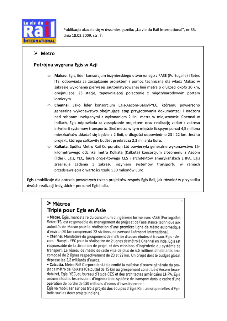 Publikacja ukazała się w dwumiesięczniku „La vie du Rail International”, nr 35, dnia 18.03.2009, str. 7. Metro Potrójna wygrana Egis w Azji • • • Makao. Egis, lider konsorcjum inżynierskiego utworzonego z FASE (Portugalia) i Setec ITS, odpowiada za zarządzanie projektem i pomoc techniczną dla władz Makao w zakresie wykonania pierwszej zautomatyzowanej linii metra o długości około 20 km, obejmującej 23 stacje, zapewniającej połączenie z międzynarodowym portem lotniczym. Chennai. Jako lider konsorcjum Egis-Aecom-Barsyl-YEC, któremu powierzono generalne wykonawstwo obejmujące etap przygotowania dokumentacji i nadzoru nad robotami związanymi z wykonaniem 2 linii metra w miejscowości Chennai w Indiach, Egis odpowiada za zarządzanie projektem oraz realizację zadań z zakresu inżynierii systemów transportu. Sieć metra w tym mieście liczącym ponad 4,5 miliona mieszkańców składać się będzie z 2 linii, o długości odpowiednio 23 i 22 km. Jest to projekt, którego całkowity budżet przekracza 2,3 miliarda Euro. Kalkuta. Spółka Metro Rail Corporation Ltd powierzyła generalne wykonawstwo 15kilometrowego odcinka metra Kolkata (Kalkuta) konsorcjum złożonemu z Aecom (lider), Egis, YEC, biura projektowego CES i architektów amerykańskich LHPA. Egis zrealizuje zadania z zakresu inżynierii systemów transportu w ramach przedsięwzięcia o wartości rzędu 530 milionów Euro. Egis zmobilizuje dla potrzeb powyższych trzech projektów zespoły Egis Rail, jak również w przypadku dwóch realizacji indyjskich – personel Egis India.