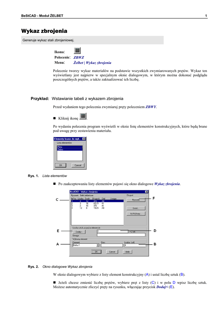 BeStCAD - Moduł ŻELBET 1 Wykaz zbrojenia Generuje wykaz stali zbrojeniowej. Ikona: Polecenie: ZBWZ Menu: Żelbet | Wykaz zbrojenia Polecenie tworzy wykaz materiałów na podstawie wszystkich zwymiarowanych prętów. Wykaz ten wyświetlany jest najpierw w specjalnym oknie dialogowym, w którym można dokonać podglądu poszczególnych prętów, a także zaktualizować ich liczbę. Przykład: Wstawianie tabeli z wykazem zbrojenia Przed wydaniem tego polecenia zwymiaruj pręty poleceniem ZBWY. n Kliknij ikonę . Po wydaniu polecenia program wyświetli w oknie listę elementów konstrukcyjnych, które będą brane pod uwagę przy zestawieniu materiału. Rys. 1. Lista elementów n Po zaakceptowaniu listy elementów pojawi się okno dialogowe Wykaz zbrojenia. Rys. 2. Okno dialogowe Wykaz zbrojenia W oknie dialogowym wybierz z listy element konstrukcyjny (A) i ustal liczbę sztuk (B). n Jeżeli chcesz zmienić liczbę prętów, wybierz pręt z listy (C) i w polu D wpisz liczbę sztuk. Możesz automatycznie zliczyć pręty na rysunku, włączając przycisk Dodaj< (E). BeStCAD - Moduł ŻELBET 2 n Aby wstawić wykaz do rysunku, kliknij przycisk Rysunek (F). Po zamknięciu okna otrzymasz następujący rysunek (Rys. 3). W przypadku, gdy zostaną narysowane nowe pręty lub zmieni się liczba prętów już narysowanych, tabelę wstawioną do rysunku należy usunąć, a następnie wstawić nową, wydając powtórnie polecenie ZBWZ. Rys. 3. Wykaz zbrojenia Okno dialogowe Wykaz zbrojenia Dalej szczegółowo opisano okno dialogowe Wykaz zbrojenia, przedstawione na rysunku Rys. 2. Opis okna Wykaz zbrojenia Wycinek Opis wycinka Lista prętów Wyświetla listę prętów, które należą do określonego elementu konstrukcyjnego oraz rysunku. Przenoszenie prętów do innych elementów realizowane jest w oknie dialogowym Zarządzanie pozycjami, uruchamianym poleceniem ZBZ. Wymiary pręta Wycinek służy do ustalania liczby prętów. Można to zrobić ręcznie, wpisując wartość z klawiatury, lub automatycznie — wciskając przycisk Dodaj<. Po włączeniu Dodaj< program wyświetli na ekranie wszystkie rzuty pręta, którego dotyczy edytowany opis. Jednocześnie w wierszu poleceń pojawią się następujące opcje: Pokaż lub ukryj Pręty/Opisy/Deskowania/Całość/Wybier z/ Usuń/Koniec] <Koniec>: Opis opcji: Pręty — pokazuje lub ukrywa pozostałe pręty zbrojeniowe. Opisy — pokazuje lub ukrywa pozostałe opisy prętów. BeStCAD - Moduł ŻELBET Wycinek 3 Opis wycinka Deskowanie — pokazuje lub ukrywa obrys deskowania (tzn. obiekty leżące na warstwie Bet Kon-L). Całość — pokazuje lub ukrywa wszystkie elementy rysunku. Wybierz — pozwala na wskazanie prętów do policzenia; wartość ta zostanie przeniesiona do okna dialogowego. W polu Uwaga można wpisać informację, która pojawi się w ostatniej kolumnie wykazu materiału. Wybrany element Wycinek składa się z trzech pól: Element — rozwijana lista z elementami konstrukcyjnymi. Wybór elementu z listy aktualizuje listę prętów. Opis — w polu tym można wprowadzić dodatkowy opis elementu. Liczba — służy do ustalania liczby elementów. Eksport Przyciski znajdujące się w tym wycinku mają następujące funkcje: Rysunek — wstawia wykaz do rysunku, Excel — tworzy wykaz w pliku *.xls, ActWykazy — tworzy plik w standardzie programu Acive Wykazy Stali. Program ten jest niezależny od BeStCAD-a i służy do tworzenia wykazów dla całego projektu. Zamyka okno dialogowe, zapisuje wszystkie wprowadzone informacje (np. aktualizuje liczbę sztuk w pełnych blokach opisowych prętów).