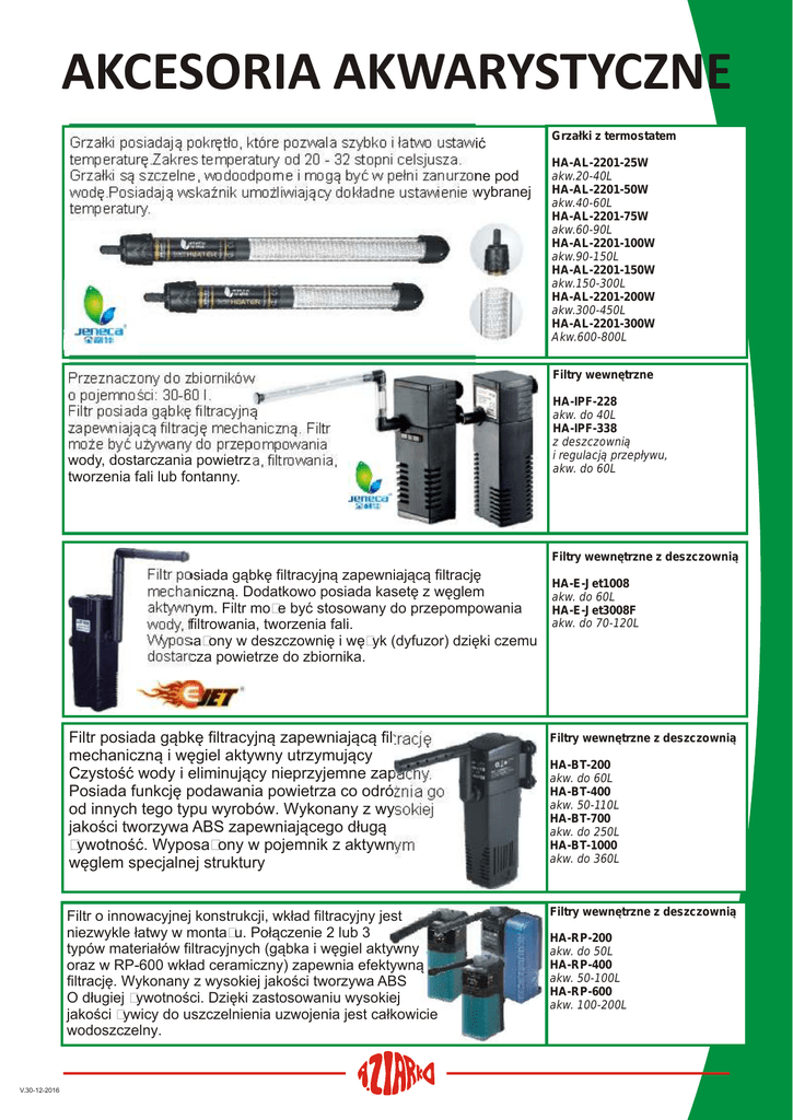 AKCESORIA AKWARYSTYCZNE Grzałki posiadają pokrętło, które pozwala szybko i łatwo ustawić temperaturę.Zakres temperatury od 20 - 32 stopni celsjusza. Grzałki są szczelne, wodoodporne i mogą być w pełni zanurzone pod wodę.Posiadają wskaźnik umożliwiający dokładne ustawienie wybranej temperatury. Przeznaczony do zbiorników o pojemności: 30-60 l. Filtr posiada gąbkę filtracyjną zapewniającą filtrację mechaniczną. Filtr może być używany do przepompowania wody, dostarczania powietrza, filtrowania, tworzenia fali lub fontanny. Grzałki z termostatem HA-AL-2201-25W akw.20-40L HA-AL-2201-50W akw.40-60L HA-AL-2201-75W akw.60-90L HA-AL-2201-100W akw.90-150L HA-AL-2201-150W akw.150-300L HA-AL-2201-200W akw.300-450L HA-AL-2201-300W Akw.600-800L Filtry wewnętrzne HA-IPF-228 akw. do 40L HA-IPF-338 z deszczownią i regulacją przepływu, akw. do 60L Filtry wewnętrzne z deszczownią Filtr posiada gąbkę filtracyjną zapewniającą filtrację mechaniczną. Dodatkowo posiada kasetę z węglem aktywnym. Filtr może być stosowany do przepompowania wody, filtrowania, tworzenia fali. Wyposażony w deszczownię i wężyk (dyfuzor) dzięki czemu dostarcza powietrze do zbiornika. Filtr posiada gąbkę filtracyjną zapewniającą filtrację mechaniczną i węgiel aktywny utrzymujący Czystość wody i eliminujący nieprzyjemne zapachy. Posiada funkcję podawania powietrza co odróżnia go od innych tego typu wyrobów. Wykonany z wysokiej jakości tworzywa ABS zapewniającego długą żywotność. Wyposażony w pojemnik z aktywnym węglem specjalnej struktury Filtr o innowacyjnej konstrukcji, wkład filtracyjny jest niezwykle łatwy w montażu. Połączenie 2 lub 3 typów materiałów filtracyjnych (gąbka i węgiel aktywny oraz w RP-600 wkład ceramiczny) zapewnia efektywną filtrację. Wykonany z wysokiej jakości tworzywa ABS O długiej żywotności. Dzięki zastosowaniu wysokiej jakości żywicy do uszczelnienia uzwojenia jest całkowicie wodoszczelny. V.30-12-2016 HA-E-Jet1008 akw. do 60L HA-E-Jet3008F akw. do 70-120L Filtry wewnętrzne z deszczownią HA-BT-200 akw. do 60L HA-BT-400 akw. 50-110L HA-BT-700 akw. do 250L HA-BT-1000 akw. do 360L Filtry wewnętrzne z deszczownią HA-RP-200 akw. do 50L HA-RP-400 akw. 50-100L HA-RP-600 akw. 100-200L AKCESORIA AKWARYSTYCZNE Filtry narożne z deszczownią HA-MV-100 akw. do 50L HA-MV-200 akw. do 50L HA-MV-400 akw. do 100L HA-MV-600 akw. do 100L Filtry gąbkowe HA-BM-101 HA-BM-102 HA-BM-103 HA-BM-104 HA-AF-1 HA-AF-2 Filtr narożny Filtr posiada gąbkę filtracyjną zapewniającą filtrację mechaniczną i węgiel aktywny utrzymujący na bieżąco czystość wody i eliminujący nieprzyjemne zapachy. Wykonany z wysokiej jakości tworzywa ABS zapewniającego długą żywotność. Filtry gąbkowe - wygodne w użyciu i łatwe W podłączeniu. Zastosowanie jako moduł wstępnej filtracji. Możliwość podłączenia pod pompę wewnętrzną, zewnętrzną, filtr kubełkowy, napowietrzacz. Listwy napowietrzające Odmulacz automatyczny HA-A019 przekrój trapez 10cm HA-A020 przekrój trapez 15cm HA-A021 przekrój trapez 20cm HA-A022 przekrój trapez 30cm HA-AS-615A Wężyk akwarystyczny silikonowy Przezroczysty, 4mm, 200m HA-01F Termometr elektroniczny Filtr podżwirowy do kuli HA-FDK Termometr elektroniczny HA-PT4/200W AKWARIA HA-FC200-2B akwarium akrylowe z filtrem podżwirowym i oświetleniem 6L, czarne HA-FC200-2S akwarium akrylowe z filtrem podżwirowym i oświetleniem 6L, srebrne HA-V-01B kula akwarystyczna z oświetleniem LED 2,5L, czarna HA-V-01S kula akwarystyczna z oświetleniem LED 2,5L, srebrna HA-E-02W Mini-akwarium dla bojownika 1,8L,białe, (2 tła do wyboru) HA-E-02B Mini-akwarium dla bojownika 1,8L,czarne, (2 tła do wyboru) Akwarium akrylowe HAILEA FC200 Eleganckie i proste w obsłudze akwarium wniesie ciepły nastrój do każdego wnętrza. Akwarium wyposażone w akcesoria potrzebne do zapewnienia życia i zdrowia ryb i roślin. Posiada wbudowany podżwirowy system filtracj. Posiada w zestawie wielofunkcyjną pompkę HAILEA BT-100B która rozprowadza wodę po akwarium i wspomaga filtrację podżwirową. Akwarium jest wyposażone w nową kompaktową świetlówkę. Oświetlenie ma wysoką wydajność i niskie zużycie energii. Oświetlenie zapewnia wystarczającą ilość światła, jest wodoodporne, bezpieczne i niezawodne. Każdy zbiornik jest testowany na szczelność i sprawność wszystkich komponentów. Wszystkie elektryczne części produkowane są w ścisłej zgodności z obowiązującymi przepisami Europejskimi. Pokrywa na zawiasach, wyposażona w otwór do łatwego karmienia ryb i aplikowania suplementów. V.30-12-2016