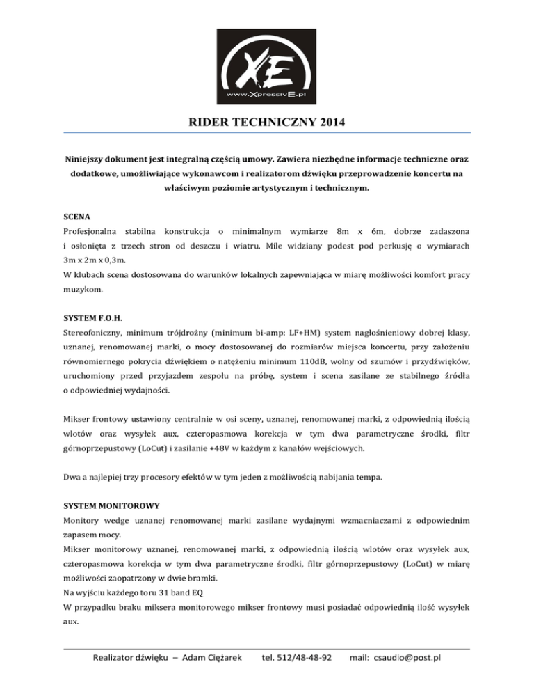 RIDER TECHNICZNY 2014 Niniejszy dokument jest integralną częścią umowy. Zawiera niezbędne informacje techniczne oraz dodatkowe, umożliwiające wykonawcom i realizatorom dźwięku przeprowadzenie koncertu na właściwym poziomie artystycznym i technicznym. SCENA Profesjonalna stabilna konstrukcja o minimalnym wymiarze 8m x 6m, dobrze zadaszona i osłonięta z trzech stron od deszczu i wiatru. Mile widziany podest pod perkusję o wymiarach 3m x 2m x 0,3m. W klubach scena dostosowana do warunków lokalnych zapewniająca w miarę możliwości komfort pracy muzykom. SYSTEM F.O.H. Stereofoniczny, minimum trójdrożny (minimum bi-amp: LF+HM) system nagłośnieniowy dobrej klasy, uznanej, renomowanej marki, o mocy dostosowanej do rozmiarów miejsca koncertu, przy założeniu równomiernego pokrycia dźwiękiem o natężeniu minimum 110dB, wolny od szumów i przydźwięków, uruchomiony przed przyjazdem zespołu na próbę, system i scena zasilane ze stabilnego źródła o odpowiedniej wydajności. Mikser frontowy ustawiony centralnie w osi sceny, uznanej, renomowanej marki, z odpowiednią ilością wlotów oraz wysyłek aux, czteropasmowa korekcja w tym dwa parametryczne środki, filtr górnoprzepustowy (LoCut) i zasilanie +48V w każdym z kanałów wejściowych. Dwa a najlepiej trzy procesory efektów w tym jeden z możliwością nabijania tempa. SYSTEM MONITOROWY Monitory wedge uznanej renomowanej marki zasilane wydajnymi wzmacniaczami z odpowiednim zapasem mocy. Mikser monitorowy uznanej, renomowanej marki, z odpowiednią ilością wlotów oraz wysyłek aux, czteropasmowa korekcja w tym dwa parametryczne środki, filtr górnoprzepustowy (LoCut) w miarę możliwości zaopatrzony w dwie bramki. Na wyjściu każdego toru 31 band EQ W przypadku braku miksera monitorowego mikser frontowy musi posiadać odpowiednią ilość wysyłek aux. Realizator dźwięku – Adam Ciężarek tel. 512/48-48-92 mail: [email protected] RIDER TECHNICZNY 2014 INPUT LISTA KANAŁ INSTRUMENT PREFEROWANY MIKROFON/D.I. INSERT GRUPA 1 BASS DRUM Audix D-6, EV 868, AKG D 112 GATE 1-2 COMP 2 SNARE Audix i5, SM 57 COMP 3 HI-HAT Audix ADX-51, SM 81, AT33a, C1000 4 TOM 1 Audix D-2, E 604 GATE 1-2 COMP 5 TOM 2 Audix D-2, E 604 GATE 1-2 COMP 6 TOM 3 Audix D-2, E 604 GATE 1-2 COMP 7 FLOOR TOM Audix D-4, E 604 GATE 1-2 COMP 8 OVERHEAD L Audix ADX-51, SM 81, AT33a, C1000 9 OVERHEAD R Audix ADX-51, SM 81, AT33a, C1000 10 BASS D.I. BOC ACTIVE 11 EL. GUITAR AUDIX I-5, SM 57, E 609 12 EL. GUITAR AUDIX I-5, SM 57, E 609 13 KEY 1 L D.I. BOC ACTIVE 14 KEY 1 R D.I. BOC ACTIVE 15 KEY 2 L D.I. BOC ACTIVE 16 KEY 2 R D.I. BOC ACTIVE 17 VOC PIOTR SM 58, BETA 58 COMP 18 VOC ADAM SM 58, BETA 58 COMP 19 AC. GUITAR D.I. BOC ACTIVE COMP 20 VOC ANDRZEJ WLOT XLR + kabel 21 VOC ANDRZEJ WLOT XLR + kabel 22 FX RETURN REV 23 FX RETURN REV 24 FX RETURN REV 25 FX RETURN REV 26 FX RETURN TAP D. 27 FX RETURN TAP D. 28 TALKBECK Realizator dźwięku – Adam Ciężarek tel. 512/48-48-92 COMP COMP mail: [email protected] RIDER TECHNICZNY 2014 W tabeli podane są preferowane typy mikrofonów. Akceptujemy użycie mikrofonów innych firm porównywalnej klasy będących ich odpowiednikami. Prosimy o zapewnienie, każdemu z muzyków na scenie, uziemionej listwy rozgałęziającej, z co najmniej 4 gniazdkami na 220v. TORY MONITOROWE TOR MONITOR INSERT 1 VOC ANDRZEJ 2 x WEDGE 400Wrms 31 BAND EQ 2 KEY PIOTR 1 x WEDGE 400Wrms 31 BAND EQ 3 GUITAR ADAM 1 x WEDGE 400Wrms 31 BAND EQ 4 BASS WŁADEK 1 x WEDGE 400Wrms 31 BAND EQ 5 DRUMS KAROL DRUM FILL 2x15” + 2” 31 BAND EQ W przypadkach koncertów na małych scenach z ograniczonymi możliwościami sprzętowymi, warunki techniczne proszę omówić indywidualnie z realizatorem zespołu. STAGE PLAN Realizator dźwięku – Adam Ciężarek tel. 512/48-48-92 mail: [email protected] RIDER TECHNICZNY 2014 Prosimy organizatora o kontakt z naszym akustykiem w celu ustalenia warunków technicznych najpóźniej na 14 dni przed koncertem. Dopuszczamy możliwość zmian – po wcześniejszym ich zaakceptowaniu. Zespół może sam dostarczyć odpowiedni sprzęt nagłośnieniowy spełniający wszelkie wymagania techniczne. W przypadku zainteresowania takim rozwiązaniem prosimy o kontakt z realizatorem zespołu. PROSIMY O UWAŻNE PRZECZYTANIE ORAZ PODPISANIE I ODESŁANIE WRAZ Z UMOWĄ KONCERTOWĄ Przeczytane i zaakceptowane przez ZLECENIODAWCE Realizator dźwięku – Adam Ciężarek tel. 512/48-48-92 mail: [email protected]