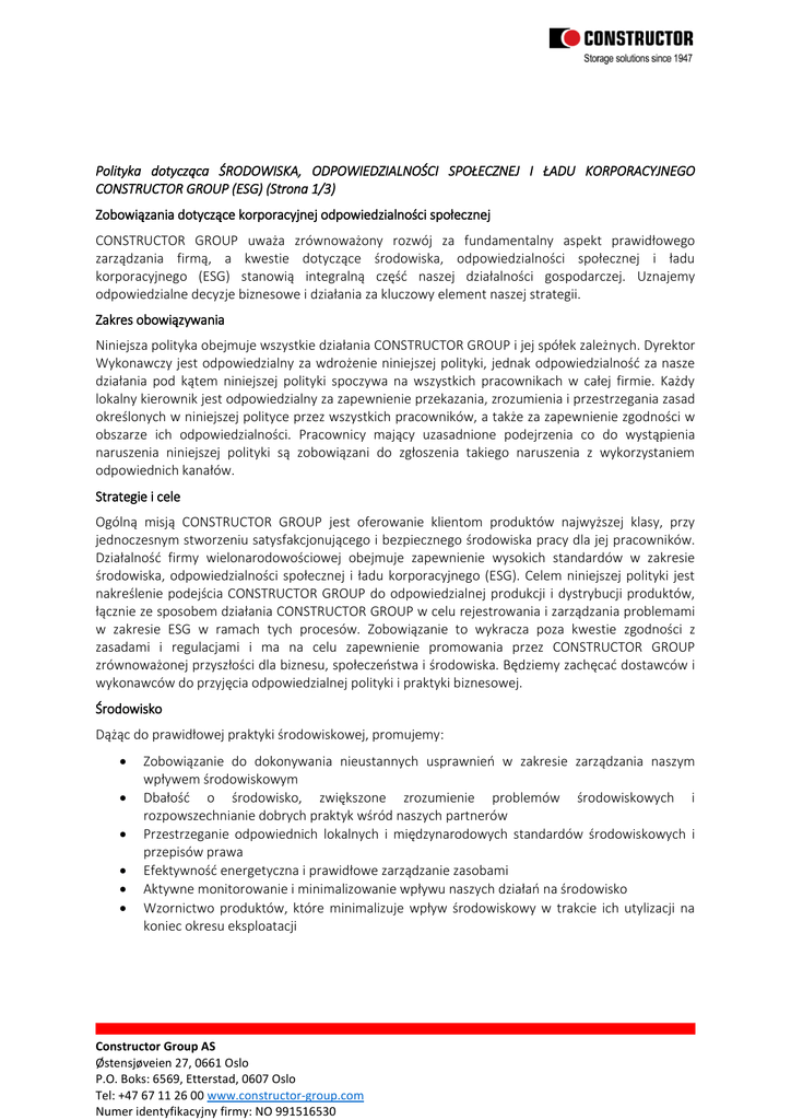 Polityka dotycząca ŚRODOWISKA, ODPOWIEDZIALNOŚCI SPOŁECZNEJ I ŁADU KORPORACYJNEGO CONSTRUCTOR GROUP (ESG) (Strona 1/3) Zobowiązania dotyczące korporacyjnej odpowiedzialności społecznej CONSTRUCTOR GROUP uważa zrównoważony rozwój za fundamentalny aspekt prawidłowego zarządzania firmą, a kwestie dotyczące środowiska, odpowiedzialności społecznej i ładu korporacyjnego (ESG) stanowią integralną część naszej działalności gospodarczej. Uznajemy odpowiedzialne decyzje biznesowe i działania za kluczowy element naszej strategii. Zakres obowiązywania Niniejsza polityka obejmuje wszystkie działania CONSTRUCTOR GROUP i jej spółek zależnych. Dyrektor Wykonawczy jest odpowiedzialny za wdrożenie niniejszej polityki, jednak odpowiedzialność za nasze działania pod kątem niniejszej polityki spoczywa na wszystkich pracownikach w całej firmie. Każdy lokalny kierownik jest odpowiedzialny za zapewnienie przekazania, zrozumienia i przestrzegania zasad określonych w niniejszej polityce przez wszystkich pracowników, a także za zapewnienie zgodności w obszarze ich odpowiedzialności. Pracownicy mający uzasadnione podejrzenia co do wystąpienia naruszenia niniejszej polityki są zobowiązani do zgłoszenia takiego naruszenia z wykorzystaniem odpowiednich kanałów. Strategie i cele Ogólną misją CONSTRUCTOR GROUP jest oferowanie klientom produktów najwyższej klasy, przy jednoczesnym stworzeniu satysfakcjonującego i bezpiecznego środowiska pracy dla jej pracowników. Działalność firmy wielonarodowościowej obejmuje zapewnienie wysokich standardów w zakresie środowiska, odpowiedzialności społecznej i ładu korporacyjnego (ESG). Celem niniejszej polityki jest nakreślenie podejścia CONSTRUCTOR GROUP do odpowiedzialnej produkcji i dystrybucji produktów, łącznie ze sposobem działania CONSTRUCTOR GROUP w celu rejestrowania i zarządzania problemami w zakresie ESG w ramach tych procesów. Zobowiązanie to wykracza poza kwestie zgodności z zasadami i regulacjami i ma na celu zapewnienie promowania przez CONSTRUCTOR GROUP zrównoważonej przyszłości dla biznesu, społeczeństwa i środowiska. Będziemy zachęcać dostawców i wykonawców do przyjęcia odpowiedzialnej polityki i praktyki biznesowej. Środowisko Dążąc do prawidłowej praktyki środowiskowej, promujemy: Zobowiązanie do dokonywania nieustannych usprawnień w zakresie zarządzania naszym wpływem środowiskowym Dbałość o środowisko, zwiększone zrozumienie problemów środowiskowych i rozpowszechnianie dobrych praktyk wśród naszych partnerów Przestrzeganie odpowiednich lokalnych i międzynarodowych standardów środowiskowych i przepisów prawa Efektywność energetyczna i prawidłowe zarządzanie zasobami Aktywne monitorowanie i minimalizowanie wpływu naszych działań na środowisko Wzornictwo produktów, które minimalizuje wpływ środowiskowy w trakcie ich utylizacji na koniec okresu eksploatacji Constructor Group AS Østensjøveien 27, 0661 Oslo P.O. Boks: 6569, Etterstad, 0607 Oslo Tel: +47 67 11 26 00 www.constructor-group.com Numer identyfikacyjny firmy: NO 991516530 Polityka dotycząca ŚRODOWISKA, ODPOWIEDZIALNOŚCI SPOŁECZNEJ I ŁADU KORPORACYJNEGO CONSTRUCTOR GROUP (ESG) (Strona 2/3) Kwestie społeczne / prawa człowieka W nawiązaniu do praktyk dotyczących prac i praw człowieka oczekujemy i zachęcamy do: • • • • • • • • • Bezpiecznych i zdrowych warunków pracy Świadomości i zgodności z międzynarodowymi konwencjami dotyczącymi praw człowieka Unikania dyskryminacji lub szykanowania z powodu wieku, przynależności rasowej, płci, przekonań religijnych, orientacji seksualnej, niepełnosprawności, narodowości, działalności w związku zawodowym lub jakiegokolwiek innego czynnika Szanowania prawa pracownika do swobody zrzeszeń i zawierania układów zbiorowych zgodnie z lokalnym prawem pracy Jednoznacznej „zerowej tolerancji” dla pracy dzieci i pracy niewolniczej w naszych oddziałach na całym świecie; nie tolerujemy pracy niewolniczej i pracy dzieci również w naszym łańcuchu dostaw Godzin pracy, które są zgodne z wytycznymi branży i krajowymi standardami, o ile istnieją, oraz unikania ich nadmiaru Rekrutacji i rozwoju kariery w oparciu wyłącznie o indywidualne kompetencje merytoryczne Środowiska pracy, w którym istnieje wzajemne zaufanie i poszanowanie oraz w którym każda osoba czuje się odpowiedzialna za wyniki i reputację naszej firmy Naszych pracowników do realizowania ich potencjału Ład korporacyjny W kontekście perspektywy ESB zobowiązujemy się do przestrzegania i promowania następujących aspektów ładu korporacyjnego: • • • • • • • Wysokie standardy etyki biznesowej i uczciwości Zerowa tolerancja dla korupcji i całkowite przestrzeganie obowiązujących przepisów prawa i regulacji w zakresie korupcji, zwalczania oszustw, zwalczania prania pieniędzy i unikania podatków Przestrzeganie obowiązujących przepisów antytrustowych i przepisów o konkurencji Wspieranie gospodarczego i społecznego rozwoju w krajach i społecznościach, w których prowadzimy działalność Szanowanie uzasadnionych interesów osób trzecich, z którymi współpracujemy w ramach naszej działalności Przestrzeganie przepisów prawa i regulacji obowiązujących w każdym miejscu, w którym prowadzimy działalność Przestrzeganie stosownych zasad regulujących ochronę danych w każdym kraju, w którym działamy Constructor Group AS Østensjøveien 27, 0661 Oslo P.O. Boks: 6569, Etterstad, 0607 Oslo Tel: +47 67 11 26 00 www.constructor-group.com Numer identyfikacyjny firmy: NO 991516530 Polityka dotycząca ŚRODOWISKA, ODPOWIEDZIALNOŚCI SPOŁECZNEJ I ŁADU KORPORACYJNEGO CONSTRUCTOR GROUP (ESG) (Strona 3/3) Bezpieczeństwo i higiena pracy • • • • • • Bezpieczeństwo pracowników i klientów Constructor Group ma najwyższe znaczenie; wszystkie oddziały przemysłowe i biurowe będą posiadać skuteczne