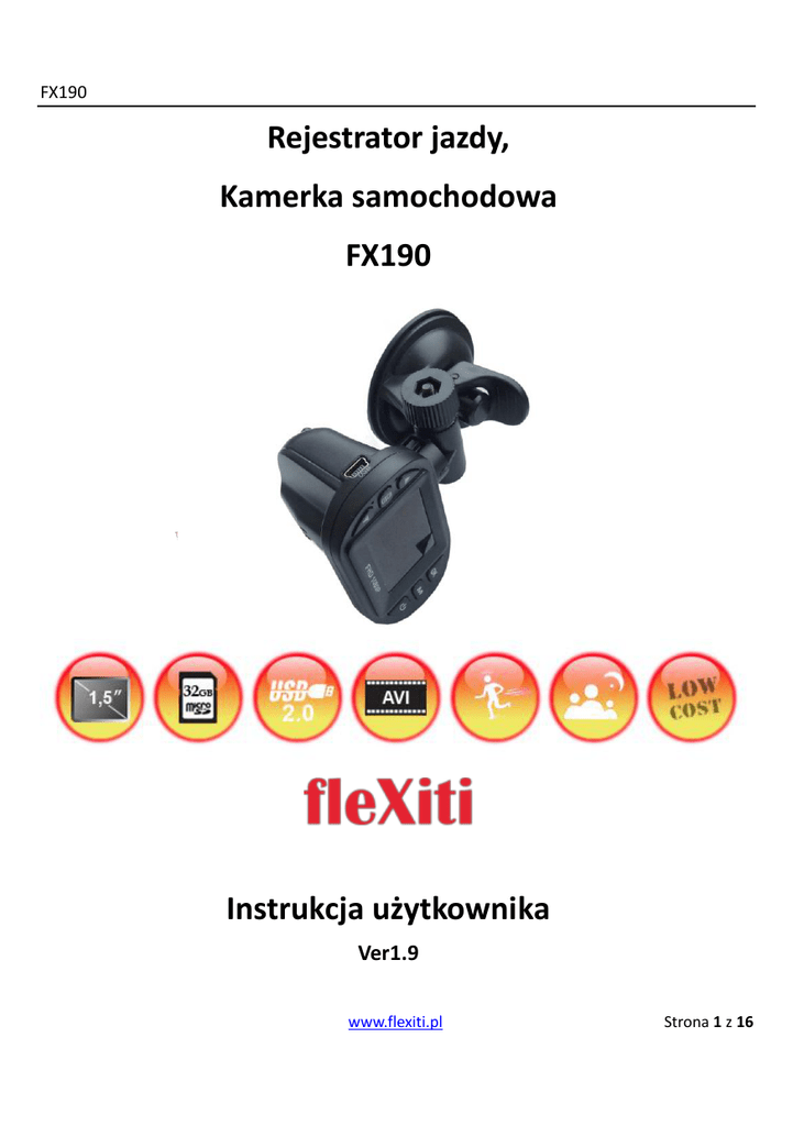 FX190 Rejestrator jazdy, Kamerka samochodowa FX190 Instrukcja użytkownika Ver1.9 www.flexiti.pl Strona 1 z 16 FX190 Wstęp Cyfrowa kamera FX190 HD (wysokiej rozdzielczości) jest wykonana z wykorzystaniem najnowszych technologii. Może służyć zarówno, jako kamera HD, kamerka PC jak również jako profesjonalna kamerka samochodowa. Kamerka samochodowa (nazywana też rejestrator jazdy lub wideo rejestrator) nagrywa w rozdzielczości do 1920x1080 pikseli. Używając karty MicroSD jako pamięci do przechowywania nagrań, przy równoczesnym małym poborze energii, kamera HD może nagrywać obraz wideo, audio i robić zdjęcia, po czym zapisywać je na karcie pamięci.. Wideo może być sprawdzane bezpośrednio na wyświetlaczu, a oglądane na ekranie telewizora podłączonego za pomocą kabla HDMI, lub przeglądane i kopiowane za pomocą komputera. Podłączona do komputera może pełnić również rolę kamerki WEB, np. Skype. Uwaga: Kamerka nie jest produktem wodoodpornym, wobec czego powinna być instalowana i użytkowana tylko i wyłącznie wewnątrz samochodu lub w pomieszczeniu. www.flexiti.pl Strona 2 z 16 FX190 Zawartość opakowania kamerka FX190 Przykładowy montaż rejestratora FX190 w samochodzie www.flexiti.pl Strona 3 z 16 FX190 1. Instrukcja instalacji i. Wyłącz silnik samochodu lub odłącz kamerę od zasilania. ii. Włóż kartę SD w slot. [Uwaga] Sugerujemy użycie karty SD klasa 6 lub wyższa, i o pojemności nie mniejszej niż 1 GB. Urządzenie obsługuje karty SD o pojemności 32GB maksymalnie. [Uwaga] Należy dobrze umyć szybę samochodu nim przylepisz uchwyt. Zabrudzona I wilgotna szyba może powodować że uchwyt będzie się odklejał. iii. Podłącz kamerę na stałe do instalacji 12V lub do gniazda zapalniczki dołączonym przewodem. W każdym wypadku niezbędne jest użycie zasilacza zamontowanego w dostarczonym wtyku do gniazda zapalniczki.(zamiana 12V na 5V) [Uwaga] Kabel zasilający USB nie powinien zwisać na przedniej szybie samochodu. iv. Zależnie od potrzeb wyreguluj ustawienie kamery. v. Uruchom silnik. [Uwaga] Jeśli kamera jest ustawiona I zainstalowana prawidłowo, kamera automatycznie wejdzie w tryb nagrywania w momencie uruchomienia silnika. Sprawdź na ekranie LCD obraz, dostosuj również ustawienia dostępne w Menu urządzenia. Przydatne informacje Aby nagrania z kamerki były prawidłowe i bez zacięć należy zastosować dobrej jakości kartę MicroSD, o dużej prędkości zapisu. Czytaj więcej tu... Dobrze zaprogramowana kamerka samochodowa po uruchomieniu samochodu zaczyna automatycznie rejestrację, a kończy kilkanaście sekund po wyłączeniu silnika (nie wymaga ingerencji) Uaktywnienie opcji wykrywania ruchu może spowodować nieciągłość nagrania, gdyż kamerka nagrywać będzie tylko w przypadku wykrycia ruchu. Tryb ten pozwala oszczędzać miejsce na karcie SD, jednakże nie zapewnia ciągłości. Kamera automatycznie nagrywa wszystkie nagranie w trybie cyklicznym. Oznacza to że w przypadku braku wolnego miejsca kasowane będą najstarsze nagrania, a w ich miejsce nagrywane nowe. Kamera zaopatrzona jest również w detekcję niskiego napięcia baterii, i w razie wykrycia takiej sytuacji automatycznie kończy zapis. Funkcja G-sensor może być aktywowana z Menu. W takiej sytuacji kamera mierzy przyśpieszenie we wszystkich kierunkach, i w razie wykrycia kolizji automatycznie zabezpiecza przed utratą nagranie 10s przed zdarzeniem oraz 20s po zdarzeniu. Ten fragment nie będzie nadpisany poprzez nowe nagrania. Umiejscowienie kamerki za lusterkiem powoduje że kamerka nie przeszkadza kierowcy w czasie jazdy, a równocześnie doskonale nagrywa. Nie każdy obszar okna samochodu jest wycierany wycieraczką, należy na to zwrócić uwagę w czasie montażu. Szyba samochodu, szczególnie przyciemniana może powodować refleksy i odbicia deski rozdzielczej, dlatego należy starać się umieścić obiektyw kamery jak najbliżej szyby samochodu. Doświetlenie nocne, czy też nazywane inaczej "night vision" jest tylko elementem marketingu Chińskich producentów. Zakres takiego doświetlenia zamyka się w obszarze do 1 metra (a czasami dużo mniej) i jego funkcjonalność jest znikoma. Nie są nam znane kamerki samochodowe które rzeczywiście "widzą" w nocy (kamery noktowizyjne to potrafią, jest to jednak zupełnie inna półka cenowa).Jakość obrazu nocą zależeć będzie głównie od oświetlenia zewnętrznego np. lampy uliczne, reflektory samochodów. www.flexiti.pl Strona 4 z 16 FX190 Cechy rejestratora: Szerokokątny obiektyw o kącie widzenia 120 stopni. Rozdzielczość: do 1920×1080P FULL HD . Zaawansowany kodek kompresji AVI Aparat do wykonywania pojedynczych zdjęć 4X zoom cyfrowy, ostrość od 12cm do nieskończoności. 1.5 calowy wyświetlacz LCD, podgląd w czasie nagrywania. Diody podświetlania dla nagrań przy słabym oświetleniu.( Flash Light) Obrotowy uchwyt mocujący 5 rodzajów jakości nagrywanego materiału wideo. 25 ramek na sekundę zapewnia płynny obraz wideo. Specjalny samochodowy uchwyt mocujący do szyby z przyssawką. Czujnik przyśpieszenia: G-sensor Zabezpieczenie nagrań, nawet w przypadku nagłego wypadku nagrania wideo są zabezpieczone. Spójność nagrań wideo (brak przerw w nagraniach). Zasilanie bezpośrednio z gniazdka zapalniczki, szybkie podłączenie I nagrywanie w czasie jazdy. Automatyczne uruchamianie nagrywania w momencie uruchomienia silnika (również automatyczne wyłączanie po jego wyłączenia) Nagrywanie w pętli, z możliwością ustawienia długości fragmentów wideo. Możliwość sprawdzania wideo w czasie nagrywania. Nagrywanie daty i czasu na nagranym materiale wideo. Ustawiany czas nagrywanych sekwencji wideo. Funkcja zdjęć Ładowanie akumulatorka poprzez złącze USB. Nagrywania na karcie Micro SD, do 32GB pojemności. www.flexiti.pl Strona 5 z 16 FX190 Opis przycisków i złączy Funkcje przycisków Przycisk TRYB : W czasie oczekiwania przycisk służy do zmiany t