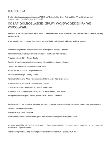 IPA POLSKA Źródło: http://ipapolska.pl/ipa/aktualnosci/724,XX-LAT-Dolnoslaskiej-Grupy-Wojewodzkiej-IPA-we-Wroclawiu.html Wygenerowano: Wtorek, 7 marca 2017, 11:37 XX LAT DOLNOŚLĄSKIEJ GRUPY WOJEWÓDZKIEJ IPA WE WROCŁAWIU! W dniach 03 – 05 października 2014 r. DGW IPA we Wrocławiu obchodziła dwudziestolecie swojej działalności. W obchodach – poza członkami IPA z terenu Dolnego Śląska – udział wzięli także nasi goście w osobach: Komendant Wojewódzki Policji we Wrocławiu - nadinspektor Wojciech Ołdyński; Komendant Placówki Straży Granicznej w Kłodzku - kapitan SG Piotr Piekarski; Prezydent Jeleniej Góry – Marcin Zawiła; Dyrektor Wydziału Zarządzania Kryzysowego w jeleniej Górze – Andrzej Marczak; Dyrektor Aeroklubu Jeleniogórskiego - Jacek Musiał; Prezes „Term Cieplickich” - Zbigniew Kubiela; Pan Dariusz Stolarczyk – z firmy Tauron; Komendant Powiatowy Policji w Jabloncu (Republika Czeska) – Petr Sikola wraz z przedstawicielem IPA Czechy – kolegą Jerzym Taficuk; Przedstawiciel IPA Cottbus (Niemcy) – kolega Torsten Roch; Przewodniczący Zarządu Wojewódzkiego NSZZP we Wrocławiu - Piotr Malon; Zastepca Dyrektora Szpitala MSW w Jeleniej Górze – Renata Ostrowska. Sekcję Polską IPA reprezentował Sekretarz Generalny Arkadiusz Skrzypczak. Obecni byli także prezesi grup wojewódzkich: Łódzkiej – kolega Jan Kuropatwa; Śląskiej - kolega Paweł Pasternak; Wielkopolskiej – kolega Witold Drzażdżyński pełniący także funkcję I Wiceprezydenta SP IPA. Uroczystą galę, która odbyła się w hotelu „Las” w Piechowicach (obiekcie rekomendowanym przez IPA) otworzył i prowadził Prezes DGW – Fryderyk Orepuk. Po oficjalnym powitaniu gości dokonał prezentacji członków Prezydium i Zarządu DGW IPA. Następnie kolega Zbigniew Markowski przedstawił historię działalności naszego stowarzyszenia na Dolnym Śląsku w ciągu całego dwudziestolecia. Po tej prezentacji kolega Leszek Kulik – sekretarz kapituły do spraw odznaczenia „Za zasługi dla sekcji polskiej IPA” odczytał Uchwałę Krajowego Zarządu SP IPA mocą której koledzy: Janusz Konopnicki, Marek Miś i Leszek Szczucki wyróżnieni zostali tym odznaczeniem. Odznaczenia te otrzymali oni z rąk Prezydenta Sekcji Polskiej IPA Fryderyka Orepuka i Komendanta Wojewódzkiego Policji we Wrocławiu nadinspektora Wojciecha Ołdyńskiego. Koledzy Marek Miś, Tadeusz Chołodecki i Zbigniew Markowski otrzymali także Certyfikaty XX i X– letniej przynależności do IPA wraz z odznakami. Wszyscy goście otrzymali także pamiątkowe ryngrafy, Uroczystość uświetnił pokaz sztuki walki w wykonaniu uczennicy Liceum o profilu policyjnym w Piechowicach – Angeliki Soliłło. Angelika poza sztukami walki bardzo ładnie śpiewa o czym mogliśmy przekonać się podczas uroczystego obiadu. Wykonała ona dla gości kilka utworów, a oprawę muzyczną wieczoru zabezpieczył kolega Zbigniew Klimek. Kolejnego dnia nasi goście udali się na wycieczkę podczas której przy pięknej, słonecznej, jesiennej pogodzie podziwiać mogli uroki Karkonoszy ze szczytu Szrenicy, a niektórzy z najwyższego szczytu Karkonoszy – Śnieżki. Po południu wszyscy spotkaliśmy się ponownie w miasteczku „Western City” w Ścięgnach gdzie czekała na nas niespodzianka w postaci inscenizacji napadu na bank, jaki do tej pory mogliśmy oglądać jedynie na filmach kowbojskich. Napad skończył się happy endem więc wszyscy mogliśmy spróbować pieczonego karczku , kaszanki i kiełbasek z grilla i nabrać sił przed kolacją serwowaną w hotelu „Las”. Po kolacji długo trwały jeszcze spotkania w podgrupach podczas których snuto wspomnienia i planowano działalność na następne lata. Organizatorzy w tym miejscu pragną podziękować partnerom bez których nie byłoby możliwym zorganizowanie tych obchodów. Partnerami naszymi byli: Prezydent Jeleniej Góry – Pan Marcin Zawiła, Karkonoski Park Narodowy, Firma „Termy Cieplickie”, Tauron Obsługa Klienta, DUDA Holding, Biuro Ochrony Ranger sp. z o.o, Jerzy Pokój – właściciel miasteczka „Western City”, rekomendowany przez Sekcję Polską IPA hotel „Las” w Piechowicach” , firma „Chadży” z Jeleniej Góry oraz spółka WAM ze Złotego Stoku. Serdecznie dziękujemy! Zdjęcia ; Sebastian Toporowski Tekst: Fryderyk Orepuk Ocena: 0/5 (0) Tweetnij