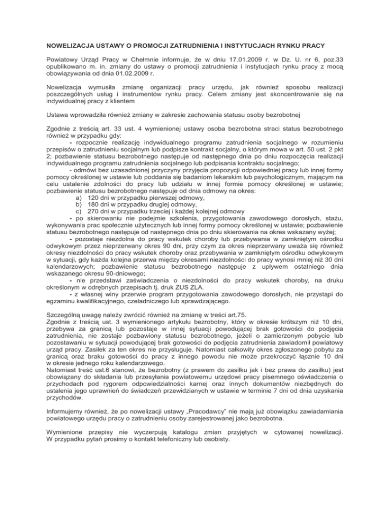 NOWELIZACJA USTAWY O PROMOCJI ZATRUDNIENIA I INSTYTUCJACH RYNKU PRACY Powiatowy Urząd Pracy w Chełmnie informuje, że w dniu 17.01.2009 r. w Dz. U. nr 6, poz.33 opublikowano m. in. zmiany do ustawy o promocji zatrudnienia i instytucjach rynku pracy z mocą obowiązywania od dnia 01.02.2009 r. Nowelizacja wymusiła zmianę organizacji pracy urzędu, jak również sposobu realizacji poszczególnych usług i instrumentów rynku pracy. Celem zmiany jest skoncentrowanie się na indywidualnej pracy z klientem Ustawa wprowadziła również zmiany w zakresie zachowania statusu osoby bezrobotnej Zgodnie z treścią art. 33 ust. 4 wymienionej ustawy osoba bezrobotna straci status bezrobotnego również w przypadku gdy: - rozpocznie realizację indywidualnego programu zatrudnienia socjalnego w rozumieniu przepisów o zatrudnieniu socjalnym lub podpisze kontrakt socjalny, o którym mowa w art. 50 ust. 2 pkt 2; pozbawienie statusu bezrobotnego następuje od następnego dnia po dniu rozpoczęcia realizacji indywidualnego programu zatrudnienia socjalnego lub podpisania kontraktu socjalnego; - odmówi bez uzasadnionej przyczyny przyjęcia propozycji odpowiedniej pracy lub innej formy pomocy określonej w ustawie lub poddania się badaniom lekarskim lub psychologicznym, mającym na celu ustalenie zdolności do pracy lub udziału w innej formie pomocy określonej w ustawie; pozbawienie statusu bezrobotnego następuje od dnia odmowy na okres: a) 120 dni w przypadku pierwszej odmowy, b) 180 dni w przypadku drugiej odmowy, c) 270 dni w przypadku trzeciej i każdej kolejnej odmowy - po skierowaniu nie podejmie szkolenia, przygotowania zawodowego dorosłych, stażu, wykonywania prac społecznie użytecznych lub innej formy pomocy określonej w ustawie; pozbawienie statusu bezrobotnego następuje od następnego dnia po dniu skierowania na okres wskazany wyżej; - pozostaje niezdolna do pracy wskutek choroby lub przebywania w zamkniętym ośrodku odwykowym przez nieprzerwany okres 90 dni, przy czym za okres nieprzerwany uważa się również okresy niezdolności do pracy wskutek choroby oraz przebywania w zamkniętym ośrodku odwykowym w sytuacji, gdy każda kolejna przerwa między okresami niezdolności do pracy wynosi mniej niż 30 dni kalendarzowych; pozbawienie statusu bezrobotnego następuje z upływem ostatniego dnia wskazanego okresu 90-dniowego; - nie przedstawi zaświadczenia o niezdolności do pracy wskutek choroby, na druku określonym w odrębnych przepisach tj. druk ZUS ZLA. - z własnej winy przerwie program przygotowania zawodowego dorosłych, nie przystąpi do egzaminu kwalifikacyjnego, czeladniczego lub sprawdzającego. Szczególną uwagę należy zwrócić również na zmianę w treści art.75. Zgodnie z treścią ust. 3 wymienionego artykułu bezrobotny, który w okresie krótszym niż 10 dni, przebywa za granicą lub pozostaje w innej sytuacji powodującej brak gotowości do podjęcia zatrudnienia, nie zostaje pozbawiony statusu bezrobotnego, jeżeli o zamierzonym pobycie lub pozostawaniu w sytuacji powodującej brak gotowości do podjęcia zatrudnienia zawiadomił powiatowy urząd pracy. Zasiłek za ten okres nie przysługuje. Natomiast całkowity okres zgłoszonego pobytu za granicą oraz braku gotowości do pracy z innego powodu nie może przekroczyć łącznie 10 dni w okresie jednego roku kalendarzowego. Natomiast treść ust.6 stanowi, że bezrobotny (z prawem do zasiłku jak i bez prawa do zasiłku) jest obowiązany do składania lub przesyłania powiatowemu urzędowi pracy pisemnego oświadczenia o przychodach pod rygorem odpowiedzialności karnej oraz innych dokumentów niezbędnych do ustalenia jego uprawnień do świadczeń przewidzianych w ustawie w terminie 7 dni od dnia uzyskania przychodów. Informujemy również, że po nowelizacji ustawy „Pracodawcy” nie mają już obowiązku zawiadamiania powiatowego urzędu pracy o zatrudnieniu osoby zarejestrowanej jako bezrobotna. Wymienione przepisy nie wyczerpują katalogu zmian przyjętych w cytowanej nowelizacji. W przypadku pytań prosimy o kontakt telefoniczny lub osobisty. INFORMACJA DLA OSÓB BEZROBOTNYCH ZGŁASZAJĄCYCH WYJAZD LUB INNĄ SYTUACJĘ POWODUJĄCĄ BRAK GOTOWOŚCI DO PODJĘCIA PRACY Powiatowy Urząd Pracy w Chełmnie informuje, że w wyniku nowelizacji ustawy o promocji zatrudnienia i instytucjach rynku pracy (Dz.U. z 2009 r. Nr 6 poz. 33) z dniem 01.02.2009r. uległa zmianie treść art. 75 ust. 3 ustawy o promocji zatrudnienia i instytucjach rynku pracy – tekst jednolity z 2008 r (Dz.U. Nr 69, poz.415 z póź. zm.), który stanowi, że osoba bezrobotna może przebywać za granicą lub pozostawać w innej sytuacji powodującej brak gotowości do podjęcia pracy w okresie krótszym niż 10 dni, jednak całkowity okres zgłoszonego wyjazdu lub braku gotowości do pracy z innego powodu nie może przekroczyć łącznie 10 dni w okresie jednego roku kalendarzowego. INFORMACJA DLA OSÓB BEZROBOTNYCH KORZYSTAJĄCYCH ZE ZWOLNIEŃ LEKARSKICH Powiatowy Urząd Pracy w Chełmnie informuje, że w wyniku nowelizacji ustawy o promocji zatrudnienia i instytucjach rynku pracy (Dz. U. z 2009 r. Nr 6 poz. 33) z dniem 01.02.2009 r. dodano treść art. 33 ust. 4 pkt 10 . ustawy o promocji zatrudnienia i instytucjach rynku pracy – tekst jednolity z 2008 r (Dz.U. Nr 69, poz.415 z póź. zm.), który stanowi, że podstawą usprawiedliwienia braku gotowości do podjęcia pracy z powodu choroby jest zaświadczenie lekarskie wydane na druku ZUS ZLA. Zaświadczenie wydane w innej formie nie będzie honorowane. Powiatowy Urząd Pracy w Chełmnie informuje także, że bezrobotny, który pozostaje niezdolny do pracy wskutek choroby lub przebywania w zamkniętym ośrodku odwykowym przez nieprzerwany okres 90 dni, przy czym za okres nieprzerwany uważa się również okresy niezdolności do pracy wskutek choroby oraz przebywania w zamkniętym ośrodku odwykowym w sytuacji, gdy każda kolejna przerwa między okresami niezdolności do pracy w