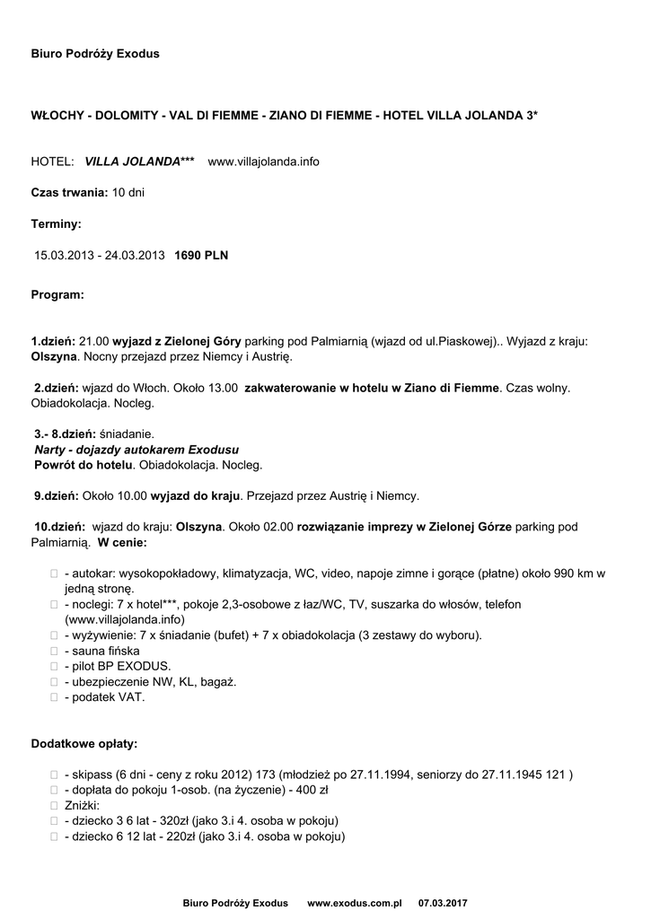 Biuro Podróży Exodus WŁOCHY - DOLOMITY - VAL DI FIEMME - ZIANO DI FIEMME - HOTEL VILLA JOLANDA 3* HOTEL: VILLA JOLANDA*** www.villajolanda.info Czas trwania: 10 dni Terminy: 15.03.2013 - 24.03.2013 1690 PLN Program: 1.dzień: 21.00 wyjazd z Zielonej Góry parking pod Palmiarnią (wjazd od ul.Piaskowej).. Wyjazd z kraju: Olszyna. Nocny przejazd przez Niemcy i Austrię. 2.dzień: wjazd do Włoch. Około 13.00 zakwaterowanie w hotelu w Ziano di Fiemme. Czas wolny. Obiadokolacja. Nocleg. 3.- 8.dzień: śniadanie. Narty - dojazdy autokarem Exodusu Powrót do hotelu. Obiadokolacja. Nocleg. 9.dzień: Około 10.00 wyjazd do kraju. Przejazd przez Austrię i Niemcy. 10.dzień: wjazd do kraju: Olszyna. Około 02.00 rozwiązanie imprezy w Zielonej Górze parking pod Palmiarnią. W cenie: - autokar: wysokopokładowy, klimatyzacja, WC, video, napoje zimne i gorące (płatne) około 990 km w jedną stronę. - noclegi: 7 x hotel***, pokoje 2,3-osobowe z łaz/WC, TV, suszarka do włosów, telefon (www.villajolanda.info) - wyżywienie: 7 x śniadanie (bufet) + 7 x obiadokolacja (3 zestawy do wyboru). - sauna fińska - pilot BP EXODUS. - ubezpieczenie NW, KL, bagaż. - podatek VAT. Dodatkowe opłaty: - skipass (6 dni - ceny z roku 2012) 173 (młodzież po 27.11.1994, seniorzy do 27.11.1945 121 ) - dopłata do pokoju 1-osob. (na życzenie) - 400 zł Zniżki: - dziecko 3 6 lat - 320zł (jako 3.i 4. osoba w pokoju) - dziecko 6 12 lat - 220zł (jako 3.i 4. osoba w pokoju) Biuro Podróży Exodus www.exodus.com.pl 07.03.2017 - od 12 lat - 120zł (jako 3. i 4. osoba w pokoju) Biuro Podróży Exodus www.exodus.com.pl 07.03.2017
