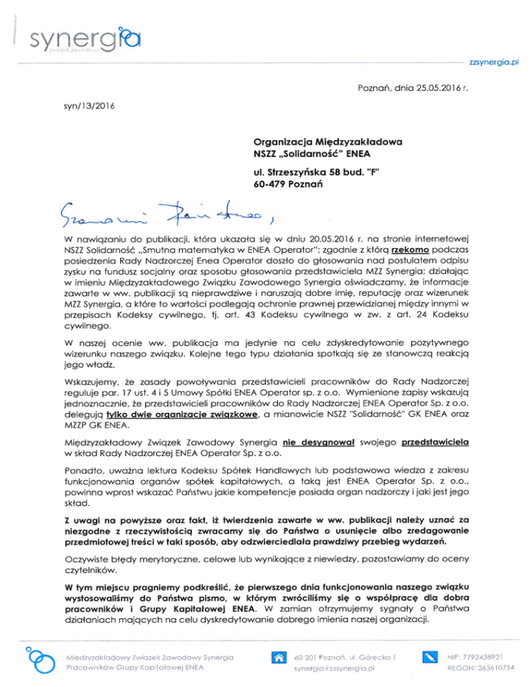 synęrgRi - --—--—-——— - zzsynergia.pl Poznań, dnia 25.05.2016 r. syn/13/2016 Organizacja Międzyzakładowa NSZZ „Solidarność” ENEA ul. Strzeszyńska 58 bud. „F 60-479 Poznań ) W nawiązaniu do publikacji, która ukazała się w dniu 20.05.2016 r. na stronie internetowej NSZZ Solidarność Smutna matematyka w ENEA Operator”; zgodnie z którą rzekomo podczas posiedzenia Rady Nadzorczej nea Operator doszło do głosowania nad postulatem odpisu zysku na fundusz socjalny oraz sposobu głosowania przedstawiciela MZZ Synergia; działając w imieniu Międzyzakładowego Związku Zawodowego Synergia oświadczamy, że informacje zawarte w ww. publikacji są nieprawdziwe i naruszają dobre imię, reputację oraz wizerunek MZZ Synergia, a które to wartości podlegają ochronie prawnej przewidzianej między innymi w przepisach Kodeksy cywilnego, tj. art. 43 Kodeksu cywilnego w zw. z art. 24 Kodeksu cywilnego. W naszej ocenie ww. publikacja ma jedynie na celu zdyskredytowanie pozytywnego wizerunku naszego związku. Kolejne tego typu działania spotkają się ze stanowczą reakcją jego władz. Wskazujemy, że zasady powoływania przedstawicieli pracowników do Rady Nadzorczej reguluje par. 17 ust. 4 i 5 Umowy Spółki ENEA Operator sp. z o.o. Wymienione zapisy wskazują jednoznacznie, że przedstawicieli pracowników do Rady Nadzorczej ENEA Operator Sp. z o.o. delegują tylko dwie organizacje zwigzkowe, a mianowicie NSZZ „Solidarność” OK ENA oraz MZZP OK ENEA. Międzyzakładowy Związek Zawodowy Synergia nie desygnował swojego przedstawiciela w skład Rady Nadzorczej NEA Operator Sp. z o.o. Ponadto, uważna lektura Kodeksu Spółek Handlowych lub podstawowa wiedza z zakresu funkcjonowania organów spółek kapitałowych, a taką jest NEA Operator Sp. z o.o., powinna wprost wskazać Państwu jakie kompetencje posiada organ nadzorczy i jaki jest jego skład. Z uwagi na powyższe oraz fakt, iż twierdzenia zawarte w ww. publikacji należy uznać za niezgodne z rzeczywistością zwracamy się do Państwa o usunięcie albo zredagowanie przedmiotowej treści w taki sposób, aby odzwierciedlała prawdziwy przebieg wydarzeń. Oczywiste błędy merytoryczne, celowe lub wynikające z niewiedzy, pozostawiamy do oceny czytelników. W tym miejscu pragniemy podkreślić, że pierwszego dnia funkcjonowania naszego związku wystosowaliśmy do Państwa pismo, w którym zwróciliśmy się o współpracę dla dobra pracowników i Grupy Kapitałowej ENEA. W zamian otrzymujemy sygnały o Państwa działaniach mających na celu dyskredytowanie dobrego imienia naszej organizacji. fyUedzyzakłado,y Zwazek Zay”odo”,”j”,” Synergia Pracowników Grupy Kapitalowej ENEA 60-201 Poznań ul. Górecka 1 NIP: 7792438921 synergia ózzsVnergia.pl REGON: 3636 10732 syr9ęrgb zzsynergia.pI Takie działania, prowadzące do ciągłych konfliktów, napięć i powstania nowego związku zawodowego. kłótni doprowadziły do Na koniec jeszcze raz zwracamy się do Państwa o usuniecie treści, które naruszają dobre imię, reputację oraz wizerunek MZZ Synergia. Dla trwałej, efektywnej współpracy dla dobra pracowników GK ENEA potrzebna jest sprzyjająca i życzliwa atmosfera. Apelujemy zatem o wspólne działanie, a nie przekłamywanie rzeczywistości. 2 MIĘDZYZ ŁADOWY Z IĄZEK Z PRA OWNIKÓ RUPYK I c ceprze Za\:ąd:z: ODOWY SYNERGIA AŁOWEJENEA ący u MIĘDZYZAKŁADOWY ZWIĄZEK ZAWODOWY SYNERGIA PRACOWNIKÓW GRUPY KAPITAŁOWEJ ENEA Czionek Zarządu Związku _— „ „ /„ ć- „Tadeusz Miklosz Miedzyzakładowy Zwigzek Zawodowy Synergio Pracownko Grupy Kapitalowej ENEA .„ 60-201 Poznań, uI. Górecko 1 rJp: 7792438921 synergia ózzs,neraki.pI REGCN:36361024