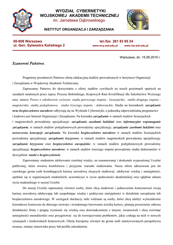 WYDZIAŁ CYBERNETYKI WOJSKOWEJ AKADEMII TECHNICZNEJ im. Jarosława Dąbrowskiego INSTYTUT ORGANIZACJI I ZARZĄDZANIA 00-908 Warszawa ul. Gen. Sylwestra Kaliskiego 2 tel./fax 261 83 95 24 www.wcy.wat.edu.pl www.ioz.wat.edu.pl Warszawa, dn. 15.06.2015 r. Szanowni Państwo, Pragniemy przedstawić Państwu ofertę edukacyjną studiów prowadzonych w Instytucie Organizacji i Zarządzania w Wojskowej Akademii Technicznej. Zapraszamy Państwa do skorzystania z oferty studiów cywilnych na trzech poziomach opartych na zasadach ustalonych przez zapisy Procesu Bolońskiego, Krajowych Ram Kwalifikacji dla Szkolnictwa Wyższego oraz ustawy Prawo o szkolnictwie wyższym: studia pierwszego stopnia - licencjackie, studia drugiego stopnia magisterskie, studia podyplomowe, studia trzeciego stopnia - doktoranckie. Studia na kierunkach: zarządzanie oraz bezpieczeństwo narodowe odbywają się na Wydziale Cybernetyki, a jednostką odpowiedzialną programowo i kadrowo jest Instytut Organizacji i Zarządzania. Na kierunku zarządzanie w ramach studiów licencjackich i magisterskich prowadzimy specjalizacje: zarządzanie zasobami ludzkimi oraz informacyjne wspomaganie zarządzania; w ramach studiów podyplomowych prowadzimy specjalizację: zarządzanie zasobami ludzkimi oraz nowoczesne koncepcje zarządzania. Na kierunku bezpieczeństwo narodowe w ramach studiów licencjackich prowadzimy specjalizację: zarządzanie kryzysowe; w ramach studiów magisterskich prowadzimy specjalizację: zarządzanie kryzysowe oraz bezpieczeństwo europejskie; w ramach studiów podyplomowych prowadzimy specjalizację: bezpieczeństwo narodowe; w ramach studiów trzeciego stopnia prowadzimy studia doktoranckie w dyscyplinie: nauki o bezpieczeństwie. Zapewniamy studentom zdobywanie rzetelnej wiedzy, na renomowanej i doskonale wyposażonej Uczelni publicznej, która stwarza komfortowe i przyjazne warunki studiowania. Nasza oferta adresowana jest do szerokiego grona osób kształtujących karierę zawodową chcących studiować, zdobywać wiedzę i umiejętności, spełniać się w organizacjach studenckich, uczestniczyć w życiu społeczności akademickiej oraz zgłębiać arkana życia studenckiego w naszej Uczelni. Do naszej Uczelni zapraszamy również osoby, które chcą studiować i jednocześnie kontynuować swoją karierę zawodową zdobywając lub uzupełniając wiedzę i praktyczne umiejętności w dziedzinie zarządzania lub bezpieczeństwa narodowego. W szeregach słuchaczy mile widziane są osoby, które chcą zdobyć wykształcenie kierunkowe konieczne do dalszego rozwoju i świadomego kierowania ścieżką kariery, planują poszerzenie zakresu działalności firmy i pragną wymienić się wiedzą oraz doświadczeniem z innymi, awansowali i chcą rozwinąć umiejętności menedżerskie oraz przygotować się do rozwiązywania problemów, jakie czekają na nich w nowych sytuacjach i środowiskach biznesowych. Ofertę kierujemy również do grona osób zmotywowanych perspektywą awansu, zmiany stanowiska pracy lub profilu zatrudnienia. Absolwenci naszej Uczelni mogą liczyć na ciekawe perspektywy zawodowe zdobywając interesującą pracę zarówno w biznesie jak i w administracji publicznej. Wyróżniającą cechą naszej oferty jest wyposażenie studentów w ponadprzeciętną wiedzę i kompetencje z zakresu wykorzystania technologii teleinformatycznej w zarządzaniu. Kompleksowa wiedza dotyczącą aspektów zarządzania przedsiębiorstwem oraz umiejętności stosowania nowoczesnych metod i technik zarządzania są niewątpliwym atutem Absolwentów na obecnym rynku pracy. Ponadto Wojskowa Akademia Techniczna wychodząc naprzeciw oczekiwaniom studentów zawarła porozumienia o współpracy z wiodącymi na rynku instytucjami biznesowymi oraz instytucjami sektora państwowego, co sprawiło zwiększenie konkurencyjności naszej Uczelni w ramach rozwoju współpracy nauki z praktyką. Uczestnicy studiów trzeciego stopnia oraz studiów podyplomowych mogą liczyć na wymianę doświadczeń między wykładowcami i słuchaczami pełniącymi funkcje na szczeblach menedżerskich w firmach i instytucjach reprezentujących różne branże. Mają możliwości nawiązania szerokich kontaktów biznesowych o strategicznym znaczeniu dla firm oraz karier zawodowych, które sprzyjają rozwojowi firmy i osób ją reprezentujących. Studia w Wojskowej Akademii Technicznej są kluczem do rozwoju kariery, pomagają w realizacji założonych celów, spełnianiu marzeń i rozwoju zainteresowań, poszerzają horyzonty, uzupełniają wiedzę, doskonalą umiejętności. Oprócz tego są nieocenionym źródłem nowych kontaktów biznesowych i towarzyskich. Ponadto organizacje sektora publicznego i prywatnego umożliwiając swoim pracownikom podnoszenie kwalifikacji w naszej Uczelni niewątpliwie zwiększą poziom efektywności pracy a tym samym staną się konkurencyjne na rynku. Osoby, które posiadają dyplom ukończenia studiów w Wojskowej Akademii Technicznej odczuwają osobistą satysfakcję z posiadania dyplomu Uczelni z tradycjami. Ważnym atutem studiowania w Wojskowej Akademii Technicznej jest lokalizacja. Uczelnia mieści się blisko centrum Warszawy, w otoczeniu malowniczego krajobrazu otuliny Puszczy Kampinoskiej. Praca i studia na naszej uczelni mają unikatową atmosferę. Kompletny kampus akademicki wraz z zespołem domów studenckich i obiektów sportowo-rekreacyjnych to jeden z ważniejszych atutów naszej Akademii. Pragnąc w Wojskowej przybliżyć Akademii Państwu więcej Technicznej, szczegółów zapraszamy naszej do oferty odwiedzenia edukacyjnej studiów stron:www.wat.edu.pl oraz www.wcy.wat.edu.pl. Jednocześnie w załączeniu przesyłamy Państwu plakat promujący naszą ofertę. Pozostając z wyrazami szacunku i uznania Dyrektor Instytutu Organizacji i Zarządzania Wydziału Cybernetyki Wojskowej Akademii Technicznej dr hab. inż. Włodzimierz Miszalski, prof. WAT