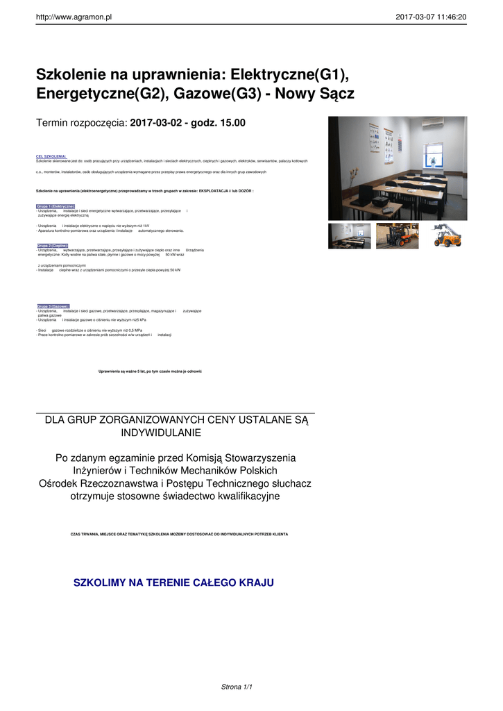 http://www.agramon.pl 2017-03-07 11:46:20 Szkolenie na uprawnienia: Elektryczne(G1), Energetyczne(G2), Gazowe(G3) - Nowy Sącz Termin rozpoczęcia: 2017-03-02 - godz. 15.00 CEL SZKOLENIA: Szkolenie skierowane jest do: osób pracujących przy urządzeniach, instalacjach i sieciach elektrycznych, cieplnych i gazowych, elektryków, serwisantów, palaczy kotłowych c.o., monterów, instalatorów, osób obsługujących urządzenia wymagane przez przepisy prawa energetycznego oraz dla innych grup zawodowych Szkolenie na uprawnienia (elektroenergetyczne) przeprowadzamy w trzech grupach w zakresie: EKSPLOATACJA i/ lub DOZÓR : Grupa 1 (Elektryczne): - Urządzenia, instalacje i sieci energetyczne wytwarzające, przetwarzające, przesyłające zużywające energię elektryczną i - Urządzenia i instalacje elektryczne o napięciu nie wyższym niż 1kV - Aparatura kontrolno-pomiarowa oraz urządzenia i instalacje automatycznego sterowania. Grupa 2 (Cieplne): - Urządzenia, wytwarzające, przetwarzające, przesyłające i zużywające ciepło oraz inne Urządzenia energetyczne: Kotły wodne na paliwa stałe, płynne i gazowe o mocy powyżej 50 kW wraz z urządzeniami pomocniczymi - Instalacje cieplne wraz z urządzeniami pomocniczymi o przesyle ciepła powyżej 50 kW Grupa 3 (Gazowe): - Urządzenia, instalacje i sieci gazowe, przetwarzające, przesyłające, magazynujące i paliwa gazowe - Urządzenia i instalacje gazowe o ciśnieniu nie wyższym niż5 kPa - Sieci gazowe rozdzielcze o ciśnieniu nie wyższym niż 0,5 MPa - Prace kontrolno-pomiarowe w zakresie prób szczelności w/w urządzeń i zużywające instalacji Uprawnienia są ważne 5 lat, po tym czasie można je odnowić DLA GRUP ZORGANIZOWANYCH CENY USTALANE SĄ INDYWIDULANIE Po zdanym egzaminie przed Komisją Stowarzyszenia Inżynierów i Techników Mechaników Polskich Ośrodek Rzeczoznawstwa i Postępu Technicznego słuchacz otrzymuje stosowne świadectwo kwalifikacyjne CZAS TRWANIA, MIEJSCE ORAZ TEMATYKĘ SZKOLENIA MOŻEMY DOSTOSOWAĆ DO INDYWIDUALNYCH POTRZEB KLIENTA SZKOLIMY NA TERENIE CAŁEGO KRAJU Strona 1/1