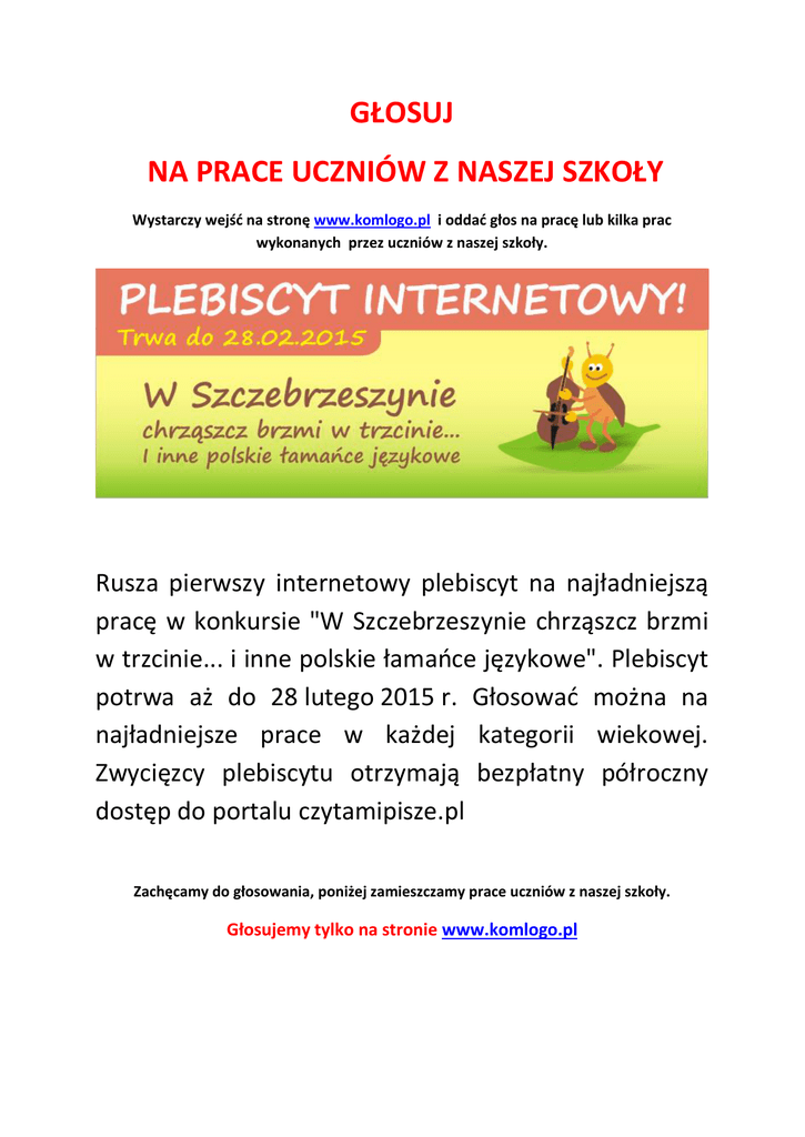 GŁOSUJ NA PRACE UCZNIÓW Z NASZEJ SZKOŁY Wystarczy wejść na stronę www.komlogo.pl i oddać głos na pracę lub kilka prac wykonanych przez uczniów z naszej szkoły. Rusza pierwszy internetowy plebiscyt na najładniejszą pracę w konkursie "W Szczebrzeszynie chrząszcz brzmi w trzcinie... i inne polskie łamańce językowe". Plebiscyt potrwa aż do 28 lutego 2015 r. Głosować można na najładniejsze prace w każdej kategorii wiekowej. Zwycięzcy plebiscytu otrzymają bezpłatny półroczny dostęp do portalu czytamipisze.pl Zachęcamy do głosowania, poniżej zamieszczamy prace uczniów z naszej szkoły. Głosujemy tylko na stronie www.komlogo.pl Maja Poznańska Jagoda Studzińska Róża Mazur Krzysztof Charkot Piotr Wolicki Aleksandra Wanat Amelia Świstek Aleksandra Nizio Weronika Bobrowska Zofia Banach Agata Zabiciel Amelia Świstek Dawid Siurek Kamil Szyszka Oliwier Jakubiec Wiktoria Bożek Wiktoria Ciurysek Leonard Bożek Kelly Zgnilec Marita Cichosz Oliwia Batorska Natalia Harkot /przy wyszukiwaniu tej pracy trzeba wpisać Olwia Batorska/