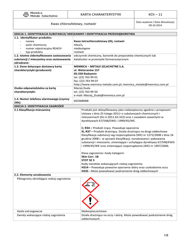 KARTA CHARAKTERYSTYKI Kwas chlorozłotowy, roztwór KCh – 11 Data wydania / Data Aktualizacji: 09.10.2014 SEKCJA 1. IDENTYFIKACJA SUBSTANCJI/ MIESZANINY I IDENTYFIKACJA PRZEDSIĘBIORSTWA 1.1. Identyfikator produktu: - nazwa Kwas tetrachlorozłotowy (III), roztwór - wzór chemiczny HAuCl4 niedostępne - numer rejestracyjny REACH roztwór - typ produktu 1.2. Istotne zidentyfikowane zastosowania odczynnik chemiczny, barwnik do preparatów chemicznych lub substancji / mieszaniny oraz zastosowania katalizator w przemyśle farmaceutycznym odradzane: 1.3. Dane dotyczące dostawcy karty MENNICA – METALE SZLACHETNE S.A. charakterystyki (producent) ul. Weteranów 157 05-250 Radzymin tel. (22) 763 99 01 fax: (22) 763 99 07 http://www.mennica-metale.com.pl; [email protected] Osoba odpowiedzialna za kartę Maciej Duda charakterystyki: tel. (22) 763 99 50 e-mail: [email protected] 1.4. Numer telefonu alarmowego (czynny 603368068 24h): SEKCJA 2. IDENTYFIKACJA ZAGROŻEŃ 2.1 Klasyfikacja mieszaniny Produkt jest sklasyfikowany jako niebezpieczny zgodnie z przepisami Ustawy z dnia 25 lutego 2011r o substancjach chemicznych i mieszaninach (Dz.U.2011.63.322) oraz z zasadami zawartymi w dyrektywach 67/548/EWG i 1999/45/WE. C; R34 – Produkt żrący. Powoduje oparzenia Xi, R37 – Produkt drażniący. Działa drażniąco na drogi oddechowe Klasyfikacja substancji wg rozporządzenia (WE) nr 1272/2008 z dnia 16 grudnia 2008 r. w sprawie klasyfikacji, oznakowania i pakowania substancji i mieszanin, zmieniające i uchylające dyrektywy 67/548/EWG i 1999/45/WE oraz zmieniające rozporządzenie (WE) nr 1907/2006. Klasa zagrożenie i kody kategorii: Skin Corr. 1B STOT SE 3 Kody zwrotów wskazujących rodzaj zagrożenia: H314 – Powoduje poważne oparzenia skóry oraz uszkodzenia oczu H335 - Może powodować podrażnienie dróg oddechowych 2.2. Elementy oznakowania Piktogramy określające rodzaj zagrożenia Hasła ostrzegawcze Zwroty wskazujące rodzaj zagrożenia Niebezpieczeństwo Działa drażniąco na oczy i skórę. Może powodować podrażnienie dróg oddechowych. 1/8 KARTA CHARAKTERYSTYKI Data wydania / Data Aktualizacji: 09.10.2014 Kwas chlorozłotowy, roztwór Zwroty wskazujące środki ostrożności 2.3 Inne zagrożenia: SEKCJA 3. SKŁAD/INFORMACJA O SKŁADNIKACH KCh – 11 P260 – Nie wdychać par/rozpylonej cieczy. P280 – Stosować rękawice ochronne/odzież ochronną/ochronę oczu. P301+P330+P331 – W przypadku połknięcia: wypłukać usta. NIE wywoływać wymiotów. P303+P361+P353 – W przypadku kontaktu ze skórą: natychmiast usunąć/zdjąć całą zanieczyszczoną odzież. Spłukać skórę pod strumieniem wody/prysznicem. P304+P340 - W przypadku dostania się do dróg oddechowych: wyprowadzić lub wynieść poszkodowanego na świeże powietrze i zapewnić warunki do odpoczynku w pozycji umożliwiającej swobodne oddychanie. P305+P351+P338 - W przypadku dostania się do oczu: ostrożnie płukać wodą przez kilka minut. Wyjąć soczewki kontaktowe, jeśli są i można je łatwo usunąć. Nadal płukać. Brak danych Nazwa substancji Numery identyfikacyjne % wag. Kwas solny WE: 231-595-7 CAS: brak nr indeksowy: 017-002-01-X max. 20% Klasyfikacja rozp. (WE) Nr 67/548/EWG 1272/2008 [CLP] Skin Corr. 1B, H314 C, R34 STOT SE 3, H335 Xi, R37 Skin Irrit. 2, H315 Eye Irrit. 2, H319 SEKCJA 4. PIERWSZA POMOC 4.1. Opis środków pierwszej pomocy dla dróg narażenia przez: Wynieść narażoną osobę na świeże powietrze. Wysiłek fizyczny może wyzwolić obrzęk płuc. Wdychanie: Zapewnić poszkodowanemu spokój i ciepło. Wezwać natychmiast lekarza i w razie potrzeby stosować sztuczne oddychanie lub podać tlen. Zdjąć skażoną odzież i buty. Przemywać skórę dużą ilością wody. Wezwać lekarza. Kontakt ze skórą: Nie stosować środków zobojętniających. W przypadku utrzymywania się objawów poszkodowanemu zapewnić konsultację dermatologiczną. Na poparzenia nałożyć jałowy opatrunek. Usunąć szkła kontaktowe. Przemywać oczy dużą ilością letniej wody co najmniej 15 min. (przy odwiniętych powiekach). Unikać silnego strumienia wody ze względu na Kontakt z oczami: ryzyko uszkodzenia rogówki, w przypadku zanieczyszczenia jednego oka chronić w trakcie przemywania drugie oko przed zanieczyszczeniem. Jeśli objawy utrzymują się, wskazana konsultacja okulistyczna. Nie wywoływać wymiotów. Natychmiast wezwać lekarza, pokazać opakowanie, etykietę lub kartę charakterystyki. Zapewnić zatrutemu spokój, chronić przed utratą ciepła. Przewód pokarmowy: Nigdy nie podawać niczego doustnie osobie nieprzytomnej. Zapewnić otwartą wentylację. Rozluźnić ciasną odzież, na przykład kołnierz, krawat lub pasek. 4.2. Najważniejsze ostre i opóźnione objawy oraz skutki narażenia Wdychanie: Do poważnych objawów można zaliczyć obrzęk płuc, mdłości lub wymioty, ból głowy, zawroty głowy, chroniczne zapalenie dziąseł i krtani. Kontakt ze skórą: Powoduje miejscowe oparzenia, mogą występować pęcherze Kontakt z oczami: Powoduje poważne uszkodzenie oczu, łzawienie, ból. 2/8 KARTA CHARAKTERYSTYKI Kwas chlorozłotowy, roztwór Przewód pokarmowy: KCh – 11 Data wydania / Data Aktualizacji: 09.10.2014 Może powodować oparzenia ust, gardła i żołądka. Mogą wystąpić mdłości, krwawe wymioty. Skontaktować się z lekarzem specjalizującym się w leczeniu zatruć truciznami w przypadku połknięcia dużej ilości kwasu. 4.3. Wskazania dotyczące wszelkiej natychmiastowej pomocy lekarskiej i szczególnego postępowania z poszkodowanym SEKCJA 5. POSTĘPOWANIE W PRZYPADKU POŻARU 5.1. Środki gaśnicze Zalecane środki gaśnicze: Kwas solny jest żrącą i niepalną cieczą. Stosować środki gaśnicze odpowiednie dla materiału, który uległ zapaleniu. Niewłaściwe środki gaśnicze: Nie stosować zwartych strumieni wody na otwartą powierzchnię cieczy. Nie używać: gaśnic chemicznych, pian gaśniczych, piasku. Nie wolno dopuścić do przedostania 
