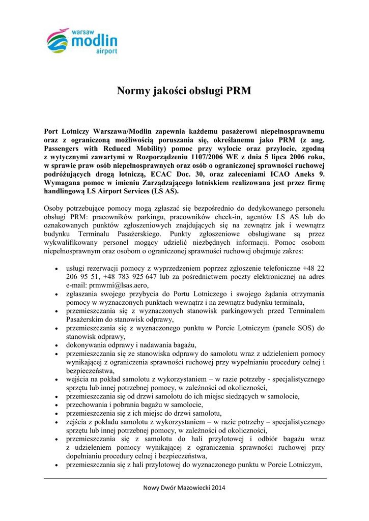 Normy jakości obsługi PRM Port Lotniczy Warszawa/Modlin zapewnia każdemu pasażerowi niepełnosprawnemu oraz z ograniczoną możliwością poruszania się, określanemu jako PRM (z ang. Passengers with Reduced Mobility) pomoc przy wylocie oraz przylocie, zgodną z wytycznymi zawartymi w Rozporządzeniu 1107/2006 WE z dnia 5 lipca 2006 roku, w sprawie praw osób niepełnosprawnych oraz osób o ograniczonej sprawności ruchowej podróżujących drogą lotniczą, ECAC Doc. 30, oraz zaleceniami ICAO Aneks 9. Wymagana pomoc w imieniu Zarządzającego lotniskiem realizowana jest przez firmę handlingową LS Airport Services (LS AS). Osoby potrzebujące pomocy mogą zgłaszać się bezpośrednio do dedykowanego personelu obsługi PRM: pracowników parkingu, pracowników check-in, agentów LS AS lub do oznakowanych punktów zgłoszeniowych znajdujących się na zewnątrz jak i wewnątrz budynku Terminalu Pasażerskiego. Punkty zgłoszeniowe obsługiwane są przez wykwalifikowany personel mogący udzielić niezbędnych informacji. Pomoc osobom niepełnosprawnym oraz osobom o ograniczonej sprawności ruchowej obejmuje zakres: usługi rezerwacji pomocy z wyprzedzeniem poprzez zgłoszenie telefoniczne +48 22 206 95 51, +48 783 925 647 lub za pośrednictwem poczty elektronicznej na adres e-mail: [email protected], zgłaszania swojego przybycia do Portu Lotniczego i swojego żądania otrzymania pomocy w wyznaczonych punktach wewnątrz i na zewnątrz budynku terminala, przemieszczania się z wyznaczonych stanowisk parkingowych przed Terminalem Pasażerskim do stanowisk odprawy, przemieszczania się z wyznaczonego punktu w Porcie Lotniczym (panele SOS) do stanowisk odprawy, dokonywania odprawy i nadawania bagażu, przemieszczania się ze stanowiska odprawy do samolotu wraz z udzieleniem pomocy wynikającej z ograniczenia sprawności ruchowej przy wypełnianiu procedury celnej i bezpieczeństwa, wejścia na pokład samolotu z wykorzystaniem – w razie potrzeby - specjalistycznego sprzętu lub innej potrzebnej pomocy, w zależności od okoliczności, przemieszczania się od drzwi samolotu do ich miejsc siedzących w samolocie, przechowania i pobrania bagażu w samolocie, przemieszczenia się z ich miejsc do drzwi samolotu, zejścia z pokładu samolotu z wykorzystaniem – w razie potrzeby – specjalistycznego sprzętu lub innej potrzebnej pomocy, w zależności od okoliczności, przemieszczania się z samolotu do hali przylotowej i odbiór bagażu wraz z udzieleniem pomocy wynikającej z ograniczenia sprawności ruchowej przy dopełnianiu procedury celnej i bezpieczeństwa, przemieszczania się z hali przylotowej do wyznaczonego punktu w Porcie Lotniczym, Nowy Dwór Mazowiecki 2014 przemieszczania się do toalet i strefy komercyjnej na Terminalu Pasażerskim, jeśli to jest konieczne. Usługa polegająca na obsłudze pasażerów niepełnosprawnych oraz z ograniczoną sprawnością ruchową świadczona jest w godzinach operowania linii lotniczych, tj. 8:00 – 23:00 bez obsługi w porze nocnej. Do obsługi pasażerów wykorzystywany jest specjalistyczny sprzęt taki jak: pojazd ambulift, manualne wózki inwalidzkie, manualny wózek do wnoszenia na pokład samolotu. Pasażer niepełnosprawny lub o ograniczonej niepełnosprawności ruchowej proszony jest o zgłoszenie potrzeby w zakresie pomocy przewoźnikowi lotniczemu, jego przedstawicielowi lub organizatorowi wycieczek co najmniej 48 godzin przed opublikowaną godziną odlotu (dotyczy to też lotu powrotnego). Jeżeli nie dokonano żadnego zgłoszenia Port Lotniczy podejmie wszelkie należyte starania w celu udzielenia pomocy. Może to się jednak wiązać z dłuższym okresem oczekiwania. Czas oczekiwania na pomoc osób niepełnosprawnych oraz z ograniczoną możliwością poruszania się, korzystających z Portu Lotniczego Warszawa/Modlin wynosi: Dla klientów odlatujących, którzy dokonali rezerwacji z wyprzedzeniem po przybyciu do Portu Lotniczego i powiadomieniu o tym dedykowanego personelu obsługi PRM poprzez zgłoszenie w punkcie zgłoszeń: a) 80 % klientów nie powinno czekać na pomoc dłużej niż 10 minut, b) 90 % klientów nie powinno czekać na pomoc dłużej niż 15 minut, c) 100 % klientów nie powinno czekać na pomoc dłużej niż 20 minut. Dla klientów odlatujących, którzy nie dokonali rezerwacji z wyprzedzeniem po przybyciu do Portu Lotniczego i powiadomieniu o tym dedykowanego personelu obsługi PRM poprzez zgłoszenie w punkcie zgłoszeń: a) 80 % klientów nie powinno czekać na pomoc dłużej niż 20 minut, b) 90 % klientów nie powinno czekać na pomoc dłużej niż 30 minut, c) 100 % klientów nie powinno czekać na pomoc dłużej niż 40 minut. Dla klientów przylatujących, którzy dokonali rezerwacji z wyprzedzeniem pomoc powinna być dostępna przy samolocie dla: a) 80 % klientów w ciągu 5 minut od momentu podjechania samolotu na stanowisko postojowe, b) 90 % w ciągu 10 minut, c) 100 % w ciągu 20 minut. Dla klientów przylatujących, którzy nie dokonali rezerwacji z wyprzedzeniem pomoc powinna być dostępna przy samolocie po dokonaniu zgłoszenia potrzeby pomocy dla: Nowy Dwór Mazowiecki 2014 a) 80 % klientów w ciągu 10 minut od momentu podjechania samolotu na stanowisko postojowe, b) 90 % w ciągu 20 minut, c) 100 % w ciągu 35 minut. Jakość świadczonej obsługi jest monitorowana przez Zarządzającego lotniskiem. Treść rozporządzenia 1107/2006 WE z dnia 5 lipca 2006 roku, w sprawie praw osób niepełnosprawnych oraz osób o ograniczonej sprawności ruchowej podróżujących drogą lotniczą dostępna na stronie internetowej: www.modlinairport.pl w zakładce Obsługa PRM. Nowy Dwór Mazowiecki 2014