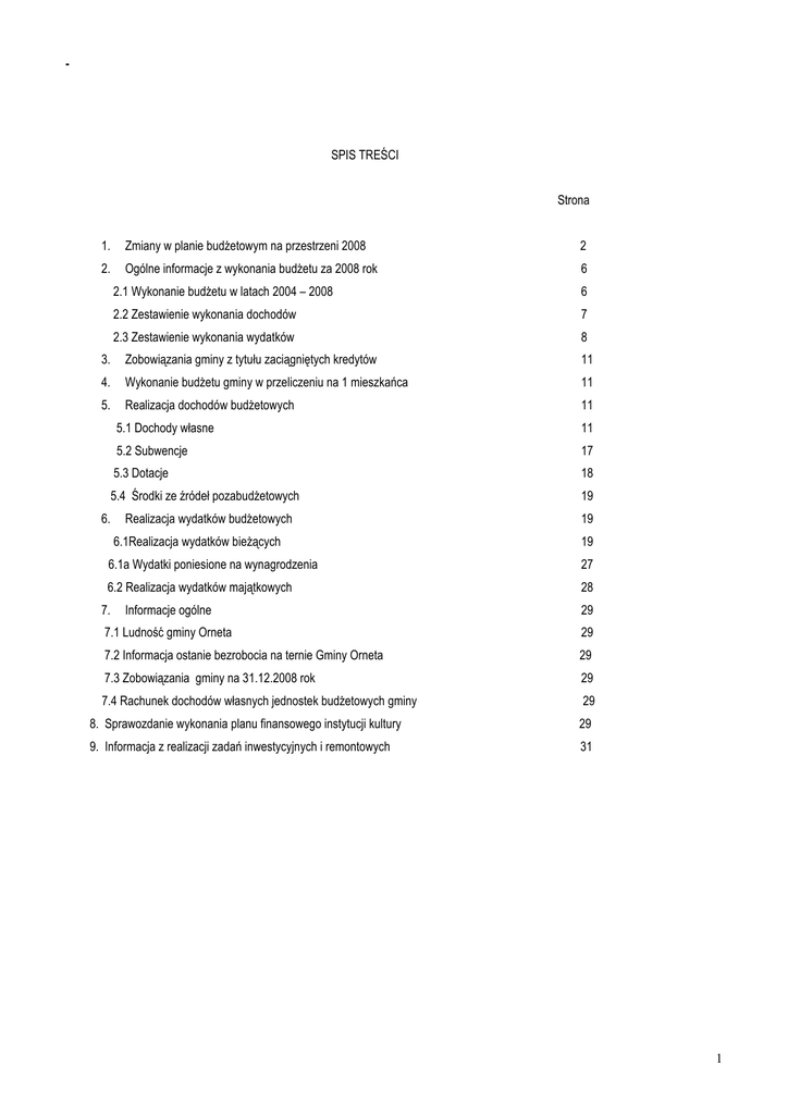 - SPIS TREŚCI Strona 1. Zmiany w planie budŜetowym na przestrzeni 2008 2 2. Ogólne informacje z wykonania budŜetu za 2008 rok 6 2.1 Wykonanie budŜetu w latach 2004 – 2008 6 2.2 Zestawienie wykonania dochodów 7 2.3 Zestawienie wykonania wydatków 8 3. Zobowiązania gminy z tytułu zaciągniętych kredytów 11 4. Wykonanie budŜetu gminy w przeliczeniu na 1 mieszkańca 11 5. Realizacja dochodów budŜetowych 11 6. 5.1 Dochody własne 11 5.2 Subwencje 17 5.3 Dotacje 18 5.4 Środki ze źródeł pozabudŜetowych 19 Realizacja wydatków budŜetowych 19 6.1Realizacja wydatków bieŜących 19 6.1a Wydatki poniesione na wynagrodzenia 27 6.2 Realizacja wydatków majątkowych 28 7. Informacje ogólne 29 7.1 Ludność gminy Orneta 29 7.2 Informacja ostanie bezrobocia na ternie Gminy Orneta 29 7.3 Zobowiązania gminy na 31.12.2008 rok 29 7.4 Rachunek dochodów własnych jednostek budŜetowych gminy 29 8. Sprawozdanie wykonania planu finansowego instytucji kultury 29 9. Informacja z realizacji zadań inwestycyjnych i remontowych 31 1 REALIZACJA BUDśETU GMINY ZA 2008r. ZMIANY W PLANIE BUDśETOWYM NA PRZESTRZENI 2008r. 1.Zmiany w planie budŜetu na przestrzeni 2008r. BudŜet gminy Orneta na rok 2008 uchwalony został 28 grudnia 2007r Uchwałą Rady Miejskiej w Ornecie Nr X V/124/07. Uchwalony budŜet przewidywał: Dochody - 28.791.000 zł Wydatki - 30.106.000 zł Przychody - 2.150.000 zł. Rozchody - Przychody 835.000 zł - to kredyt na pokrycie zaplanowanych wydatków roku 2008 - 1.400.000 zł. -nadwyŜka środków z nierozliczonych kredytów z lat ubiegłych -750.000zł Rozchody - to raty kredytowe do spłaty w roku 2008 od kredytów zaciągniętych w latach ubiegłych. W trakcie roku 2008 budŜet zmieniany był następującymi uchwałami i zarządzeniami : 1) Rady Miejskiej Nr XVII/135/08 z dnia 27 marca 2008r 2) Burmistrza Ornety Nr 23/2008 z dnia 03 kwietnia 2008r. 3) Rady Miejskiej Nr XIX/146/08 z dnia 25 kwietnia 2008r 4) Rady Miejskiej Nr XX/149/08 z dnia 27 maja 2008r 5) Uchwała Nr XXI/158/08 z dnia 30 czerwca 2008 r. 6) Burmistrza Ornety Nr 45/2008 z dnia 30 czerwca 2008r 7) Burmistrza Ornety Nr 55/2008 z dnia 31 lipca 2008r 8) Rady Miejskiej Nr XXII/167/08 z dnia 27 sierpnia 2008r 9) Burmistrza Ornety Nr 68/2008 z dnia 05 września 2008r 10) Rady Miejskiej Nr XXIII/175/08 z dnia 30 września 2008r. 11) Burmistrza Ornety Nr 73/2008 z dnia 30 września 2008r 12) Rady Miejskiej Nr XXIV/190/08 z dnia 28 października 2008r 13) Burmistrza Ornety Nr 90/2008 z dnia 12 listopada 2008r 14) Rady Miejskiej Nr XXV/196/2008 z dnia 28 listopada 2008 r. 15) Burmistrza Ornety Nr 99/2008 z dnia 28 listopada 2008 r 16) Burmistrza Ornety Nr 103/2008 z dnia 15 grudnia 2008 r. 17) Rady Miejskiej Nr XXVI/209/08 z dnia 30 grudnia 2008 r. 18) Burmistrza Ornety Nr 107/2008 z dnia 31 grudnia 2008 r. W wyniku uchwał zmieniających zwiększono dochody o kwotę 2.875.728,33 zł. wydatki o kwotę 3.331.728,33zł. Przychody zwiększono o kwotę 430.000 zł – wolne środki, rozchody zmniejszono o 26.000 zł – umorzenie poŜyczki WFOŚ W dniu 27 sierpnia 2008 roku Rada Miejska podjęła uchwałę Nr XXII/162/08 w sprawie wyemitowania obligacji przez Gminę Orneta w wysokości 1.400.000 zł. W dniu 29.12.2008 r. obligacje zostały wyemitowane w kwocie 1.200.000 zł. 2 O źródłach zmian informuje zestawienie poniŜej: Lp. I. 1. 2 3 4 II. 1. 2. III. Iv V Wyszczególnienie Plan uchwalony Dochody ogółem: w tym: Dochody własne w tym: Udział w podatkach stanowiących dochody budŜetu państwa Subwencje Dotacje Środki ze źródeł pozabudŜetowych Wydatki ogółem: w tym: Wydatki bieŜące Wydatki majątkowe Wynik Przychody Rozchody Plan po zmianach RóŜnica 28.791.000,00 31.666.728,33 2.875.728,33 11.748.624,00 12.725.832,00 977.208 3.281.226,00 3.281.226,00 0 9.880.412,00 6.129.411,00 1.032.553,00 9.960.211,00 7.878.495,33 1.102.190,00 79.799,00 1.749.084,33 69.637 30.106.000,00 33.437.728,33 3.331.728,33 27.537.335,00 2.568.665,00 -1.315.000,00 2.150.000,00 835.000,00 31.034.948,33 2.402.780,00 -1.771.000,00 2.580.000,00 809.000,00 3.497.613,33 -165.885,00 -456.000,00 430.000,00 +26.000,00 Zestawienie poniŜej przedstawia szczegółowo- w jakich źródłach dochodów budŜetowych w 2008 roku dokonano zmian i w jakich działach wydatków budŜetowych uległ zmianom plan finansowy: Zmiany w planie finansowym DOCHODY OGÓŁEM: w tym: 1. Subwencje: - subwencja oświatowa 2.Środki ze źródeł poza budŜetowych w tym: -zwrot środków z wydatków nie wygasających -dofinansowanie do zakupu sprzętu p.poŜ. 3. Dotacje: w tym: - zasiłki i pomoc w naturze - świadczenia rodzinne - składki na ubezpieczenia zdrowotne - pomoc materialna dla uczniów -utrzymanie ośrodków pomocy -utrzymanie cmentarzy -usługi opiekuńcze -doŜywianie uczniów -wybory uzupełniające do rady -zwrot podatku akcyzowego w paliwie -dofinansowanie do budowy remizy straŜackiej w Ornecie -dofinansowanie do nauki języka angielskiego -dofinansowanie pracodawcom do kosztów szkolenia uczniów -uzupełnienie spisu wyborców -utrzymanie Środowiskowego Domu Samopomocy w Henrykowie -zwalczanie ptasiej grypy - zajęcia sportowo – rekreacyjne „Sport na wesoło” - stypendia dla uczni niepełnosprawnych - dofinansowanie festynu w Opinie 4. Dochody własne i inne -udział Agencji Nieruchomości rolnej w remontach budynków przyjętych od Agencji - środki z Programu Operacyjnego Kapitał Ludzki -refundacja wynagrodzeń z Powiatowego Urzędu Pracy -wpłaty od sponsorów na Dni Ornety - oplata za wydanie zezwoleń na sprzedaŜ alkoholu - wpłaty od Fundacji „Przyjaciółka „ - wpłaty na pokrycie kosztów dokonanie zmian w planie zagospod. przestrzennego - wplata na pokrycie kosztów wynagrodzenia koordynatora OSP + 2.875.728,33 +79.799 zł +79.799 zł + 69.637 zł + 57.020 zł +12.617zł +1.749.084,33 zł + 301.073 zł - 51.468 zł - 6.538 zł + 637.371zł + 44.386zł +1.500zł -13.345 zł + 63.320zł +3.800zł + 436.255,21zł +40.000zł +