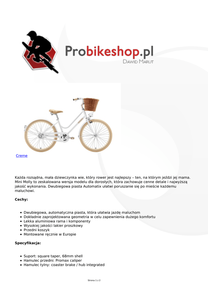 Creme Każda rozsądna, mała dziewczynka wie, który rower jest najlepszy – ten, na którym jeździ jej mama. Mini Molly to zeskalowana wersja modelu dla dorosłych, która zachowuje cenne detale i najwyższą jakość wykonania. Dwubiegowa piasta Automatix ułatwi poruszanie się po mieście każdemu maluchowi. Cechy: Dwubiegowa, automatyczna piasta, która ułatwia jazdę maluchom Dokładnie zaprojektowana geometria w celu zapewnienia dużego komfortu Lekka aluminiowa rama i komponenty Wysokiej jakości lakier proszkowy Przedni koszyk Montowane ręcznie w Europie Specyfikacja: Suport: square taper, 68mm shell Hamulec przedni: Promax caliper Hamulec tylny: coaster brake / hub integrated Strona 1 z 2 Bagażnik / Koszyk: front wicker basket Kaseta: --Łańcuch: KMC 1/2"x3/32" Korba: steel, 127mm, 36t Błotniki: steel painted Widelec: Hi-Ten steel fork, 1" Rama: Aluminium Gripy: Creme Spring Kierownica: steel, chrome plated, width: 425mm, barbore: 25.4mm Stery: VP, threaded, 1” Piasta przednia: Joytech loose ball, 28H, cup nuts Piasta tylna: SRAM Automatix, 28h, 2-speed, sprocket: 23t Obręcze: aluminium Siodełko: Creme Sztyca: steel, chrome plated 25.4mm Manetki: --Szprychy: stainless steel Nóżka: aluminium Mostek: aluminium, polished Opony: Kenda Kommuter 20"x1,75" Dodatki: stylowy dzwonek Strona 2 z 2