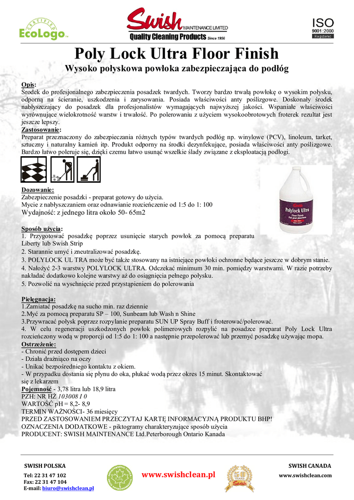 Poly Lock Ultra Floor Finish Wysoko połyskowa powłoka zabezpieczająca do podłóg Opis: Środek do profesjonalnego zabezpieczenia posadzek twardych. Tworzy bardzo trwałą powłokę o wysokim połysku, odporną na ścieranie, uszkodzenia i zarysowania. Posiada właściwości anty poślizgowe. Doskonały środek nabłyszczający do posadzek dla profesjonalistów wymagających najwyższej jakości. Wspaniałe właściwości wyrównujące wielokrotność warstw i trwałość. Po polerowaniu z użyciem wysokoobrotowych froterek rezultat jest jeszcze lepszy. Zastosowanie: Preparat przeznaczony do zabezpieczania różnych typów twardych podłóg np. winylowe (PCV), linoleum, tarket, sztuczny i naturalny kamień itp. Produkt odporny na środki dezynfekujące, posiada właściwości anty poślizgowe. Bardzo łatwo poleruje się, dzięki czemu łatwo usunąć wszelkie ślady związane z eksploatacją podłogi. Dozowanie: Zabezpieczenie posadzki - preparat gotowy do użycia. Mycie z nabłyszczaniem oraz odnawianie rozcieńczenie od 1:5 do 1: 100 Wydajność: z jednego litra około 50- 65m2 Sposób użycia: 1. Przygotować posadzkę poprzez usunięcie starych powłok za pomocą preparatu Liberty lub Swish Strip 2. Starannie umyć i zneutralizować posadzkę. 3. POLYLOCK UL TRA może być także stosowany na istniejące powłoki ochronne będące jeszcze w dobrym stanie. 4. Nałożyć 2-3 warstwy POLYLOCK ULTRA. Odczekać minimum 30 min. pomiędzy warstwami. W razie potrzeby nakładać dodatkowo kolejne warstwy aż do osiągnięcia pełnego połysku. 5. Pozwolić na wyschnięcie przed przystąpieniem do polerowania Pielęgnacja: 1.Zamiatać posadzkę na sucho min. raz dziennie 2.Myć za pomocą preparatu SP – 100, Sunbeam lub Wash n Shine 3.Przywracać połysk poprzez rozpylanie preparatu SUN UP Spray Buff i froterować/polerować. 4. W celu regeneracji uszkodzonych powłok polimerowych rozpylić na posadzce preparat Poly Lock Ultra rozcieńczony wodą w proporcji od 1:5 do 1: 100 a następnie przepolerować lub przemyć posadzkę używając mopa. Ostrzeżenie: - Chronić przed dostępem dzieci - Działa drażniąco na oczy - Unikać bezpośredniego kontaktu z okiem. - W przypadku dostania się płynu do oka, płukać wodą przez okres 15 minut. Skontaktować się z lekarzem Pojemność - 3,78 litra lub 18,9 litra PZH: NR HŻ 103008 I 0 WARTOŚĆ pH = 8,2- 8,9 TERMIN WAŻNOŚCI- 36 miesięcy PRZED ZASTOSOWANIEM PRZECZYTAJ KARTĘ INFORMACYJNĄ PRODUKTU BHP! OZNACZENIA DODATKOWE - piktogramy charakteryzujące sposób użycia PRODUCENT: SWISH MAINTENANCE Ltd.Peterborough Ontario Kanada SWISH POLSKA Tel: 22 31 47 102 Fax: 22 31 47 104 E-mail: [email protected] SWISH CANADA www.swishclean.pl www.swishclean.com
