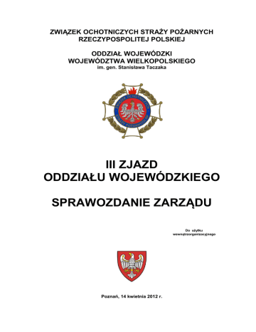 ZWIĄZEK OCHOTNICZYCH STRAŻY POŻARNYCH RZECZYPOSPOLITEJ POLSKIEJ ODDZIAŁ WOJEWÓDZKI WOJEWÓDZTWA WIELKOPOLSKIEGO im. gen. Stanisława Taczaka III ZJAZD ODDZIAŁU WOJEWÓDZKIEGO SPRAWOZDANIE ZARZĄDU Do użytku wewnątrzorganizacyjnego Poznań, 14 kwietnia 2012 r. Redakcja, korekta: OW ZOSP RP w Poznaniu Projekt okładki, skład i łamanie: Studio „EWAND” - Poznań Zdjęcia: st. kpt. S. Brandt, D. Piechocki, K. Makowska, J. Matyjka, W. Schreiber, M. Nowak, K. Kociński, J. Mostowy, G. Marszałek, N. Serbiak, ks. Henryk Brzozowski Cor, A. Marszewska, B. Cisowski, T. Potemkowski, M. Naskręt. P. Ruskowiak, J. Orchowski, M. Woźniak, strona www.zosprp.pl oraz archiwum: OSP Budzyń, OSP Czermin, Dział Programowo-Szkoleniowy ZG ZOSP RP, OSP Gołuchów, OSP Gostyń, OSP Iwanowice, OSP Kleczew, OSP Kłodawa, OSP Kobylin, OSP Kołaczkowo, OSP Kościelna Wieś, OSP Koźminek, OSP Krajenka, OSP Lądek, OSP Lisków, OSP ORW Piła, OW ZOSP RP w Poznaniu, OSP Pruszków, OSP Słomowo, SMW, OSP Środa Wlkp., WMP w Rakoniewicach, OSP Złotów. Druk i oprawa: Studio „EWAND” Poznań 2 „Niech w gmachu Ojczyzny straże pożarne zajmą stanowisko im należne godne, bo gmach każdy bez dzielnej i sprawnej ochrony istnieć nie może” . Bolesław Chomicz 3 Spis treści I. WSTĘP 5 II. WŁADZE ZARZĄDU ODDZIAŁU WOJEWÓDZKIEGO 6 1. Zarząd Oddziału Wojewódzkiego 6 2. Prezydium Zarządu Oddziału Wojewódzkiego 19 3. Stan organizacyjny 35 III. ZARZĄDY ODDZIAŁÓW POWIATOWYCH 35 IV. DZIAŁALNOŚĆ KULTURALNO – WYCHOWAWCZA 38 1. Ogólnopolski Turniej Wiedzy Pożarniczej 39 2. Rajdy Młodzieżowych Drużyn Pożarniczych 47 3. Ogólnopolski Konkurs Plastyczny 51 4. Obozy Młodzieżowych Drużyn Pożarniczych 57 5. Polsko-Niemiecka Współpraca Młodzieży 62 6. Wojewódzki Konkurs Kronik 64 7. Zawody Sportowo – Pożarnicze 73 8. Wojewódzkie Kolegium Sędziów 84 9. Mistrzostwa w Ratownictwie Medycznym 85 10. Zawody Sikawek Konnych 88 11. Szkolenia 91 12. Orkiestry Dęte OSP 95 13. Mistrzoostwa Płetwonurków i w Ratownictwie Wodnym 108 14. „TIMBERSPORTS” 111 15. Zawody MDP w sportach obronnych 113 16. Strona Internetowa 115 17. Inne działania kulturalno-wychowawcze i sportowe 116 18. 90. lecie Związku OSP RP 124 19. Strażackie pielgrzymowanie 130 20. Pamięć i wspomnienie o patronie Oddziału Wojewódzkiego 135 ODZNACZENIA I WYRÓŻNIENIA 138 DZIAŁALNOŚĆ FINANSOWO-GOSPODARCZA 179 V. VI. 4 I. WSTĘP Szanowne Druhny, Druhowie! Dobiegła końca II kadencja działalności Oddziału Wojewódzkiego Związku Ochotniczych Straży Pożarnych Rzeczypospolitej Polskiej Województwa Wielkopolskiego im. gen. Stanisława Taczaka. Będąc działaczami Związku wypełniliśmy i nadal wypełniamy wiele zadań, szczególnie tych, które dotyczyły rozwoju ochrony przeciwpożarowej w naszym województwie. Czyniliśmy to z dużym poświęceniem, mężnie stawiając czoła wszelkim niebezpieczeństwom i zagrożeniom. Sprawdzone w działaniach, wysoko oceniane było przez władze zaangażowanie członków naszej organizacji w rozwiązywaniu problemów ochrony przeciwpożarowej. Gwarantowało pełną realizację zadań programowych Związku na rzecz poprawy bezpieczeństwa pożarowego. Nasi strażacy od pokoleń pełnili i pełnią bezinteresowną służbę w ochronie życia, zdrowia, mienia, środowiska naturalnego, tradycji i kultury narodowej. Zawsze gotowi – w dzień i w nocy, w niedzielę i święta, by nieść pomoc w przypadku zagrożenia. Nie zawsze należycie zabezpieczeni – przed ogniem, dymem, gazami, z narażeniem własnego życia ratują innych. Funkcjonują, bo są niezmiernie potrzebni, bo zagrożenia są coraz częstsze i coraz groźniejsze, a pokonanie ich wymaga coraz większych umiejętności, nowego wyposażenia i specjalistycznego sprzętu. Na miarę swych możliwości w rozwiązywaniu codziennych kłopotów strażaków– ochotników, pomaga Związek Ochotniczych Straży Pożarnych Rzeczypospolitej Polskiej. Zabiega o pomoc i wsparcie służb odpowiedzialnych za bezpieczeństwo kraju i każdego z nas. Gromadzi przyjaciół, którym bliskie są sprawy będące w centrum zainteresowania naszej organizacji. Dokonując podsumowania minionej kadencji można z dumą stwierdzić, że tak jak dawniej tak i dzisiaj strażacy wierni swojej tradycji niosą pomoc i ratunek tam, gdzie jest on potrzebny. Z dumą możemy spojrzeć na dorobek każdej Ochotniczej Straży Pożarnej i na każdego strażaka będącego bezcenną wartością naszego Związku. Nasze osiągnięcia byłyby mniejsze gdyby zabrakło bliskiej współpracy z władzami samorządowymi województwa, powiatów, miast i gmin oraz instytucjami i organizacjami, którym bliskie są nasze ideały. Współdziałanie z Państwową Strażą Pożarną to podstawa naszego przygotowania do działań ratowniczych. Wspólne działania przynoszą gwarantują społeczeństwu bezpieczeństwo. Ważne jest spotykanie się wszystkich strażaków ochotników i zawodowych w szczególnych chwilach takich jak Spotkanie Wigilijne czy na obchodach „Dnia Strażaka”. 5 Spotkanie Wigilijne SA PSP w Poznaniu, 07.01.2012 r. Podsumowując kończącą się kadencję Zarządu Oddziału Wojewódzkiego ZOSP RP, dziękujemy tym wszystkim, którzy w naszych szeregach służyli społeczeństwu i tym, którzy ich w tej służbie wspomagali. Szczególnie dziękujemy członkom ustępującego Zarządu, parlamentarzystom, władzom samorządowym, Komendantom Państwowej Straży Pożarnej i funkcjonariuszom pożarnictwa, Szkole Aspirantów Państwowej Straży Pożarnej w Poznaniu oraz kierującym różnymi jednostkami gospodarczymi, stowarzyszeniami – składamy szczere podziękowanie za wspieranie i współpracę z naszym Związkiem. Wszystkim Druhnom i Druhom dziękujemy za bezinteresowną i wzorową postawę. I. WŁADZE ZARZĄDU ODDZIAŁU WOJEWÓDZKIEGO 1. Zarząd Oddziału Wojewódzkiego ZOSP RP Na II Zjeździe Oddziału Wojewódzkiego Związku OSP RP Województwa
