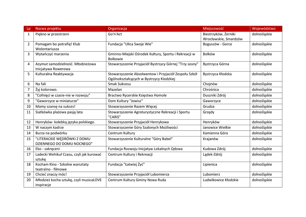 Lp 1 Nazwa projektu Piękno w przestrzeni Organizacja Go'n'Act 2 Pomagam bo potrafię! Klub Wolontariusza Wytańczyć marzenia Fundacja "Ulica Swoje Wie" 3 4 5 Azymut samodzielność. Młodzieżowa Inicjatywa Rowerowa Kulturalna Reaktywacja 6 7 8 9 10 11 Na fali Żyj kolorowo. "Cofnięci w czasie-nie w rozwoju" "Gaworzyce w miniaturze" Mamy szansę na sukces! Siatkówka plażowa pasją lata 12 13 14 15 Henryków- kolebką języka polskiego. W naszym kadrze Burza na podwórku "LITERACKIE WĘDRÓWKI Z DOMU DZIENNEGO DO DOMU NOCNEGO" Eko - zakręceni Ladecki Wehikuł Czasu, czyli jak kurować sztukę Kocham Kino - Szkolne warsztaty teatralno - filmowe Chcieć znaczy móc! Młodzież kocha sztukę, czyli musicaLOVE inspiracje 16 17 18 19 20 Miejscowość Biestrzyków, Żerniki Wrocławskie, Smardzów Boguszów - Gorce Województwo dolnośląskie Gminno-Miejski Ośrodek Kultury, Sportu i Rekreacji w Bolkowie Stowarzyszenie Przyjaciół Bystrzycy Górnej "Trzy sosny" Bolków dolnośląskie Bystrzyca Górna dolnośląskie Stowarzyszenie Absolwentow i Przyjaciół Zespołu Szkół Ogólnokształcących w Bystrzycy Klodzkiej Smak Sukcesu Mazelan Bractwo Rycerskie Księstwa Homole Dom Kultury "Jowisz" Stowarzyszenie Razem Więcej Stowarzyszenie Agroturystyczne Rekreacji i Sportu "CARiS" Stowarzyszenie Przyjaciół Henrykowa Stowarzyszenie Góry Szalonych Możliwości Centrum Kultury Stowarzyszenie Kulturalne "Góry Babel" Bystrzyca Kłodzka dolnośląskie Chojnów Chrośnica Duszniki Zdrój Gaworzyce Grudza Grzędy dolnośląskie dolnośląskie dolnośląskie dolnośląskie dolnośląskie dolnośląskie Henryków Janowice Wielkie Kamienna Góra Krajanów dolnośląskie dolnośląskie dolnośląskie dolnośląskie Fundacja Rozwoju Inicjatyw Lokalnych Qdowa Centrum Kultury i Rekreacji Kudowa Zdrój Lądek-Zdrój dolnośląskie dolnośląskie Fundacja "Łatwiej Żyć" Lipienica dolnośląskie Stowarzyszenie Przyjaciół Lubomierza Centrum Kultury Gminy Nowa Ruda Lubomierz Ludwikowice Kłodzkie dolnośląskie dolnośląskie dolnośląskie 21 22 23 24 25 26 27 28 29 30 31 32 33 34 Ekonomia Społeczna dla Młodzieży Naszym Okiem Papużko, papużko, powiedz mi coś na uszko! Rzecz o komunikacji. NAUCZMY SIĘ SIEBIE CZYLI MOJA PIERWSZA EDUKACJA OBYWATELSKA Roztańczona przestrzeń (nie)grzecznej młodzieży Smykałki Hej chodźcie wszyscy z nami, w kulki dziś zagramy! "Pęgów dawniej i dziś" - kronika fotograficzna, warsztaty fotografii architektury i krajobrazu Młodzieżowa modelarnia umiejętności. Młodzi odkrywcy powojennej historii hutnictwa miasta Pieńsk Podróż w dorosłe życie Dotacja zostanie wykorzystana na badania meteorologiczne na wzgórzu Grzybowiec. Zbieranie i wypuszczenie informatora o słynnych polskich szybownikach. ustawienie tablicy informacyjnej o warunkach lotnych na wzgórzu. Budowę 2 dużych szybowców repliki i szybowca współczesnego. Organizacje pikniku modelarskiego. Przelot szybowcem dla każdego uczestnika "Dbając o przeszłość - pewnie patrzymy w przyszłość" POLE STARTU Szansa dla młodzieży z OHP Mysłakowice Gminny Ośrodek Kultury w Marcinowicach Fundacja Sielanka Łomnica Marcinowice Miłocice dolnośląskie dolnośląskie dolnośląskie Biblioteka Publiczna Gminy Dzierżoniów im. W.Reymonta Gminny Ośrodek Kultury w Niechlowie Mościsko dolnośląskie Niechlów dolnośląskie Fundacja Aktywnego Rozwoju Stowarzyszenie Nasz Parchów Ołdrzychowice Kłodzkie Parchów dolnośląskie dolnośląskie Stowarzyszenie Rozwoju Pęgowa Pęgów dolnośląskie Fundacja ZNAJDŹ CEL Euroregionalne Centrum Kultury i Komunikacji Pieńsk Pęgów Pieńsk dolnośląskie dolnośląskie Grupa nieformalna - Pomagam, bo lubię UKS Sporty Modelarskie i rekreacja Piława Górna Piława Górna dolnośląskie dolnośląskie Grupa nieformalna: "Damy radę" Radosław dolnośląskie FUNDACJA AKTYWNOŚCI SPOŁECZNEJ I KULTURALNEJ RADWANICE dolnośląskie 35 36 37 38 39 40 41 42 Pracownia zdziwień Mądra i pomocna... wiedźma! "Obudź w sercu biathlonistę" Gimnazjalny Portal Informacyjny Z moich stron – rodzinne szlaki Śmiałowiczan Poznawanie - góry z innej perspektywy O trzech armiach w Świętoszowie Kolory Kratywności "POLE" Gminna Biblioteka Publiczna Filia nr 2 "Razem Możemy Więcej" UKS Kamieńczyk Stowarzyszenie Nasza Gmina Dobromierz Stowarzyszenie Rozwoju Wsi Śmiałowice Sieroszowice 39 Stobno Szklarska Poręba Szymanów Śmiałowice dolnośląskie dolnośląskie dolnośląskie dolnośląskie dolnośląskie Centrum Kultury, Sportu i Turystyki w Świerzawie Stowarzyszenie Historyczne Świętoszów Gminny Ośrodek Kultury w Wińsku Świerzawa Świętoszów Wińsko dolnośląskie dolnośląskie dolnośląskie