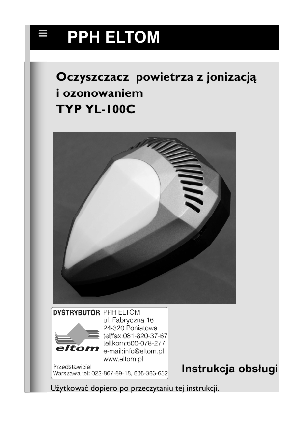 PPH ELTOM Nazwa twojej firmy Oczyszczacz powietrza z jonizacją i ozonowaniem TYP YL-100C Instrukcja obsługi Użytkować dopiero po przeczytaniu tej instrukcji. PPH ELTOM www.eltom.pl Szanowny kliencie! Dziękujemy za wybór wyrobu z naszej dystrybucji. Dołożyliśmy wiele starań, aby funkcjonalność, trwałość, estetyka wykonania i prostota obsługi Jonizatora powietrza z ozonowaniem typ YL - 100 C sprawiły państwu dużo zadowolenia i prozdrowotnej satysfakcji z jego nabycia. Prosimy Państwa o uważną lekturę instrukcji obsługi przed uruchomieniem wyrobu. Przestrzeganie zawartych w niej informacji i wskazówek uchroni przed niewłaściwym użytkowaniem, a stosowanie się do zaleceń zapewni długotrwałe i niezawodne korzystanie z wyrobu. Instrukcję po przeczytaniu zachowaj i przechowuj tak abyś mógł z niej skorzystać gdy jest to potrzebne. Jeżeli masz wątpliwości lub nie wszystko co przeczytałeś jest zrozumiałe, skontaktuj się z nami, a udzielimy Ci dodatkowych informacji. Środowisko naturalne i usuwanie odpadów Opakowania i produkty po upływie ich daty ważności muszą zostać fachowo usunięte i dostarczone do kompletnych punktów utylizacyjnych. Kartony i urządzenia elektryczne należy przekazać do placówek utylizacyjnych. Dzięki Państwa współdziałaniu środowisko naturalne zostanie długofalowo odciążone, a przydatne do recyklingu materiały doprowadzone do nowego cyklu produkcyjnego. Produktu nie wolno wyrzucać do pojemnika na śmieci. W celu utylizacji wg poszczególnych składników części z tworzyw sztucznych są oznakowane. Wskazówki dotyczące bezpieczeństwa użytkowania 1. Użytkować tylko wewnątrz zamkniętych pomieszczeń (domowych, biurowych, użyteczności publicznej, przemysłowych) 2. Sprawdzić czy napięcie w gniazdku zasilą cym ma parametry AC 220÷240V/50Hz 3. Sprawdzić czy obudowa jonizatora nie ma uszkodzeń mechanicznych 4. W czasie pracy nie zasłaniać kratki wylotu powietrza zjonizowanego i wzbogaconego ozonem w górnej części przodu obudowy 5. Nie wkładać do kratek żadnych przedmiotów gdyż grozi to porażeniem prądem, lub uszkodzeniem wyrobu 6. Przy okresowym czyszczeniu obudowy wyjąć jonizator z gniazda zasilającego. Czyścić kratkę ściereczką lub przedmuchać suszarką, a gładkie powierzchnie czystą lekko wilgotną szmatką lub gąbka, nie myć, nie zanurzać do wody. 7. Nie stosować w pomieszczeniach z łatwopalnymi materiałami ani w pobliżu łatwopalnych aerozoli ciśnieniowych. PPH ELTOM www.eltom.pl Charakterystyka - działanie 1. Jonizator YL-100 C posiada wydajny generator jonizujący ujemnie, prozdrowotnie cząstki powietrza o emisji ponad 5 milionów ujemnych jonów na 1 cm³ powietrza, oraz towarzyszącą jonizacji emisję ozonu do 4ppm. Znane na rynku najbardziej wydajne jonizatory mają wydajność emisji jonów 2 razy niższą. Dzięki temu jonizator ma zastosowanie do czyszczenia powietrza nawet w dużych pomieszczeniach mieszkalnych do 30m², jak również w obiektach użyteczności publicznej, handlowych, biurowych, przemysłowych. Jest również bardzo skuteczny do wytrącania pyłów i zapachów przy hodowli ptaków i innego inwentarza. 2. Jonizator skutecznie wytrąca alergeny, pyłki kwiatowe, roślinne oraz roztocza. 3. Skutecznie wytrąca pyły i pyłki z zanieczyszczeń przemysłowych, środowiskowych, oraz przy hodowli ptaków i zwierząt. 4. Ogranicza w powietrzu bakterie, wirusy, grzyby, pleśnie. 5. Usuwa nieprzyjemne i szkodliwe zapachy np. dym papierosowy, amoniak itp. 6. Do stosowania w pomieszczeniach do 30m² przy wysokości 3m 7. Bardzo sprawny energetycznie, pobór mocy tylko 2,5W, przystosowanej do pracy ciągłej. 8. Jonizuje ujemnie, prozdrowotnie powietrze w pomieszczeniach poprawiając samopoczucie, dotleniając organizm. Działa antystresowo i regenerująco. 9. Niezbędny i niezawodny w skuteczności dla alergików. 10. Nie posiada kosztownych filtrów wymagających wymiany. Raz na kwartał delikatnie suszarką przedmuchać otwór wylotowy jonizatora przez kilka sekund. 11. Jonizator posiada ciepłe, mleczno-białe podświetlenie działające pozytywnie na organizm – pełniące funkcję intymnej nocnej lampki. Obsługa 1. Wyjmij jonizator z opakowania. 2. Sprawdż czy napięcie na opakowaniu 220÷240V 50Hz jest zgodne z napięciem w gniazdku 3. Włóż wtyczkę jonizatora do gniazdka sieci. Na bocznej ściance jonizator posiada przełącznik o trzech położeniach dźwigni. W górnym położeniu (OFF) jonizator jest wyłączony, w środkowym położeniu ON jonizator pracuje emitując 5 milionów ujemnych jonów na cm³, oraz do 4ppm ozonu 03. W dolnym położeniu dźwigni ON/LIGHT jonizator pracuje i dodatkowo włącza się mleczno-białe oświetlenie. 4. Korzystaj z gniazdka, które nie jest zasłonięte przedmiotami. 5. Jeżeli nie ma gniazdka na odsłoniętej ścianie , jonizator można podłączyć do gniazdka, przedłużacz ustawić na stoliku, biurku, szafie, lodówce, parapecie i innym dowolnym miejscu w odsłoniętej przestrzeni 6. Urządzenie jest przystosowane do pracy ciągłej S1 PPH ELTOM www.eltom.pl Dane techniczne: 1.Napięcie zasilania AC 220-240V/50Hz 2.Znamionowy pobór mocy 2,5W 3.Emisja jonów ujemnych 5 x106 jonów /cm ³ 4.Emisja ozonu< 0,04 ppm 5.Rodzaj pracy ciągłej S1 6.Waga 200 g 7.Wymiary 130x100x90mm Gwarancja - obsługa posprzedażna Świadczenia gwarancyjne wg załączonej karty gwarancyjnej Oświadczenie importera- dystrybutora. Importer – dystrybutor informuje, że wyrób Oczyszczacz powietrza z jonizacją i ozonowaniem typ YL-100C spełnia wymagania dyrektyw unijnych co potwierdza certyfikat No.: E0710038E z 03.10.2009r i dlatego jest oznakowany znakiem CE.