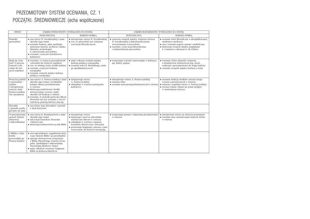 PRZEDMIOTOWY SYSTEM OCENIANIA, CZ. 1 POCZĄTKI. ŚREDNIOWIECZE (echa współczesne) TEMAT ZAKRES PODSTAWOWY. WYMAGANIA NA OCENĘ: DOSTATECZNĄ BARDZO DOBRĄ ZAKRES ROZSZERZONY. WYMAGANIA NA OCENĘ: DOSTATECZNĄ BARDZO DOBRĄ Pomniki przeszłości zna wiersz W. Szymborskiej i umie określić jego temat rozumie funkcje, jakie spełniają instytucje (muzea, archiwa) i nauka (historia, archeologia) w odtwarzaniu przeszłości rozumie, czym jest dziedzictwo kulturowe interpretuje wiersz W. Szymborskiej wie, że przeszłość jest tematem rozważań filozoficznych zauważa związek między tematem wiersza W. Szymborskiej a historiozoficznymi rozważaniami o przeszłości rozumie, czym są przekształcenia i zniekształcenia przeszłości rozumie tekst filozoficzny o skomplikowanej strukturze myślowej zna i rozumie pojęcie pamięć symboliczna dostrzega związek między poglądami E. Cassirera a obrazem G. de Chirico Skąd się wziąłem? O przynależności człowieka do różnych wspólnot rozumie, co oznacza przynależność człowieka do różnych wspólnot wie, że istnieją różne źródła kultury rozumie, czym jest kultura europejska rozumie związek między kulturą polską a europejską umie wskazać związki między kulturą polską a europejską rozumie tekst B. Micińskiego, umie go sproblematyzować rozpoznaje wartości uniwersalne w kulturze, np. dobro, piękno rozumie, które elementy stanowią o dziedzictwie kulturowym (np. język, tradycja) i przynależności do kręgu kultury rozumie związek między kulturą a etyką interpretuje wiersz A. Świrszczyńskiej odnajduje w wierszu nawiązania kulturowe interpretuje wiersz A. Świrszczyńskiej rozumie funkcję środków artystycznego omawia tekst wyrazu zastosowanych w wierszu rozumie sens nawiązań kulturowych w wierszu omawia i uogólnia wiersz A. Świrszczyńskiej wyraża własne zdanie na temat podjęty w omawianym wierszu Poetycka podróż zna wiersz A. Świrszczyńskiej i umie w przeszłość – określić jego temat, wyodrębnić analiza kolejne obrazy przedstawione i interpretacja w wierszu wiersza Anny dostrzega podstawowe środki Świrszczyńskiej artystycznego wyrazu i umie Nie narodzona określić ich funkcję w tekście rozumie, że prawda poetycka (fikcja literacka) nie jest tożsama z rzeczywistością, prawdą historyczną itp. Słowniki i sposoby posługiwania się nimi zna różne typy słowników i potrafi z nich korzystać W poszukiwaniu genesis kultury zbiorowej i indywidualnej zna wiersz R. Brandstaettera i umie określić jego temat odczytuje konteksty literackie i historyczne dostrzega kulturotwórczą rolę Biblii Z Biblią w ręku – zna najważniejsze zagadnienia dotykrótki czące historii Biblii i jej przekładów przewodnik po operuje słownictwem związanym Świętej Księdze z Biblią (Pięcioksiąg, Genesis, Ewangelia, Apokalipsa) i odpowiednią frazeologią (hiobowe wieści) umie odnaleźć stosowny fragment Biblii za pomocą odsyłacza interpretuje wiersz rozpoznaje postaci i zdarzenia przedstawione interpretuje wiersz na różnych poziomach dostrzega i nazywa odwołania w wierszu rozumie sens zastosowania różnych stylów stylistyczne obecne w wierszu w wierszu odnajduje w wierszu i omawia konteksty historyczne i literackie porównuje fragmenty wiersza z pierwowzorami, do których nawiązują Przedmiotowy system oceniania, cz. 1 6 Przedmiotowy system oceniania, cz. 1 7 „Na początku. . .” wie, co to jest kosmogonia (biblijna porównuje biblijną i mitologiczną – kosmogonia i mitologiczna) koncepcję stworzenia świata biblijna umie wskazać różnice językowe rozumie, na czym polega trudność i składniowe w pochodzących przekładu z różnych epok przekładach tekstów biblijnych „Ocalony” poeta zna wiersz T. Różewicza i umie jako nowy Adam określić jego temat odczytuje biblijny, historyczny i autobiograficzny kontekst wiersza rozumie etyczne aspekty wiersza interpretuje wiersz dostrzega sens demitologizacji jako zabiegu poetyckiego analizuje językową warstwę wiersza T. Różewicza ocenia postawę podmiotu lirycznego wykorzystuje tekst publicystyczny w omówieniu wiersza omawia wiersz i formułuje tezy wspierające interpretację Co nam zostało po wieży Babel? interpretuje wiersz w kontekście fragmentu Biblii dostrzega przyczyny i konsekwencje niemożności porozumiewania się interpretuje językową warstwę wiersza zna plastyczne (np. P. Bruegela) realizacje motywu wieży Babel interpretuje symbolikę wieży Babel na poziomie wartości uniwersalnych interpretując wiersz, dostrzega w nim odejścia od biblijnego rozumienia wieży Babel dostrzega filozoficzny sens symbolu zna wiersz W. Szymborskiej zna fragment Księgi Rodzaju dostrzega biblijne pochodzenie motywu wieży Babel dostrzega dialog między literaturą współczesną a Biblią rozumie motyw wieży Babel jako symbol braku porozumienia między ludźmi Czy życie wśród wielu kultur, języków, dialektów, gwar może stanowić wartość dla współczesnego człowieka? zna tekst J. Stempowskiego rozważa tekst J. Stempowskiego w kontekście rozumie idylliczny wydźwięk wspomnień symboliki wieży Babel dostrzega wzbogacające znaczenie obcowania dostrzega uniwersalizm rozważań z wieloma kulturami J. Stempowskiego ma własny pogląd na zagadnienie przebywania w środowisku wielokulturowym i jednorodnym pod względem kultury Sztuka przekładu literackiego zna tekst A. Kamieńskiej rozumie, czym jest przekład dzieła literackiego zna pojęcia przekład filologiczny i przekład artystyczny rozumie, na czym polega trudność translatorska rozumie, że przekład ma wpływ na recepcję dzieła przekształca np. tekst średniowieczny na tekst pisany językiem współczesnym stosuje synonimy, wyrazy bliskoznaczne rozumie, dlaczego kultury są nieprzekładalne precyzyjnie formułuje i przekształca myśli porównuje zaproponowane w podręczniku przekłady fragmentów Biblii i odnajduje w nich różnice wynikają