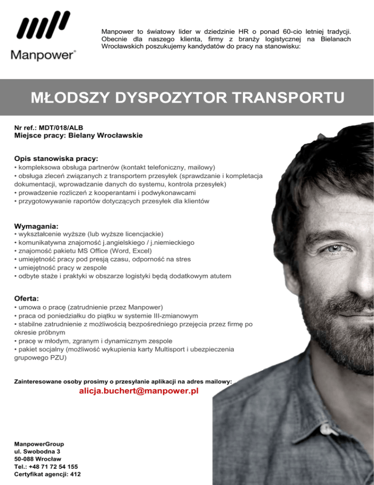 Manpower to światowy lider w dziedzinie HR o ponad 60-cio letniej tradycji. Obecnie dla naszego klienta, firmy z branży logistycznej na Bielanach Wrocławskich poszukujemy kandydatów do pracy na stanowisku: MŁODSZY DYSPOZYTOR TRANSPORTU Nr ref.: MDT/018/ALB Miejsce pracy: Bielany Wrocławskie Opis stanowiska pracy: • kompleksowa obsługa partnerów (kontakt telefoniczny, mailowy) • obsługa zleceń związanych z transportem przesyłek (sprawdzanie i kompletacja dokumentacji, wprowadzanie danych do systemu, kontrola przesyłek) • prowadzenie rozliczeń z kooperantami i podwykonawcami • przygotowywanie raportów dotyczących przesyłek dla klientów Wymagania: • wykształcenie wyższe (lub wyższe licencjackie) • komunikatywna znajomość j.angielskiego / j.niemieckiego • znajomość pakietu MS Office (Word, Excel) • umiejętność pracy pod presją czasu, odporność na stres • umiejętność pracy w zespole • odbyte staże i praktyki w obszarze logistyki będą dodatkowym atutem Oferta: • umowa o pracę (zatrudnienie przez Manpower) • praca od poniedziałku do piątku w systemie III-zmianowym • stabilne zatrudnienie z możliwością bezpośredniego przejęcia przez firmę po okresie próbnym • pracę w młodym, zgranym i dynamicznym zespole • pakiet socjalny (możliwość wykupienia karty Multisport i ubezpieczenia grupowego PZU) Zainteresowane osoby prosimy o przesyłanie aplikacji na adres mailowy: [email protected] ManpowerGroup ul. Swobodna 3 50-088 Wrocław Tel.: +48 71 72 54 155 Certyfikat agencji: 412