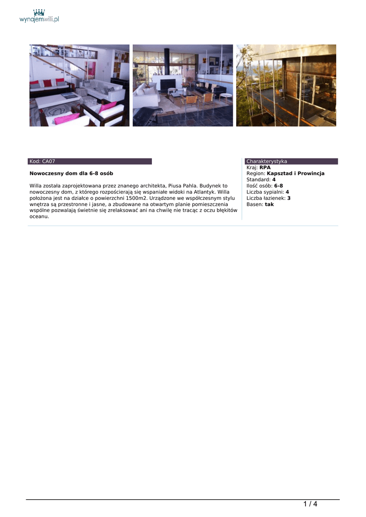 Kod: CA07 Nowoczesny dom dla 6-8 osób Willa została zaprojektowana przez znanego architekta, Piusa Pahla. Budynek to nowoczesny dom, z którego rozpościerają się wspaniałe widoki na Atlantyk. Willa położona jest na działce o powierzchni 1500m2. Urządzone we współczesnym stylu wnętrza są przestronne i jasne, a zbudowane na otwartym planie pomieszczenia wspólne pozwalają świetnie się zrelaksować ani na chwilę nie tracąc z oczu błękitów oceanu. Charakterystyka Kraj: RPA Region: Kapsztad i Prowincja Standard: 4 Ilość osób: 6-8 Liczba sypialni: 4 Liczba łazienek: 3 Basen: tak 1/4 Zakwaterowanie: Do dyspozycji gości jest główna sypialnia dwuosobowa z łazienką i garderobą oraz trzy inne sypialnie dwuosobowe, dwie łazienki - jedna z wanną, a jedna z prysznicem, toaleta dla gości, salon z kominkiem i wyjściem na przestronny balkon, jadalnia ze stołem na 12 osób, wyodrębniony salonik TV, nowocześnie wyposażona kuchnia, pokój gier z telewizorem, barkiem i wyjściem na taras. Wyposażenie: Telewizory LCD z telewizją HD, DVD, kino domowe, kuchenka AEG, lodówka, pralko-suszarka, kuchenka mikrofalowa, grill, basen z morską wodą, parasole i leżaki, 2 zadaszone miejsca parkingowe, automatycznie otwierana brama, system alarmowy, intercom. Lokalizacja: Bantry Bay, Cape Town Dodatkowe usługi: Willa jest codziennie sprzątana. Cena za tydzień wynajmu: Na zapytanie 2/4 3/4 4/4 Powered by TCPDF (www.tcpdf.org)