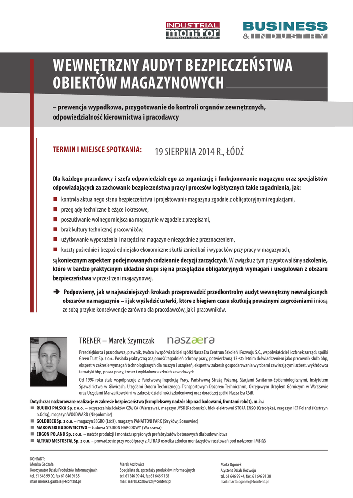 WEWNĘTRZNY AUDYT BEZPIECZEŃSTWA OBIEKTÓW MAGAZYNOWYCH – prewencja wypadkowa, przygotowanie do kontroli organów zewnętrznych, odpowiedzialność kierownictwa i pracodawcy TERMIN I MIEJSCE SPOTKANIA: 19 SIERPNIA 2014 R., ŁÓDŹ Dla każdego pracodawcy i szefa odpowiedzialnego za organizację i funkcjonowanie magazynu oraz specjalistów odpowiadających za zachowanie bezpieczeństwa pracy i procesów logistycznych takie zagadnienia, jak: n n n n n n kontrola aktualnego stanu bezpieczeństwa i projektowanie magazynu zgodnie z obligatoryjnymi regulacjami, przeglądy techniczne bieżące i okresowe, poszukiwanie wolnego miejsca na magazynie w zgodzie z przepisami, brak kultury technicznej pracowników, użytkowanie wyposażenia i narzędzi na magazynie niezgodnie z przeznaczeniem, koszty pośrednie i bezpośrednie jako ekonomiczne skutki zaniedbań i wypadków przy pracy w magazynach, są koniecznym aspektem podejmowanych codziennie decyzji zarządczych. W związku z tym przygotowaliśmy szkolenie, które w bardzo praktycznym układzie skupi się na przeglądzie obligatoryjnych wymagań i uregulowań z obszaru bezpieczeństwa w przestrzeni magazynowej. â Podpowiemy, jak w najważniejszych krokach przeprowadzić przedkontrolny audyt wewnętrzny newralgicznych obszarów na magazynie – i jak wyśledzić usterki, które z biegiem czasu skutkują poważnymi zagrożeniami i niosą ze sobą przykre konsekwencje zarówno dla pracodawców, jak i pracowników. TRENER – Marek Szymczak Przedsiębiorca i pracodawca, prawnik, twórca i współwłaściciel spółki Nasza Era Centrum Szkoleń i Rozwoju S.C., współwłaściciel i członek zarządu spółki Green Trust Sp. z o.o.. Posiada praktyczną znajomość zagadnień ochrony pracy, potwierdzoną 13-sto letnim doświadczeniem jako pracownik służb bhp, ekspert w zakresie wymagań technologicznych dla maszyn i urządzeń, ekspert w zakresie gospodarowania wyrobami zawierającymi azbest, wykładowca tematyki bhp, prawa pracy, trener i wykładowca szkoleń zawodowych. Od 1998 roku stale współpracuje z Państwową Inspekcją Pracy, Państwową Strażą Pożarną, Stacjami Sanitarno-Epidemiologicznymi, Instytutem Spawalnictwa w Gliwicach, Urzędami Dozoru Technicznego, Transportowym Dozorem Technicznym, Okręgowym Urzędem Górniczym w Warszawie oraz Urzędami Marszałkowskimi w zakresie działalności szkoleniowej oraz doradczej spółki Nasza Era CSiR. Dotychczas nadzorowane realizacje w zakresie bezpieczeństwa (kompleksowy nadzór bhp nad budowami, frontami robót), m.in.: n RUUKKI POLSKA Sp. z o.o. – oczyszczalnia ścieków CZAJKA (Warszawa), magazyn JYSK (Radomsko), blok elektrowni STORA ENSO (Ostrołęka), magazyn ICT Poland (Kostrzyn n.Odrą), magazyn WOODWARD (Niepołomice) n GOLDBECK Sp. z o.o. – magazyn SEGRO (Łódź), magazyn PANATTONI PARK (Stryków, Sosnowiec) n MAKOWSKI BUDOWNICTWO – budowa STADION NARODOWY (Warszawa) n ERGON POLAND Sp. z o.o. – nadzór produkcji i montażu sprężonych prefabrykatów betonowych dla budownictwa n ALTRAD MOSTOSTAL Sp. z o.o. – prowadzenie przy współpracy z ALTRAD ośrodka szkoleń montażystów rusztowań pod nadzorem IMBiGS KONTAKT: Monika Gadzała Koordynator Działu Produktów Informacyjnych tel. 61 646 99 00, fax 61 646 91 38 mail: [email protected] Marek Kozłowicz Specjalista ds. sprzedaży produktów informacyjnych tel. 61 646 99 44, fax 61 646 91 38 mail: [email protected] Marta Ogonek Asystent Działu Rozwoju tel. 61 646 99 44, fax. 61 646 91 38 mail: [email protected] PROGRAM SZKOLENIA: Obowiązki uczestników procesów logistycznych w obszarze bezpieczeństwa obiektów magazynowych n Podstawy prawne – obowiązkowe regulacje dla pracodawcy i pracowników: stan prawny na lipiec 2014 r. n Szkolenia i kwalifikacje pracowników (bhp, kwalifikacje zawodowe, szczególne przeciwwskazania zdrowotne) n Analiza ryzyka zawodowego i identyfikacja zagrożeń (ocena ryzyka) n Wymagane procedury i instrukcje (bhp, ochrona przeciwpożarowa) n Składowanie materiałów niebezpiecznych Właściwa organizacja pracy w procesach logistyki wewnątrzzakładowej n Środki ochrony zbiorowej i indywidualnej – „checklista” n Środki zabezpieczenia dla pracowników (odzież, narzędzia i in.) n Oznakowanie przestrzeni magazynowej n Wypadki przy pracy (postępowanie powypadkowe, odpowiedzialność) n Odpowiedzialność prawna i materialna pracowników n Odpowiedzialność prawna osób kierujących pracownikami Organizacja procesu składowania, transportowania oraz przemieszczania ładunków n Instrukcje magazynowania i transportu wewnątrzzakładowego – przygotowanie i dostępność n Regały magazynowe (montaż, eksploatacja, kontrole) n Minimalizowanie oddziaływania czynników szkodliwych, ergonomia i uproszczenie procesów manipulacji w ograniczaniu zdarzeń niebezpiecznych n Ciągi komunikacyjne i drogi transportowe – obliczanie i projektowanie możliwie bezkolizyjnych rozwiązań n Urządzenia transportowe wykorzystywanie w procesie magazynowania (wózki jezdniowe, transportery, suwnice) oraz osprzęt techniczny zwiększający ich bezpieczne użytkowanie Wyposażenie przestrzeni magazynowej zapewniające bezpieczeństwo i płynność procesów logistycznych n Dobór regałów i urządzeń transportowych do specyfiki składowanych ładunków – minimalizowanie ryzyka wystąpienia zdarzeń nieprzewidzianych n Kryteria ekonomiczne i kryteria techniczne doboru wyposażenia – jak się mają do obligatoryjnych uregulowań prawnych n Uwarunkowania architektoniczno-projektowe obiektu magazynowego zgodne z przepisami n Odpowiedzialność wyznaczonych pracowników za stan techniczny poszczególnych urządzeń n Środki ochrony indywidualnej i wyposażenie w przestrzeniach specjalnych (m.in. przestrzenie zagrożone wybuchem i in.) PROGRAM SZKOLENIA: Projektowanie i modernizacja – bezpieczeństwo jako kryterium decyzji inwestycyjnych n Projekt organizacyjno-techniczny przestrzeni magazynowej 
