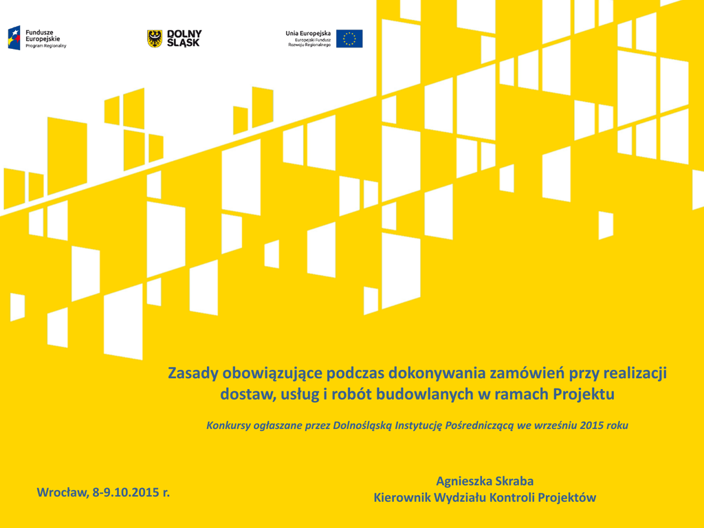 Zasady obowiązujące podczas dokonywania zamówień przy realizacji dostaw, usług i robót budowlanych w ramach Projektu Konkursy ogłaszane przez Dolnośląską Instytucję Pośredniczącą we wrześniu 2015 roku Wrocław, 8-9.10.2015 r. Agnieszka Skraba Kierownik Wydziału Kontroli Projektów Zasady udzielania zamówień Zasady obowiązujące podczas dokonywania zamówień przy realizacji dostaw, usług i robót budowlanych w ramach Projektu Podstawowymi aktami prawnymi regulującymi kwestie związane ze stosowaniem procedur dotyczących zamówień publicznych są: • ustawa z dnia 29 stycznia 2004 r. Prawo zamówień publicznych, zwana dalej ustawą PZP; • dokument pn. Wytyczne w zakresie kwalifikowalności wydatków w ramach Europejskiego Funduszu Rozwoju Regionalnego, Europejskiego Funduszu Społecznego oraz Funduszu Spójności na lata 2014-2020, zwany dalej Wytycznymi. Zasady udzielania zamówień Zasady obowiązujące podczas dokonywania zamówień przy realizacji dostaw, usług i robót budowlanych w ramach Projektu Podczas realizacji zamówień przy zakupie dostaw, usług i robót budowlanych w Projekcie, Wnioskodawca/Beneficjent zobowiązuje się do stosowania przepisów o zamówieniach publicznych w takim zakresie, w jakim ustawa PZP ma zastosowanie do Wnioskodawcy/Beneficjenta i realizowanego Projektu oraz do stosowania zaleceń zawartych w pkt. 6.5.2 Wytycznych Szczegółowe zasady udzielania zamówień Szczegółowe zasady udzielania zamówień w Projekcie, w przypadku których nie stosuje się zasad i trybów wskazanych w ustawie PZP, w zależności od rodzaju i wartości zamówienia Wnioskodawca/Beneficjent niebędący podmiotem zobowiązanym zgodnie z art. 3 ustawy PZP do jej stosowania, jak również Wnioskodawca/Beneficjent zwolniony z jej stosowania ze względu na wartość zamówienia nieprzekraczającą kwot określonych odpowiednio w art. 4 pkt. 8 oraz art. 11 ust. 8 ustawy PZP (dla zamówień sektorowych), celem wyłonienia wykonawcy na realizację zamówienia publicznego, którego wartość szacunkowa jest większa niż 50 tys. PLN netto tj. bez podatku od towarów i usług (VAT), zobowiązany jest do przeprowadzenia postępowania zgodnie z zasadą konkurencyjności opisaną w punktach 6.5.1. i 6.5.3. Wytycznych. Szczegółowe zasady udzielania zamówień W celu spełnienia zasady konkurencyjności należy: 1. Upublicznić zapytanie ofertowe na stronie internetowej wskazanej w komunikacie ministra właściwego ds. rozwoju regionalnego. Uwaga! Do czasu uruchomienia tej strony internetowej należy upublicznić zapytanie ofertowe, co najmniej na stronie internetowej beneficjenta (o ile posiada taką stronę) oraz wysłać zapytanie ofertowe do co najmniej trzech potencjalnych wykonawców (o ile na rynku istnieje trzech potencjalnych wykonawców). W przypadku podmiotów zobowiązanych zgodnie z art. 3 ustawy Pzp do jej stosowania, stosujących zasadę konkurencyjności (zamówienia poniżej 30.000 euro) dodatkową formą upublicznienia musi być strona internetowa przeznaczona do umieszczania zapytań ofertowych. W przypadku zamówień o wartości równej lub wyższej od kwot określonych w rozporządzeniu wydanym przez Prezesa Rady Ministrów na podstawie art. 11 ust.8 ustawy Pzp zapytanie ofertowe należy opublikować w Dzienniku Urzędowym UE w zakresie i terminach określonych w ustawie Pzp dla zamówień publicznych o takiej wartości. Szczegółowe zasady udzielania zamówień Zasada konkurencyjności Uwaga! Do czasu uruchomienia strony internetowej wskazanej w komunikacie ministra właściwego ds. rozwoju regionalnego. należy upublicznić zapytanie ofertowe, co najmniej na stronie internetowej beneficjenta (o ile posiada taką stronę) oraz wysłać zapytanie ofertowe do co najmniej trzech potencjalnych wykonawców (o ile na rynku istnieje trzech potencjalnych wykonawców). W przypadku podmiotów zobowiązanych zgodnie z art. 3 ustawy Pzp do jej stosowania, stosujących zasadę konkurencyjności (zamówienia poniżej 30.000 euro) dodatkową formą upublicznienia musi być strona internetowa przeznaczona do umieszczania zapytań ofertowych. Szczegółowe zasady udzielania zamówień W celu spełnienia zasady konkurencyjności należy: 3. Zapytanie ofertowe musi zawierać w szczególności: - niedyskryminacyjny opis przedmiotu zamówienia; warunki udziału w postępowaniu oraz sposób dokonywania oceny ich spełniania; kryteria oceny ofert wraz z opisem przyznawania punktacji dla danego kryterium; termin składania ofert (min.7 dni dla dostaw i usług, min.14 dni dla robót budowlanych, z wyjątkiem terminów określonych dla zamówień powyżej progów unijnych); informacja na temat wykluczenia o którym mowa w punkcie 8 Wytycznych (konflikt interesów); określenie warunków zmian umowy zawartej w wyniku przeprowadzonego postępowania o udzielenie zamówienia o ile przewiduje się możliwość zmiany takiej umowy; Szczegółowe zasady udzielania zamówień W celu spełnienia zasady konkurencyjności należy: 4. Należy wybrać najkorzystniejszą z pośród złożonych ofert w oparciu o ustalone kryteria 5. Należy sporządzić pisemny protokół postępowania o udzielnie zamówienia zawierający w szczególności: - informacje o sposobie upublicznienia postępowania ofertowego; wykaz ofert wraz z datą wpłynięcia; informację o spełnieniu warunków udziału w postępowaniu nie podleganiu/podleganiu wykluczeniu; Informację o wagach punktowych lub procentowych przypisanych do poszczególnych kryteriów oceny i sposobie przyznania punktacji poszczególnym wykonawcom; wskazanie wybranej oferty wraz z uzasadnieniem wyboru; data i podpis zamawiającego. 6. Należy upublicznić wynik postępowania na stronie internetowej wskazanej w komunikacie ministra właściwego ds. rozwoju regionalnego, a do czasu jej uruchomienia informację tą należy wysłać do każdego oferenta, który złożył ofertę oraz opublikować na własnej stronie internetowej. Szczeg