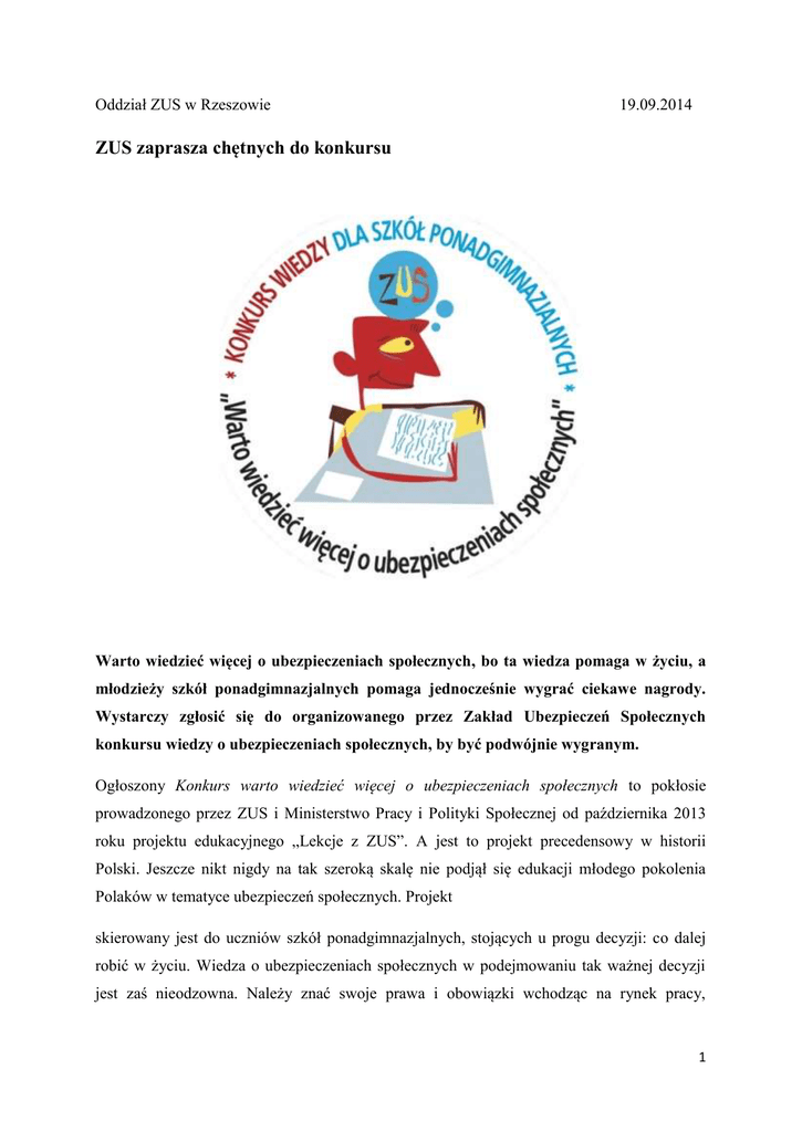 ZUS w Rzeszowie zaprasza do konkursu Konkurs warto wiedzieć