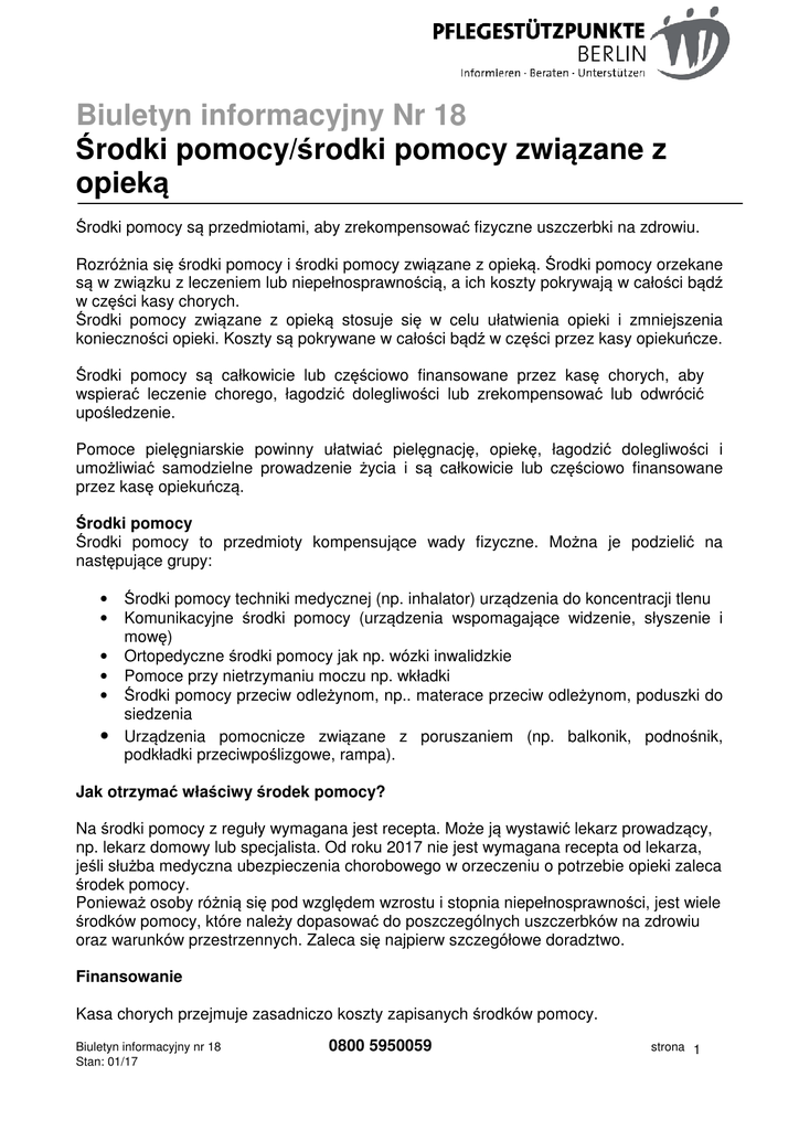 Biuletyn informacyjny Nr 18 Środki pomocy/środki pomocy związane z opieką Środki pomocy są przedmiotami, aby zrekompensować fizyczne uszczerbki na zdrowiu. Rozróżnia się środki pomocy i środki pomocy związane z opieką. Środki pomocy orzekane są w związku z leczeniem lub niepełnosprawnością, a ich koszty pokrywają w całości bądź w części kasy chorych. Środki pomocy związane z opieką stosuje się w celu ułatwienia opieki i zmniejszenia konieczności opieki. Koszty są pokrywane w całości bądź w części przez kasy opiekuńcze. Środki pomocy są całkowicie lub częściowo finansowane przez kasę chorych, aby wspierać leczenie chorego, łagodzić dolegliwości lub zrekompensować lub odwrócić upośledzenie. Pomoce pielęgniarskie powinny ułatwiać pielęgnację, opiekę, łagodzić dolegliwości i umożliwiać samodzielne prowadzenie życia i są całkowicie lub częściowo finansowane przez kasę opiekuńczą. Środki pomocy Środki pomocy to przedmioty kompensujące wady fizyczne. Można je podzielić na następujące grupy: Środki pomocy techniki medycznej (np. inhalator) urządzenia do koncentracji tlenu Komunikacyjne środki pomocy (urządzenia wspomagające widzenie, słyszenie i mowę) • Ortopedyczne środki pomocy jak np. wózki inwalidzkie • Pomoce przy nietrzymaniu moczu np. wkładki • Środki pomocy przeciw odleżynom, np.. materace przeciw odleżynom, poduszki do siedzenia • Urządzenia pomocnicze związane z poruszaniem (np. balkonik, podnośnik, podkładki przeciwpoślizgowe, rampa). • • Jak otrzymać właściwy środek pomocy? Na środki pomocy z reguły wymagana jest recepta. Może ją wystawić lekarz prowadzący, np. lekarz domowy lub specjalista. Od roku 2017 nie jest wymagana recepta od lekarza, jeśli służba medyczna ubezpieczenia chorobowego w orzeczeniu o potrzebie opieki zaleca środek pomocy. Ponieważ osoby różnią się pod względem wzrostu i stopnia niepełnosprawności, jest wiele środków pomocy, które należy dopasować do poszczególnych uszczerbków na zdrowiu oraz warunków przestrzennych. Zaleca się najpierw szczegółowe doradztwo. Finansowanie Kasa chorych przejmuje zasadniczo koszty zapisanych środków pomocy. Biuletyn informacyjny nr 18 Stan: 01/17 0800 5950059 strona 1 Na kilka środków pomocy kasy chorych uzgodniły stałe kwoty względnie ryczałty w zależności od przypadku. Przy decyzji odnośnie środka o wyższej wartości trzeba zapłacić samemu koszty wykraczające poza stałą kwotę. Ubezpieczeni od 18 muszą dopłacać do środków pomocy 10% kosztów, co najmniej 5, 00 euro i maksymalnie 10, 00 euro, jednak nie więcej niż koszty środka pomocy. Przy butach ortopedycznych płaci się dodatkowo udział za zużycie. Do środków pielęgniarskich należą: • Pomoce techniczne np. dźwig, specjalne łóżko do opieki, domowy system alarmowy • Środki pomocy do kąpieli: siedzisko pod prysznic, podnośnik do wanny • Środki pomocy do leżenia np. kliny • Pomoce dotyczące mobilności np. pomoce do obracania i przemieszczania chorego, dźwigi • Środki przeznaczone do zużycia – patrz biuletyn informacyjny nr 17 Jak otrzymać potrzebne środki pomocy związane z opieką? Środki pielęgniarskie są brane pod uwagę tylko przy opiece w domu i może je zapisać lekarz domowy lub lekarz specjalista. Warunkiem otrzymania środka pielęgniarskiego jest uznanie konieczności opieki przez kasę opiekuńczą (patrz biuletyn informacyjny nr 2) Od roku 2017 nie jest wymagana recepta od lekarza, jeśli służba medyczna ubezpieczenia chorobowego w orzeczeniu o potrzebie opieki zaleca środek pomocy. W kasie pielęgnacyjnej należy się zapytać, czy zamiast recepty wystarczy nieformalny wniosek. Finansowanie Jeśli osoba zostanie zakwalifikowana jako wymagająca opieki, kasa opiekuńcza pokrywa koszty pomocy pielęgniarskich związanych z opieką. Za techniczne środki pomocy związane z opieką osoby wymagające opieki w wieku powyżej 18 lat płacą z reguły 10% kosztów, maksymalnie jednak 25 euro. Również w przypadku środków pomocy związanych z opieką należy zasięgnąć odpowiedniej porady. Jeśli kasa opiekuńcza lub kasa chorych nie pokrywa kosztów lub nie orzeczono jeszcze stopnia ograniczenia samodzielności, techniczne środki pomocy (związane z opieką) można wypożyczyć za opłatą w placówkach rehabilitacyjnych. Służymy Państwu radą i udzielamy informacji w poradni opieki www.pflegestuetzpunkteberlin.de Poradnie opieki w Berlinie są finansowane przez berlińskie kasy opiekuńcze i kraj związkowy Berlin Biuletyn informacyjny nr 18 Stan: 01/17 0800 5950059 strona 2