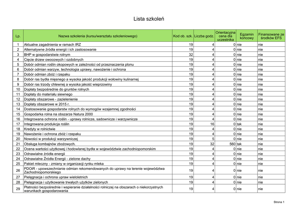 Lista szkoleń Lp. 1 2 3 4 5 6 7 8 9 10 11 12 13 14 15 16 17 18 19 20 21 22 23 24 25 26 27 28 29 Nazwa szkolenia (kursu/warsztatu szkoleniowego) Aktualne zagadnienia w ramach IRZ Alternatywne źródła energii i ich zastosowanie BHP w gospodarstwie rolnym Cięcie drzew owocowych i ozdobnych Dobór odmian roślin okopowych w zależności od przeznaczenia plonu Dobór odmian warzyw, technologia uprawy, nawożenie i ochrona Dobór odmian zbóż i rzepaku Dobór ras bydła mięsnego a wysoka jakość produkcji wołowiny kulinarnej Dobór ras trzody chlewnej a wysoka jakość wieprzowiny Dopłaty bezpośrednie do gruntów rolnych Dopłaty do materiału siewnego Dopłaty obszarowe - zazielenienie Dopłaty obszarowe w 2015 r. Dostosowanie gospodarstw rolnych do wymogów wzajemnej zgodności Gospodarka rolna na obszarze Natura 2000 Integrowana ochrona roślin - uprawy rolnicze, sadownicze i warzywnicze Integrowana produkcja roślin Kredyty w rolnictwie Nawożenie i ochrona zbóż i rzepaku Nowości w produkcji warzywniczej Obsługa kombajnów zbożowych. Ocena wartości użytkowej i hodowlanej bydła w województwie zachodniopomorskim Odnawialne źródła energii Odnawialne Źródła Energii - zielone dachy Pakiet mleczny - zmiany w organizacji rynku mleka PDOiR - upowszechnianie odmian rekomendowanych do uprawy na terenie województwa Zachodniopomorskiego Pielęgnacja i ochrona upraw wieloletnich Pielęgnacja i użytkowanie trwałych użytków zielonych Płatności bezpośrednie i wspieranie działalności rolniczej na obszarach o niekorzystnych warunkach gospodarowania Kod ob. szk. Liczba godz. 19 19 32 19 19 19 19 19 19 19 19 19 19 19 19 19 19 19 19 19 19 19 19 19 19 4 4 4 4 4 4 4 4 4 4 4 4 4 4 4 4 16 4 4 5 32 4 4 4 4 19 Orientacyjna cena dla uczestnika 0 0 0 0 0 0 0 0 0 0 0 0 0 0 0 0 0 0 0 0 560 0 0 0 0 Egzamin końcowy Finansowane ze środków EFS nie nie nie nie nie nie nie nie nie nie nie nie nie nie nie nie tak nie nie nie tak nie nie nie nie nie nie nie nie nie nie nie nie nie nie nie nie nie nie nie nie nie nie nie nie nie nie nie nie nie 4 0 nie nie 19 19 4 4 0 nie 0 nie nie nie 19 4 0 nie nie Strona 1 30 31 32 33 34 35 36 37 38 39 40 41 42 43 44 45 46 47 48 49 50 51 52 53 54 55 56 57 Płatności dla rolników kwalifikujących się do wsparcia w ramach systemu dla małych gospodarstw (przekazywanie małych gospodarstw - płatności dla rolników) Podniesienie wiedzy doradców w zakresie zasad prowadzenia książek rachunkowych PLFADN Pokazy nowoczesnych technologii Procedury obowiązujące gospodarstwa rolne w zakresie szacowania strat w wyniku klęsk Produkcja zwierzęca w gospodarstwie ekologicznym Produkt tradycyjny i regionalny Produkty tradycyjne i regionalne - uregulowania formalno-prawne Program Rozwoju Obszarów Wiejskich 2014-2020 - cele i priorytety Prowadzenie dokumentacji w gospodarstwie ekologicznym Prowadzenie działalności agroturystycznej Przetwórstwo na poziomie gospodarstwa rolnego warunkiem dywersyfikacji dochodu rodzin rolniczych (zboża, owoce, mięso i mleko) oraz podstawy sprzedaży bezpośredniej Rolnictwo ekologiczne po 2014 roku Sprzedaż bezpośrednia produktów zwierzęcych Sprzedaż bezpośrednia w gospodarstwie ekologicznym - produkty produkcji podstawowej, przetwórstwo Sprzedaż bezpośrednia w gospodarstwie rolnym - produkty produkcji podstawowej, przetwórstwo System opodatkowania działalności rolniczej w tym: - podatek dochodowy, podatek VAT, podatek z działów specjalnych produkcji rolnej, zwrot podatku akcyzowego za olej napędowy System opodatkowania działalności rolniczej w tym: - podatek rolny, podatek leśny, podatek od nieruchomości i inne Szkody łowieckie Szkolenie w zakresie doradztwa dotyczącego środków ochrony roślin - szkolenie podstawowe Szkolenie w zakresie doradztwa dotyczącego środków ochrony roślin - szkolenie uzupełniające Szkolenie w zakresie środków ochrony roślin sprzętem naziemnym, z wyłączeniem sprzętu montowanego na pojazdach szynowych oraz innego sprzętu stosowanego w kolejnictwie szkolenie podstawowe Szkolenie w zakresie środków ochrony roślin sprzętem naziemnym, z wyłączeniem sprzętu montowanego na pojazdach szynowych oraz innego sprzętu stosowanego w kolejnictwie szkolenie uzupełniające Technologia produkcji ziemniaków jadalnych i przemyslowych Technologia uprawy i ochrona roślin bobowych, strączkowych i mieszanek z trawami Technologia uprawy i wykorzystanie roślin energetycznych Technologia uprawy roślin okopowych Technologia uprawy zbóż i rzepaku Ubezpieczenia w gospodarstwach rolnych 19 4 0 nie nie 19 8 0 nie nie 19 19 19 19 19 19 19 25 4 4 4 4 4 4 4 16 19 0 0 0 0 0 0 0 260 nie nie nie nie nie nie nie nie nie nie nie nie nie nie nie nie 16 0 nie nie 19 19 4 4 0 nie 0 nie nie nie 19 4 0 nie nie 19 4 0 nie nie 19 4 0 nie nie 19 4 0 nie nie 19 19 4 24 0 nie 320 tak nie nie 19 7 280 tak nie 19 14 180 tak nie 19 7 150 tak nie 19 19 19 19 19 19 4 4 4 4 4 4 0 0 0 0 0 0 nie nie nie nie nie nie nie nie nie nie nie nie Strona 2 58 59 60 61 62 63 64 65 66 67 68 69 Ubój i produkcja mięsa na użytek własny Uczestnictwo rolników w systemach jakości żywności Wapnowanie, stosowanie nawozów organicznych, użyźniaczy i poplonów w procesie poprawy jakości gleby Współczesna rola i znaczenie źródeł energii odnawialnej oraz pozyskanie środków finansowych na ten cel Zagroda edukacyjna - propozycja dla gospodarstw rolnych Założenia programu rolnośrodowiskowego na lata 2014-2020 Zarządzanie gospodarstwem rolnym ze szczególnym uwzględnieniem korzyści z prowadzenia rachunkowości w gospodarstwie rolnym Zasady prowadzenia upraw rolniczych, warzywniczych, sadowniczych i jagodowych w gospodarstwie ekologicznym Zasady utrzymania i żywienia krów wysokomlecznych Zazielenienie w ramach WPR Zobowiązania rolników wobec Agencji Nasiennej Żywienie trzody chlewnej 19 19 4 4 0 nie 0 nie nie nie 19 4 0 nie nie 19 4 0 nie nie 19 19 4 4 0 nie 0 nie nie nie 19 16 0 nie nie 19 4 0 nie nie 19
