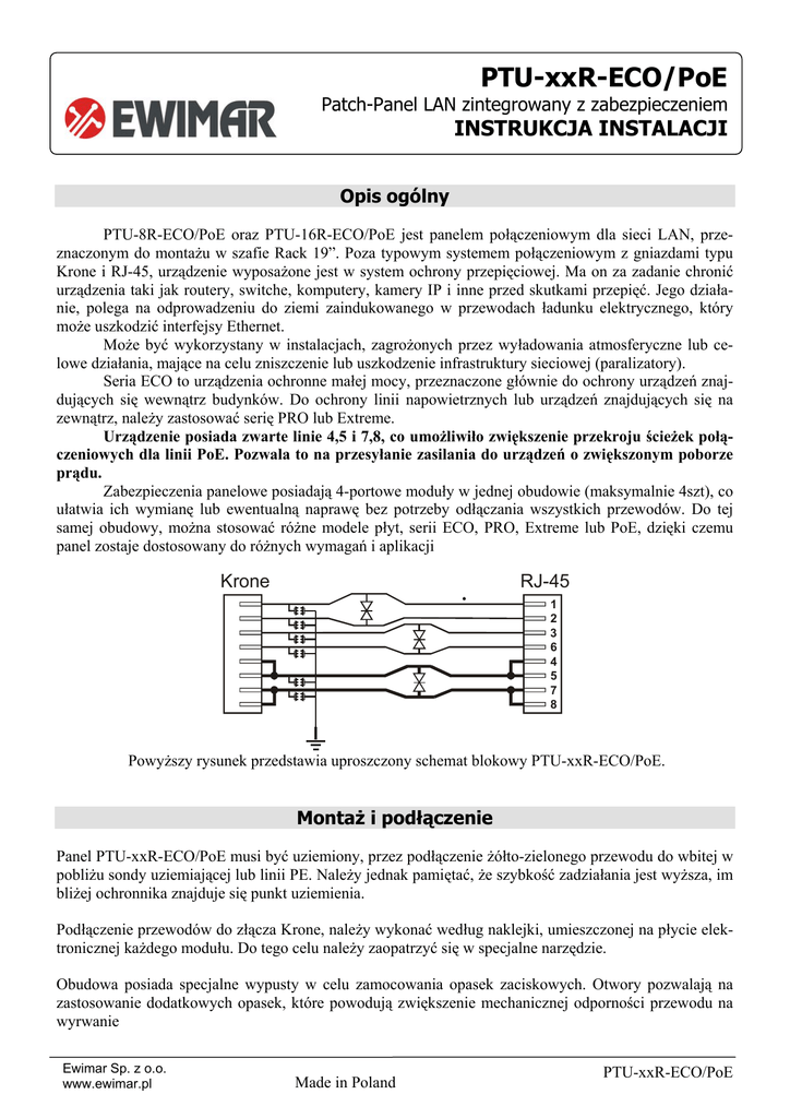 PTU-xxR-ECO/PoE Patch-Panel LAN zintegrowany z zabezpieczeniem INSTRUKCJA INSTALACJI Opis ogólny PTU-8R-ECO/PoE oraz PTU-16R-ECO/PoE jest panelem połączeniowym dla sieci LAN, przeznaczonym do montażu w szafie Rack 19”. Poza typowym systemem połączeniowym z gniazdami typu Krone i RJ-45, urządzenie wyposażone jest w system ochrony przepięciowej. Ma on za zadanie chronić urządzenia taki jak routery, switche, komputery, kamery IP i inne przed skutkami przepięć. Jego działanie, polega na odprowadzeniu do ziemi zaindukowanego w przewodach ładunku elektrycznego, który może uszkodzić interfejsy Ethernet. Może być wykorzystany w instalacjach, zagrożonych przez wyładowania atmosferyczne lub celowe działania, mające na celu zniszczenie lub uszkodzenie infrastruktury sieciowej (paralizatory). Seria ECO to urządzenia ochronne małej mocy, przeznaczone głównie do ochrony urządzeń znajdujących się wewnątrz budynków. Do ochrony linii napowietrznych lub urządzeń znajdujących się na zewnątrz, należy zastosować serię PRO lub Extreme. Urządzenie posiada zwarte linie 4,5 i 7,8, co umożliwiło zwiększenie przekroju ścieżek połączeniowych dla linii PoE. Pozwala to na przesyłanie zasilania do urządzeń o zwiększonym poborze prądu. Zabezpieczenia panelowe posiadają 4-portowe moduły w jednej obudowie (maksymalnie 4szt), co ułatwia ich wymianę lub ewentualną naprawę bez potrzeby odłączania wszystkich przewodów. Do tej samej obudowy, można stosować różne modele płyt, serii ECO, PRO, Extreme lub PoE, dzięki czemu panel zostaje dostosowany do różnych wymagań i aplikacji Krone RJ-45 1 2 3 6 4 5 7 8 Powyższy rysunek przedstawia uproszczony schemat blokowy PTU-xxR-ECO/PoE. Montaż i podłączenie Panel PTU-xxR-ECO/PoE musi być uziemiony, przez podłączenie żółto-zielonego przewodu do wbitej w pobliżu sondy uziemiającej lub linii PE. Należy jednak pamiętać, że szybkość zadziałania jest wyższa, im bliżej ochronnika znajduje się punkt uziemienia. Podłączenie przewodów do złącza Krone, należy wykonać według naklejki, umieszczonej na płycie elektronicznej każdego modułu. Do tego celu należy zaopatrzyć się w specjalne narzędzie. Obudowa posiada specjalne wypusty w celu zamocowania opasek zaciskowych. Otwory pozwalają na zastosowanie dodatkowych opasek, które powodują zwiększenie mechanicznej odporności przewodu na wyrwanie Ewimar Sp. z o.o. www.ewimar.pl Made in Poland PTU-xxR-ECO/PoE 16 x PTF-1 ECO/PoE PTU-16R-ECO/PoE Kamera IP nr 1 Switch PoE Ziemia LAN wewnątrz budynku Kamera IP nr 16 Ziemia Ziemia Przykład podłączenia z zabezpieczeniami 1-kanałowymi PTU-16R-ECO/PoE PTU-16R-ECO/PoE Switch PoE LAN wewnątrz budynku 16 x kamera IP Ziemia Ziemia Przykład podłączenia, przy wykorzystaniu dwóch paneli Rack Specyfikacja techniczna NAZWA PARAMETRU WARTOŚĆ Ilość kanałów Stopnie ochrony Pojemność linia-linia dla danych Pojemność linia-ziemia dla danych Poziom ochrony linia-linia dla danych Maksmalne napięcie Uc dla danych Maksymalna moc 8/20uS Ilość kanałów Stopnie ochrony Poziom ochrony linia-linia dla PoE 10/1000uS Maksmalne napięcie Uc dla PoE Złącze wejściowe (linia) Złącze wyjściowe Wyjście uziemiające Mocowanie Dodatkowe opcje Wymiary Temperatura pracy Linia danych 8 / 16 2 (iskrownik jonizyjący, mostek ochronny) 6-8pF @ 0V, 1Mhz < 1pF 20V-1kV, 20V @ 100A , 8/20uS Vc 6,8V 2kW Linia PoE 16 2 (iskrownik jonizyjący, transil) 600W / 100A 58V Cechy wspólne Krone - nabijane RJ-45 Tak - dla iskrowników jonizujących Szafa Rack U16", ściana Wymienne moduły różnych typów, pokrywa ochronna 480 x 41 x 130 (mm) -30~+60°C Producent zastrzega sobie prawo do zmiany specyfikacji bez wcześniejszego poinformowania. Ewimar Sp. z o.o. www.ewimar.pl Made in Poland PTU-xxR-ECO/PoE