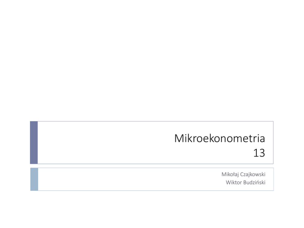 Mikroekonometria 13 Mikołaj Czajkowski Wiktor Budziński Endogeniczność – regresja liniowa W regresji liniowej estymujemy następujące równanie: Yi Xi β i Metoda Najmniejszych Kwadratów zakłada, że wszystkie zmienne objaśniające są egzogeniczne tj. E Xi i 0 Jeżeli ten warunek jest niespełniony mówimy o endogeniczności zmiennych objaśniających Złamanie tego założenia ma poważne konsekwencje – estymator MNK przestaje być zgodny! Może wynikać z różnych przyczyn: Korelacja ze zmienną pominiętą Sprzężenie zwrotne między zmienna objaśnianą i objaśniającą czaj.org Metoda zmiennych instrumentalnych W tej metodzie niezbędne jest znalezienie tzw. zmiennych instrumentalnych, które mają tę własność, że są silnie skorelowane ze zmienną, którą podejrzewamy o endogeniczność, ale nie są skorelowane z błędem losowym. Często nie jest to zadanie łatwe. Podstawowym estymatorem jest tzw. Dwustopniowa Metoda Najmniejszych Kwadratów (2MNK) czaj.org Dwustopniowa Metoda Najmniejszych Kwadratów W pierwszym kroku liczymy regresję, w której wyjaśniamy wszystkie zmienne z podstawowego modelu zmiennymi instrumentalnymi. 1 ZZ ZX B Gdzie wśród zmiennych instrumentalnych mogą być Z egzogeniczne zmienne z X W drugim kroku wyjaśniamy przy użyciu wartości Y ZB dopasowanych z pierwszych regresji : X 1 β 2MNK X X X Y Estymator jest zgodny jeżeli instrumenty są nieskorelowane z błędem losowym Aby model skonwergował potrzebujemy co najmniej tyle samo zmiennych instrumentalnych co zmiennych endogenicznych czaj.org Przykład – wydatki na leki 1. 2. 3. 2SLS Wczytaj zbiór danych me.medexp3.lpj Przeprowadź zwykłą regresję liniową, w której logarytm wydatków na leki jest objaśniany przez to czy ktoś posiada dodatkowe ubezpieczenie od pracodawcy (hi_empun), liczbę chorób chronicznych (totchr), wiek (age), płeć (female), kolor skóry (blhisp) oraz logarytm dochodu (lhinc) Porównaj wyniki z estymatorem 2MNK, gdzie zmienna hi_empun jest endogeniczna, a jako instrument wykorzystana jest zmienna ssiratio. ; lhs = ... ; rhs = ... ; inst = lista zmiennych instrumentalnych $ czaj.org Przykład – wydatki na leki cd. 4. 5. Sprawdź czy wykorzystane instrumenty są dobrymi predyktorami zmiennej hi_empun. Porównaj wyniki z modelem, w którym wykorzystane są 3 dodatkowe instrumenty: firmsz, lowincom i multlc. czaj.org Testowanie endogeniczności W NLOGIT dostępne są dwa testy na endogeniczność 1. Test Hausmana Analogiczny do tego, którego używaliśmy do testowania hipotezy o IIA w wielomianowym modelu logitowym H0: endogeniczność nie występuje Test przeprowadza się porównując oszacowania parametrów w MNK i 2MNK. 2 Statystyka ma rozkład z liczbą stopni swobody równą liczbie endogenicznych zmiennych w modelu. czaj.org Testowanie endogeniczności Test Wu 2. H0: endogeniczność nie występuje Statystyka testowa: ssOLS ss AUGEMENTED K 2 F K 2 , n K1 2 K 2 ss AUGEMENTED n K1 2 K 2 ssOLS oznacza sumę kwadratów z podstawowej regresji liniowej ss AUGEMENTED oznacza sumę kwadratów z regresji, w której jako dodatkowe zmienne uwzględnione są reszty z regresji zmiennych endogenicznych na instrumentach K1 , K 2 to odpowiednio liczba zmiennych egzogenicznych i endogenicznych Statystyka ma rozkład F czaj.org Przykład – wydatki na leki cd. 6. REGR Przeprowadź testy Hausmana i Wu dla analizowanego modelu ; ; ; ; lhs = ... rhs = ... inst = lista zmiennych instrumentalnych Wu test $ czaj.org Endogeniczność w modelach dla zmiennej binarnej Dla zmiennych nieciągłych endogeniczność jest dużo większym problemem Przy użyciu estymatora Największej Wiarygodności można zdefiniować model wielorównaniowe Dla zmiennej binarnej z jedną zmienną endogeniczną można go zdefiniować w następujący sposób: Gdzie Yi *,1 X i β Yi ,2 i Yi ,2 Z i γ i Yi*,1 to zmienna indeksowa, której nie obserwujemy Yi *,1 0 Yi ,1 to zmienna binarna, obserwowalna, równa 1 gdy oraz 0 w pozostałych przypadkach Yi ,2 to zmienna endogeniczna czaj.org Endogeniczność w modelach dla zmiennej binarnej i i Endogeniczność wynika z korelacji między oraz . W tym modelu zakładamy, że zmienne te pochodzą z dwuwymiarowego rozkładu normalnego BN 0, , gdzie 1 2 Hipotezę o endogeniczności można testować sprawdzając istotność parametru Z założenia o normalności wynika, że model należy do klasy modeli probitowych Zdefiniowanie analogicznego modelu logitowego jest trudne czaj.org Przykład – posiadanie ubezpieczenia 1. 2. 3. 4. Wczytaj zbiór danych me.insurance2.lpj Zbuduj model wyjaśniający jakie cechy wpływają na zakup dodatkowego ubezpieczenia Wykorzystaj model Probitowy z endogenicznością, aby sprawdzić czy logarytm dochodu jest zmienną endogeniczną. Jako zmienne instrumentalne wykorzystaj zmienne retire i sretire. Czy wyniki się zmieniły? Czy można policzyć model bez dodatkowych zmiennych instrumentalnych? PROBIT ; lhs = zmienna binarna, endogeniczna zmienna ciągła ; rh1 = zmienne objaśniające zmienną binarną ; rh2 = lista zmiennych instrumentalnych$ czaj.org Symulacje Symulacje są przydatnym narzędziem, które pozwala na sprawdzenie czy dany model działa tak jak powinien Pozwalają sprawdzić jakie są konsekwencje nie spełnienia wybranych założeń modelu. Przydatne kiedy dany problem jest bardzo złożony i potrzeba zaawansowanych narzędzi matematycznych, aby przeanalizować go formalnie Zazwyczaj stosowane, aby pokazać, że w pewnym określonym przypadku model źle działa Wyniki symulacji wskazujące, że model działa poprawnie nie są, niestety, dowodem jego poprawności czaj.org Symulacje Algorytm, który przeprowadza symulację w uproszczeniu wygląda tak: 1. 2. 3. 4. 5. 6. 7. Wygeneruj zmienne objaśniające z wybranych rozkładów Wygeneruj błędy losowe z odpowiednich rozkładów Wygeneruj zmienne objaśniane używając założonego procesu generującego dane Oszacuj na takich danych model o wybranej spec
